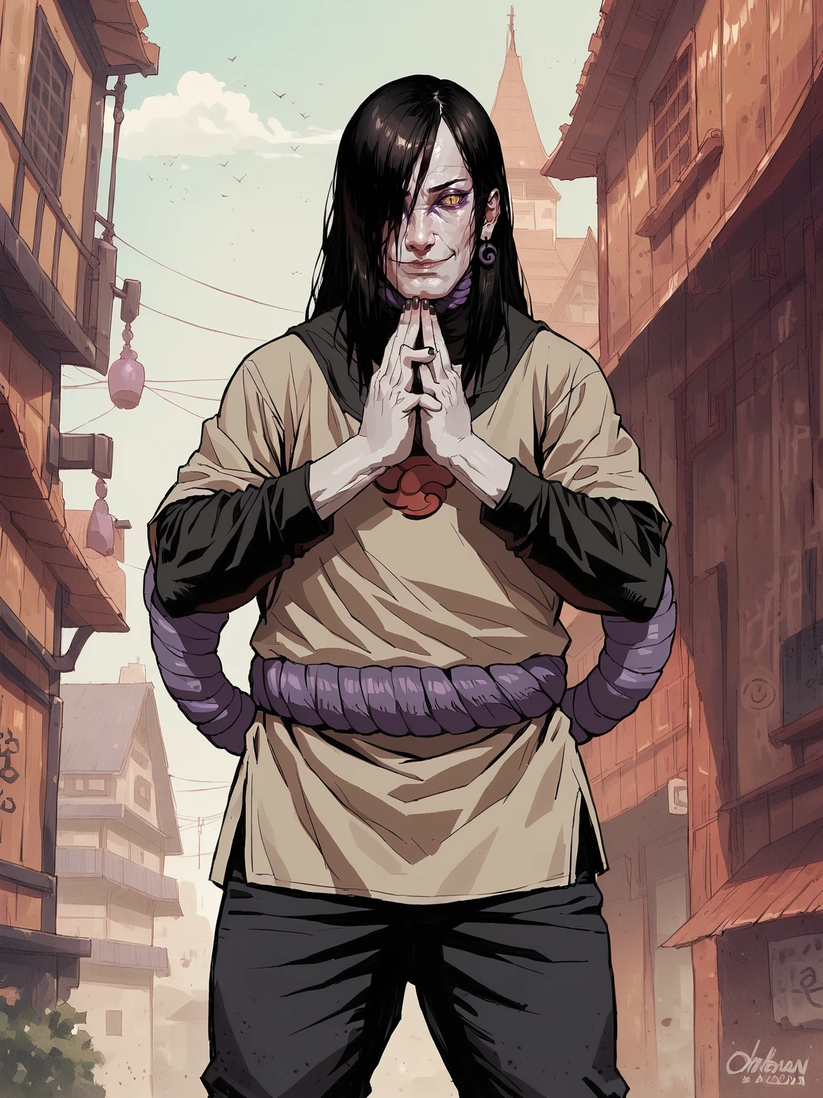 oroch1maru, yellow eyes, slit pupils, black hair, long hair, purple eyeliner, hair over one eye, pale skin,