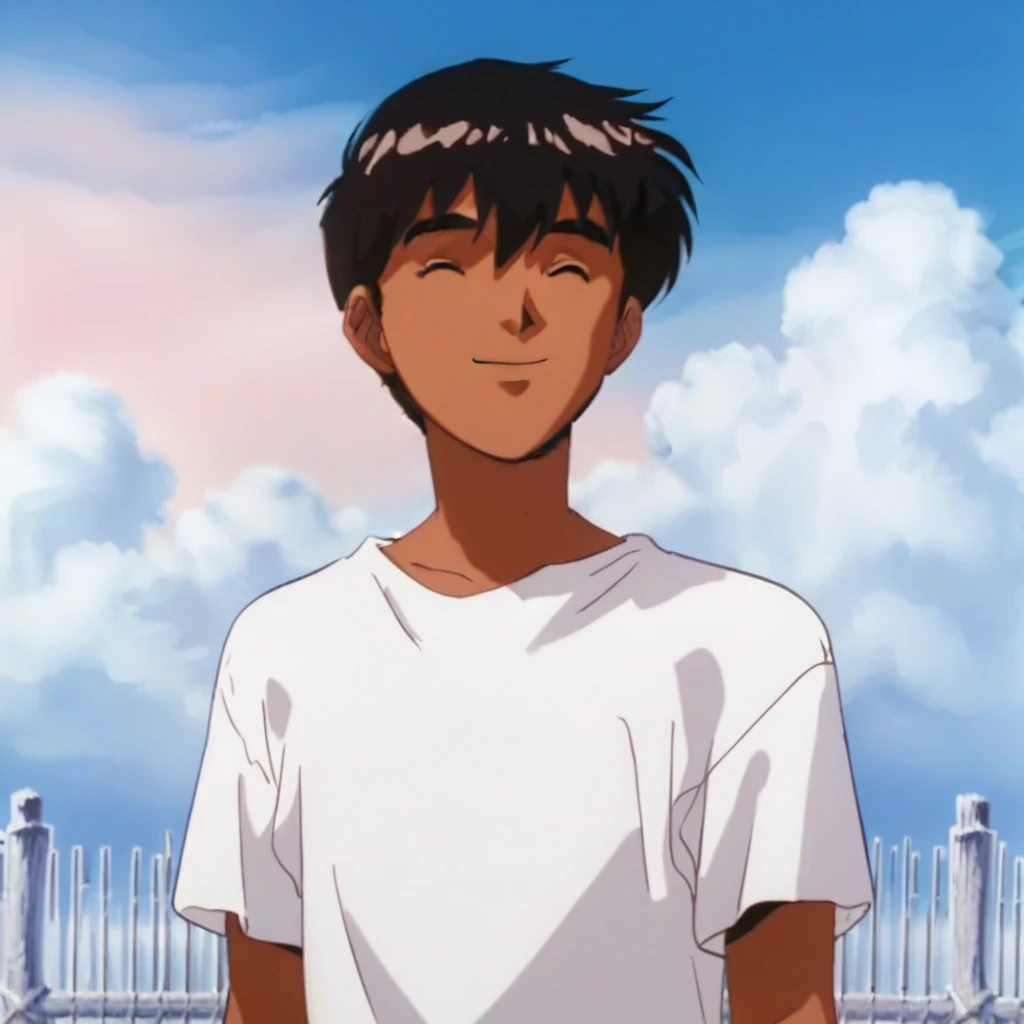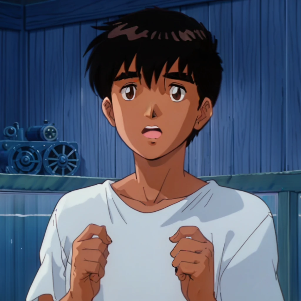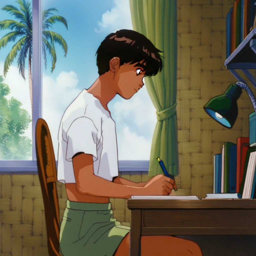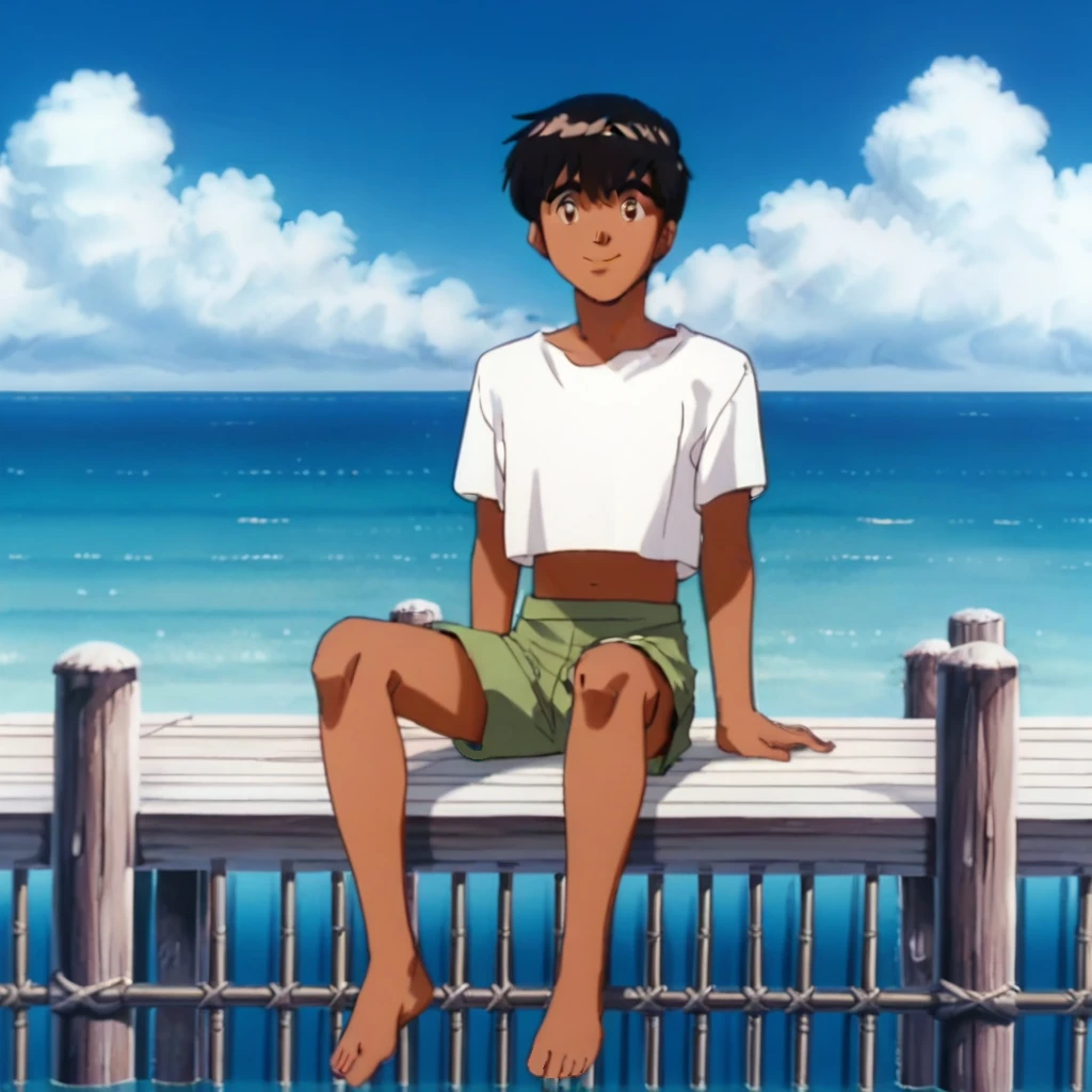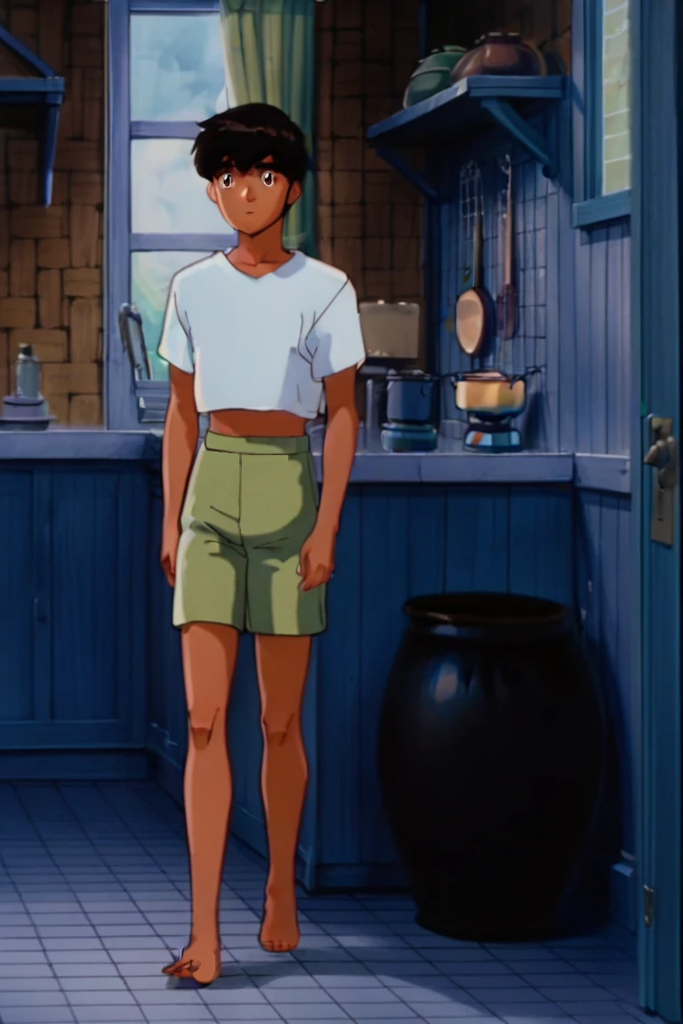 Prompts: male, dark skin, dark brown hair, brown eyes, crop top, short sleeves, midriff, green shorts, barefoot