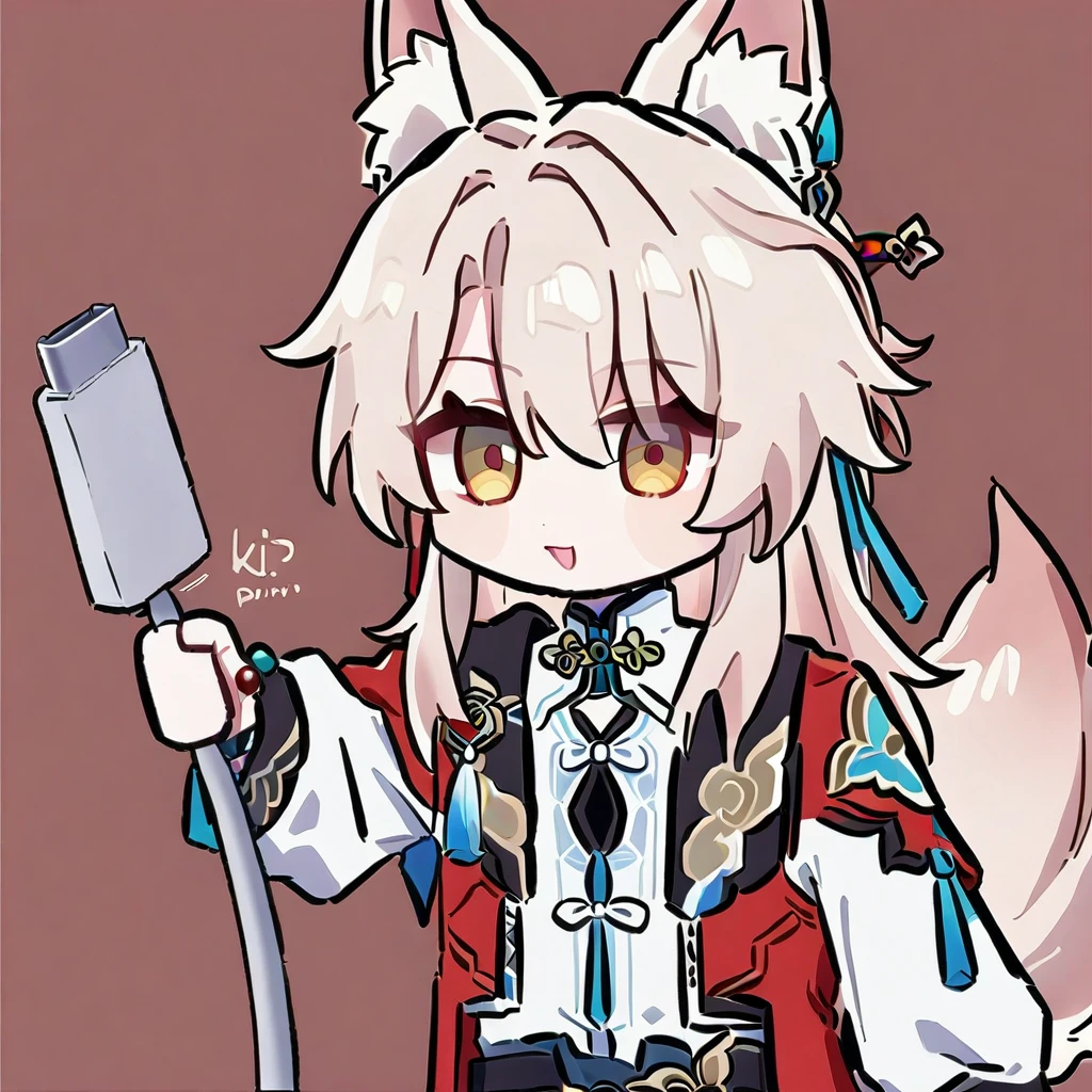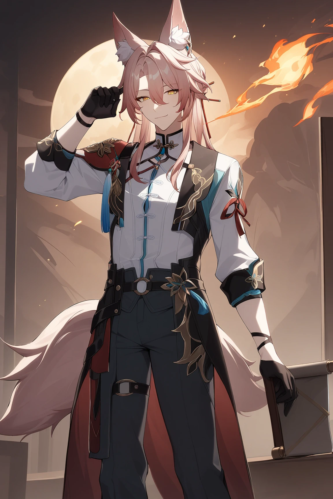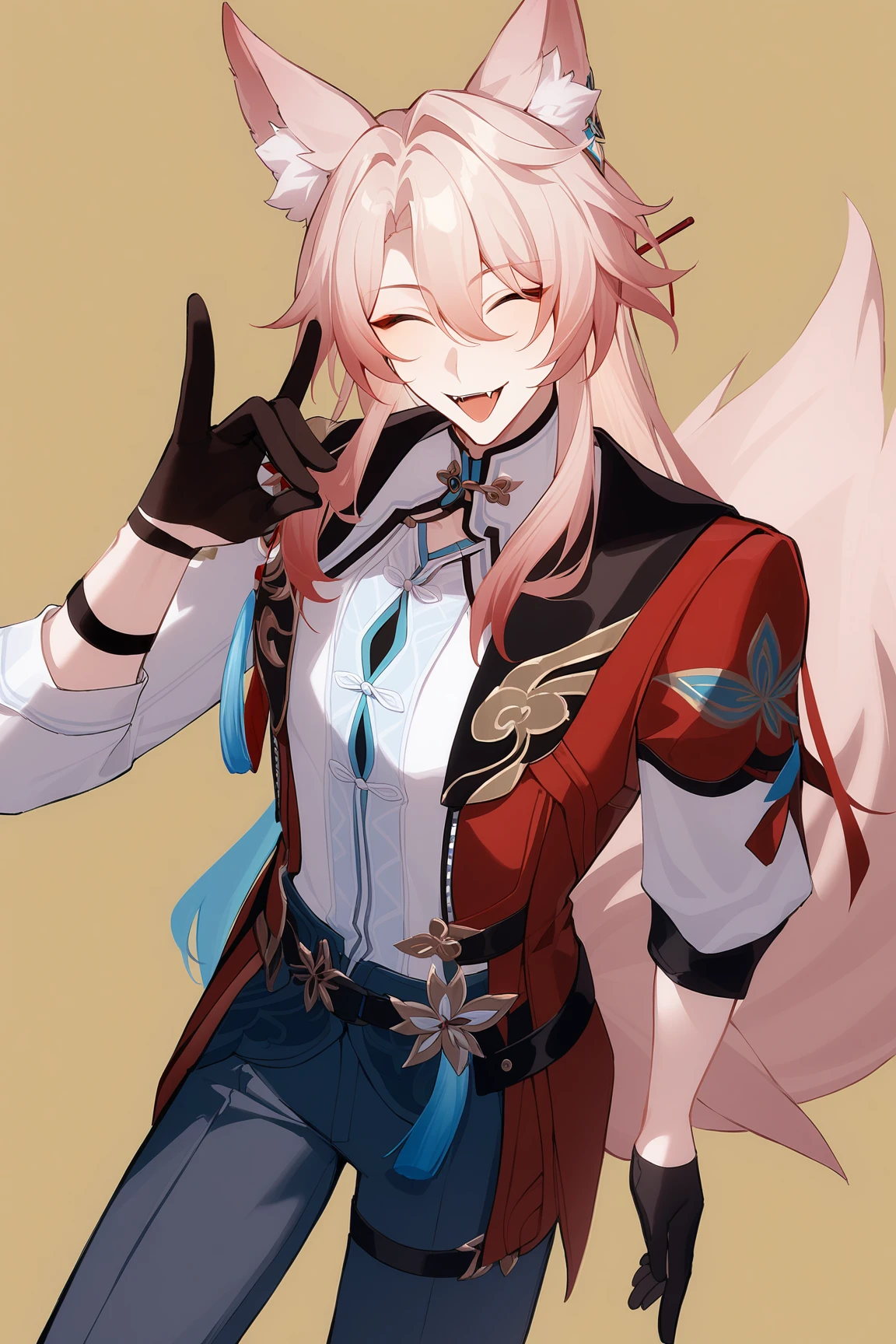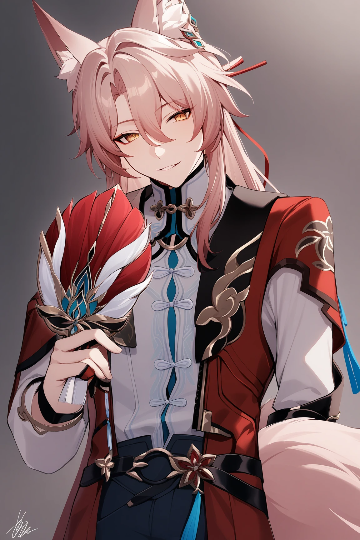 Others:;1boy, jiaoqiu_(honkai_star_rail), male_focus, solo, gloves, fox_tail, tail, looking_at_viewer, black_gloves, shirt, long_sleeves, hair_ornament, smile, white_shirt, fox_boy, jewelry, red_jacket, upper_body, animal_ear_fluff, parted_lips, chinese_clothes, fox_girl, signature, jacket, bracelet, single_glove,