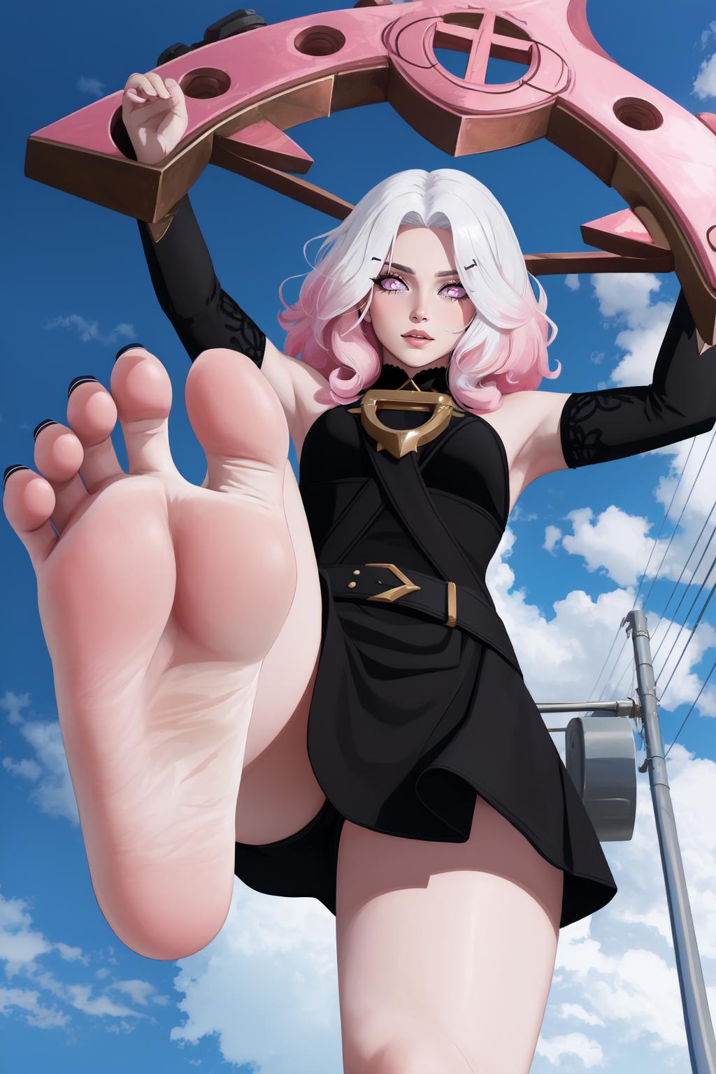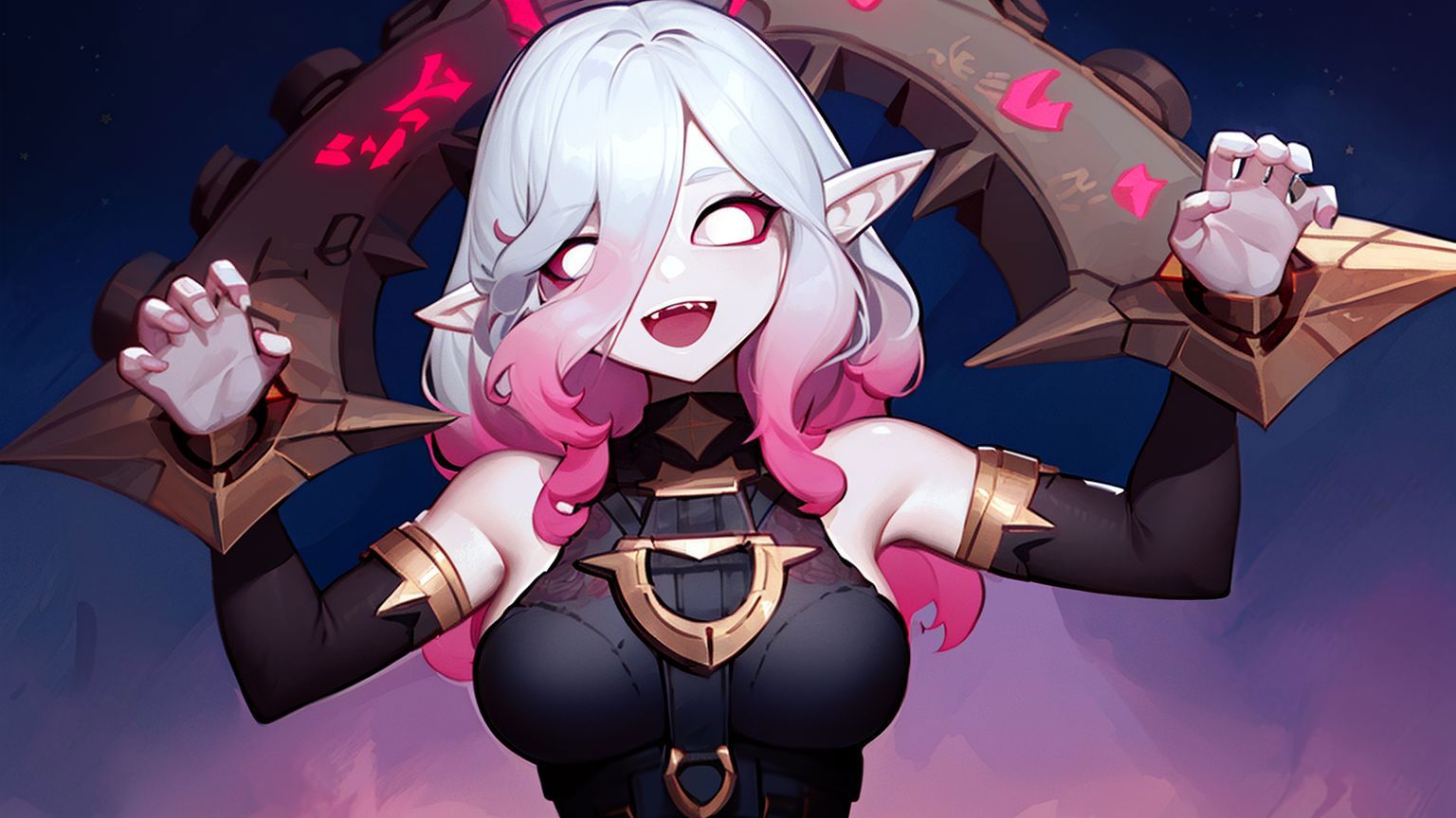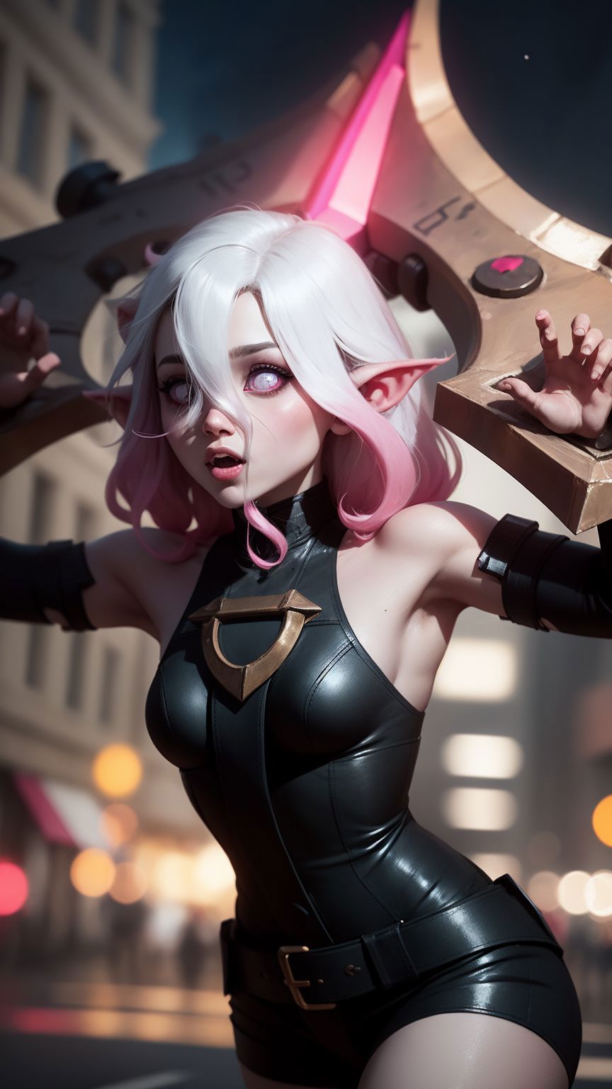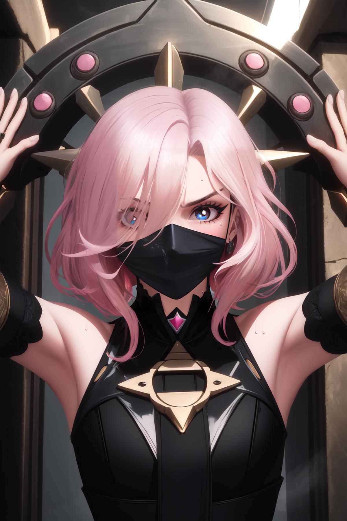 pink sclera,hands up, head shackles,black clothes,white short hair with pink streaks