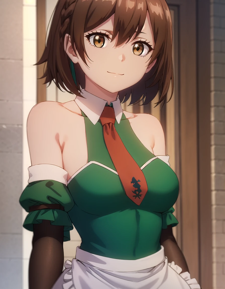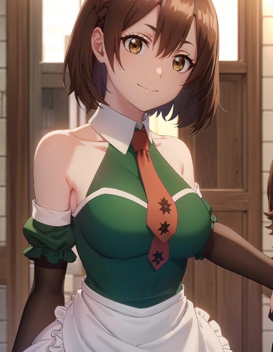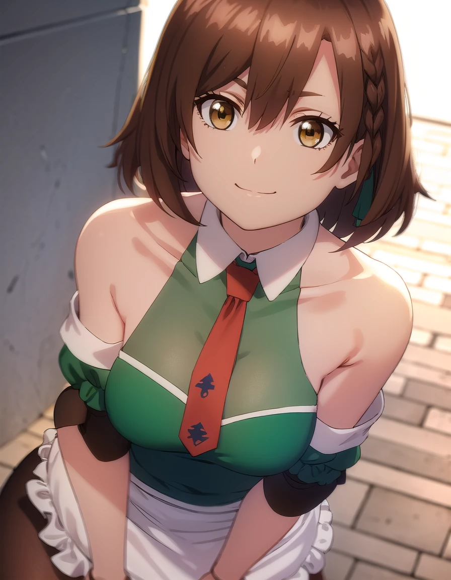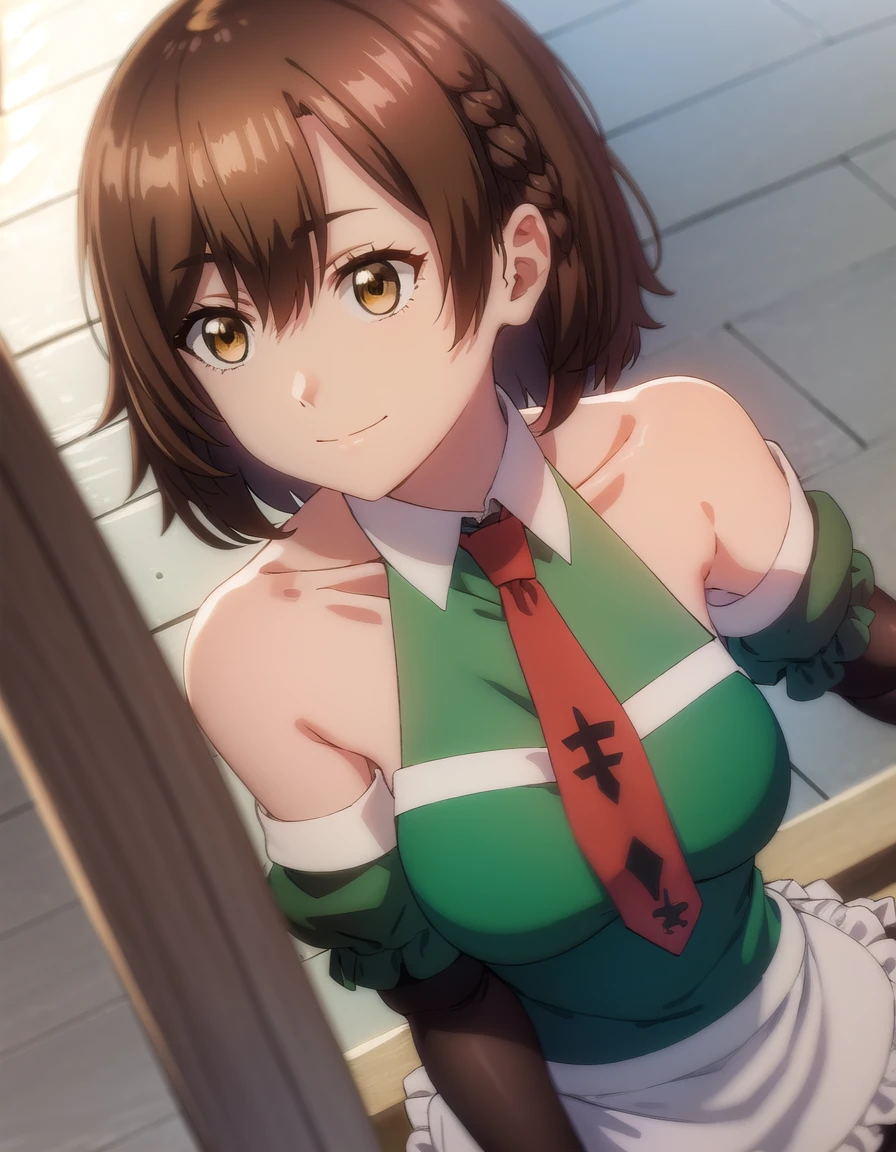 dress, bare shoulders, pantyhose, detached sleeves, necktie, apron, black pantyhose, maid, red necktie, waist apron, white apron, green dress, short necktie,