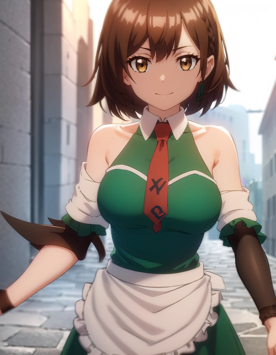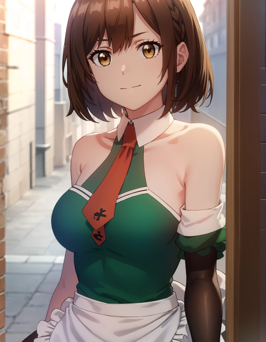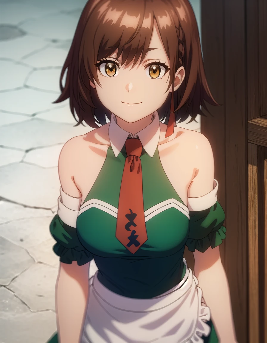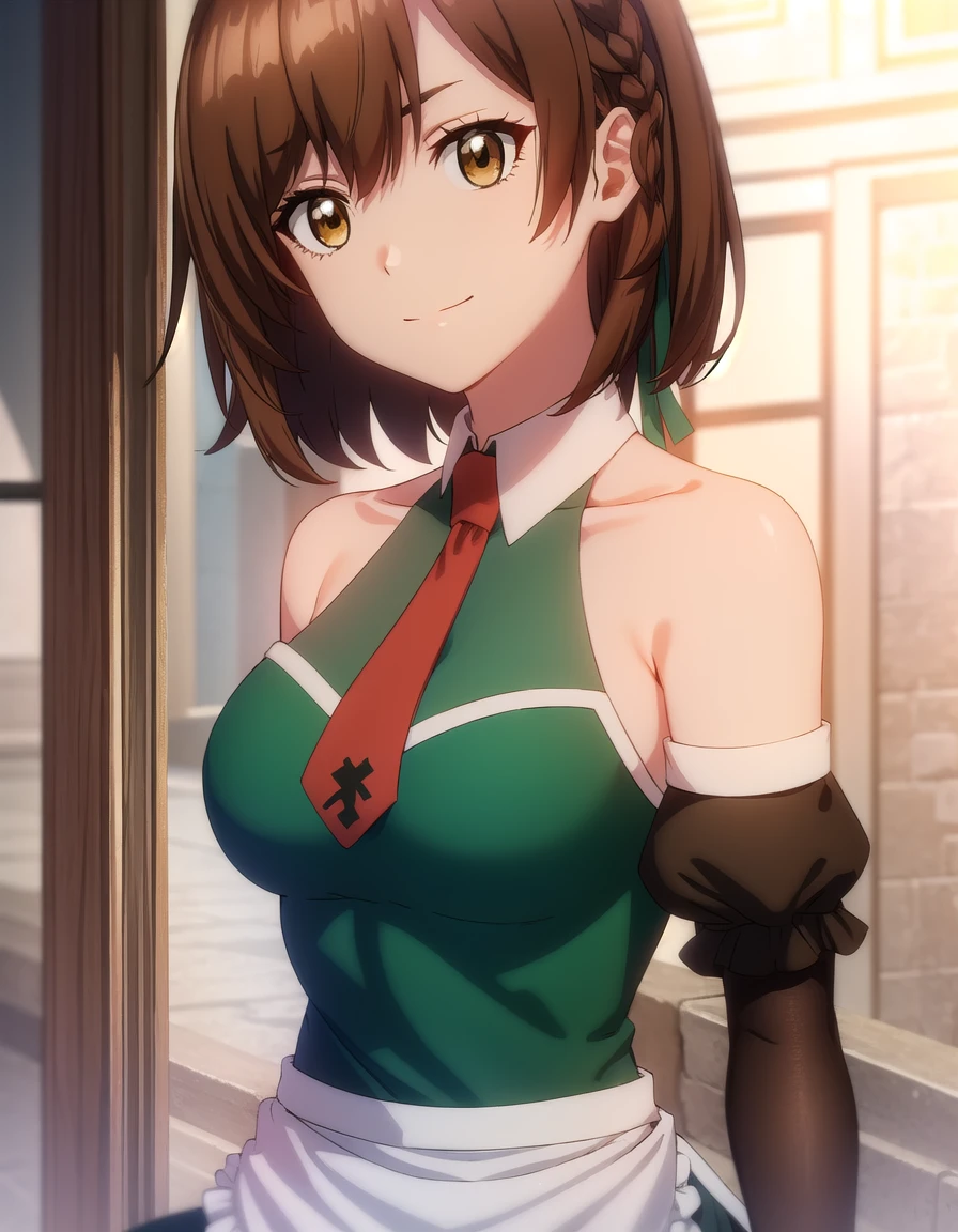 dress, bare shoulders, pantyhose, detached sleeves, necktie, apron, black pantyhose, maid, red necktie, waist apron, white apron, green dress, short necktie,