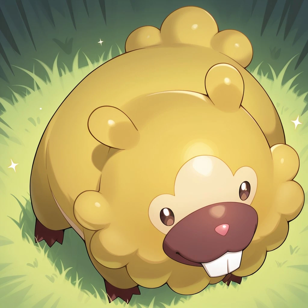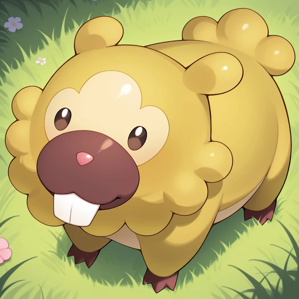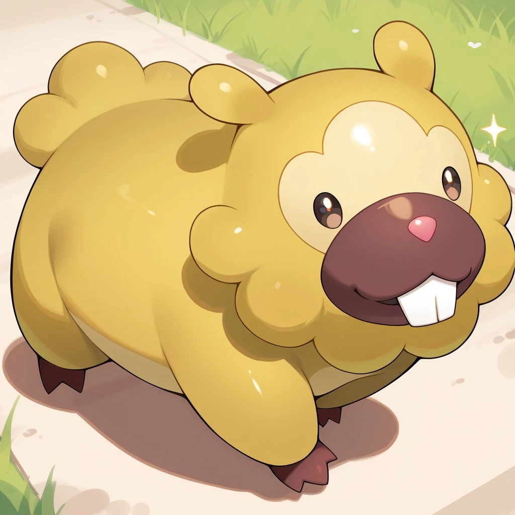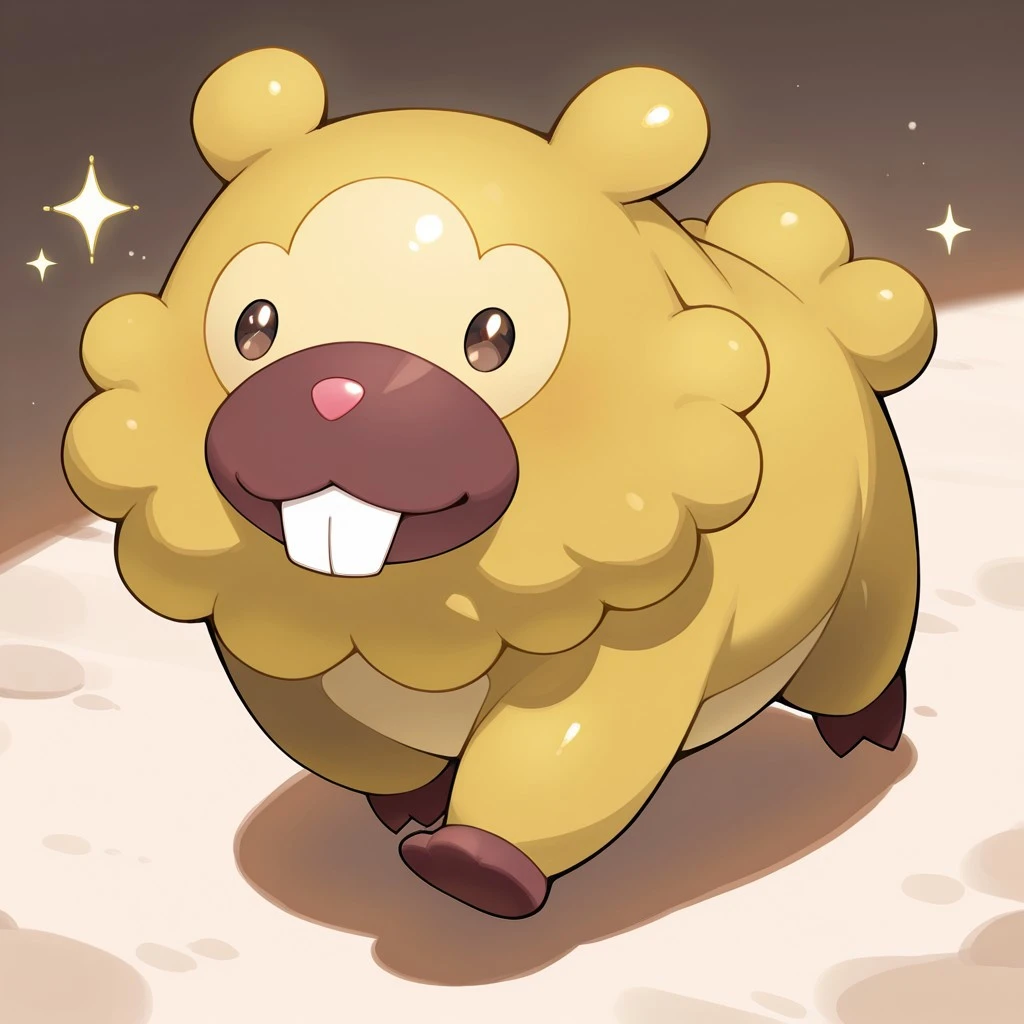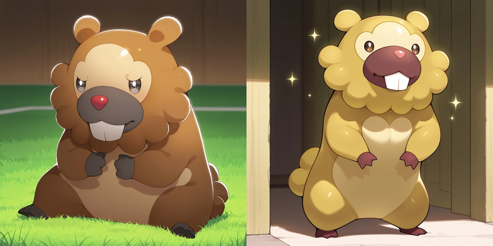bidoof, shiny, yellow fur, peach face, beady eyes, pink nose, maroon muzzle, buck tooth, peach underbelly, maroon feet, fluffy tail