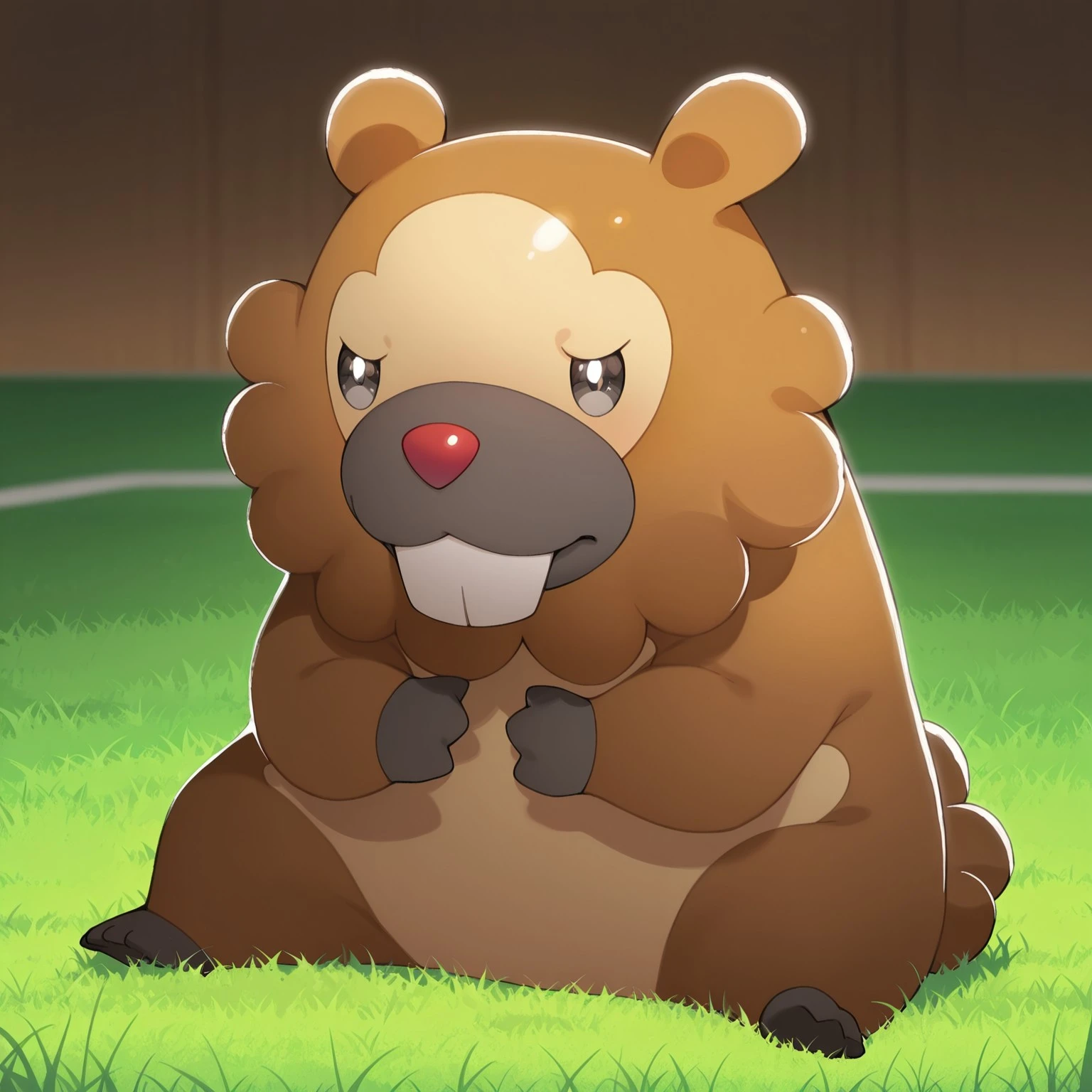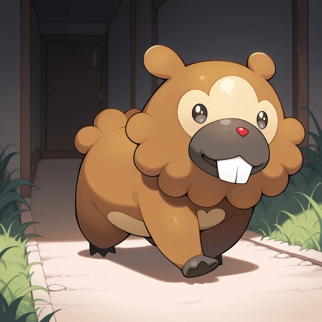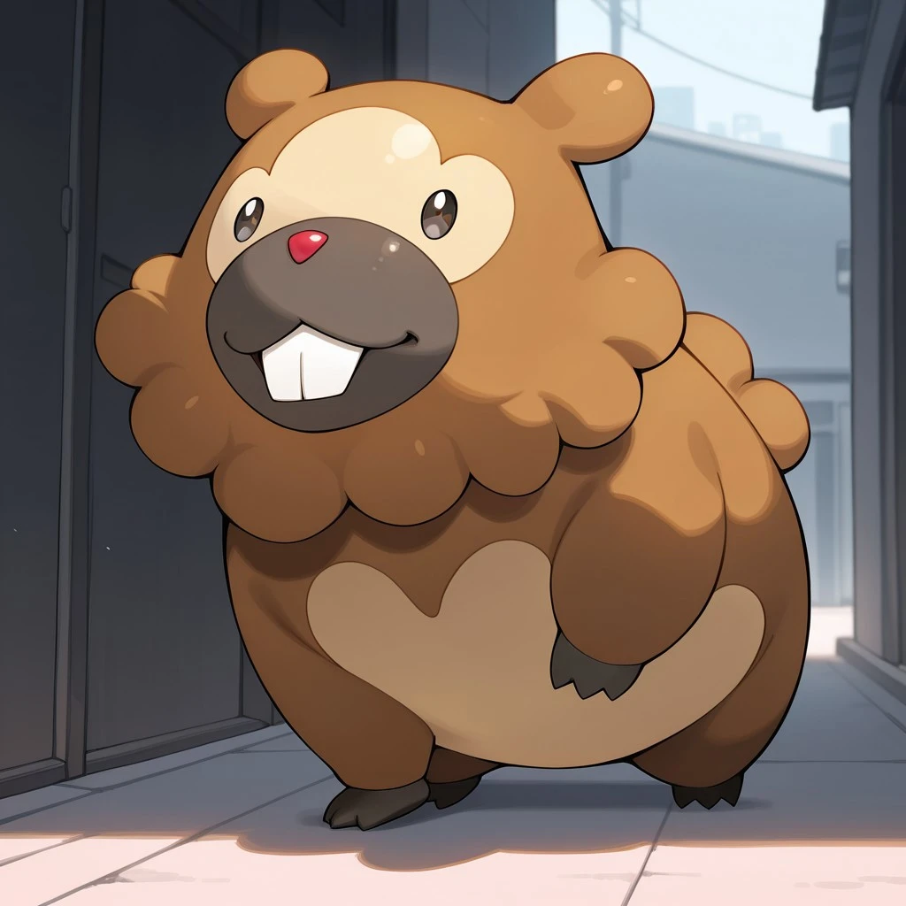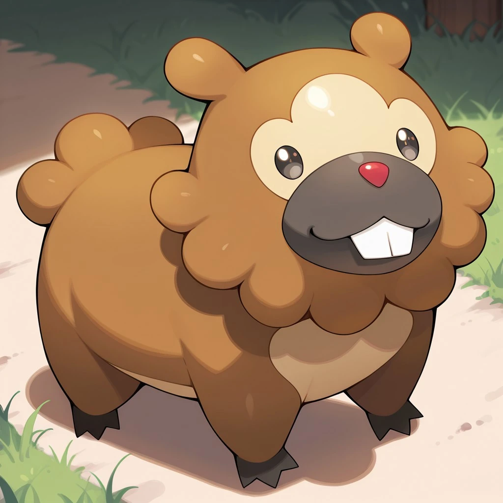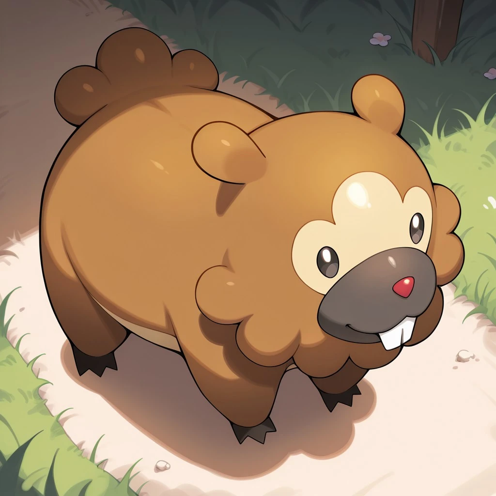 bidoof, brown fur, peach face, beady eyes, red nose, dark grey muzzle, buck tooth, peach underbelly, dark grey feet, fluffy tail