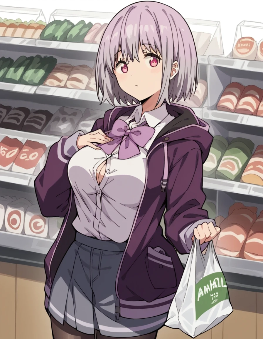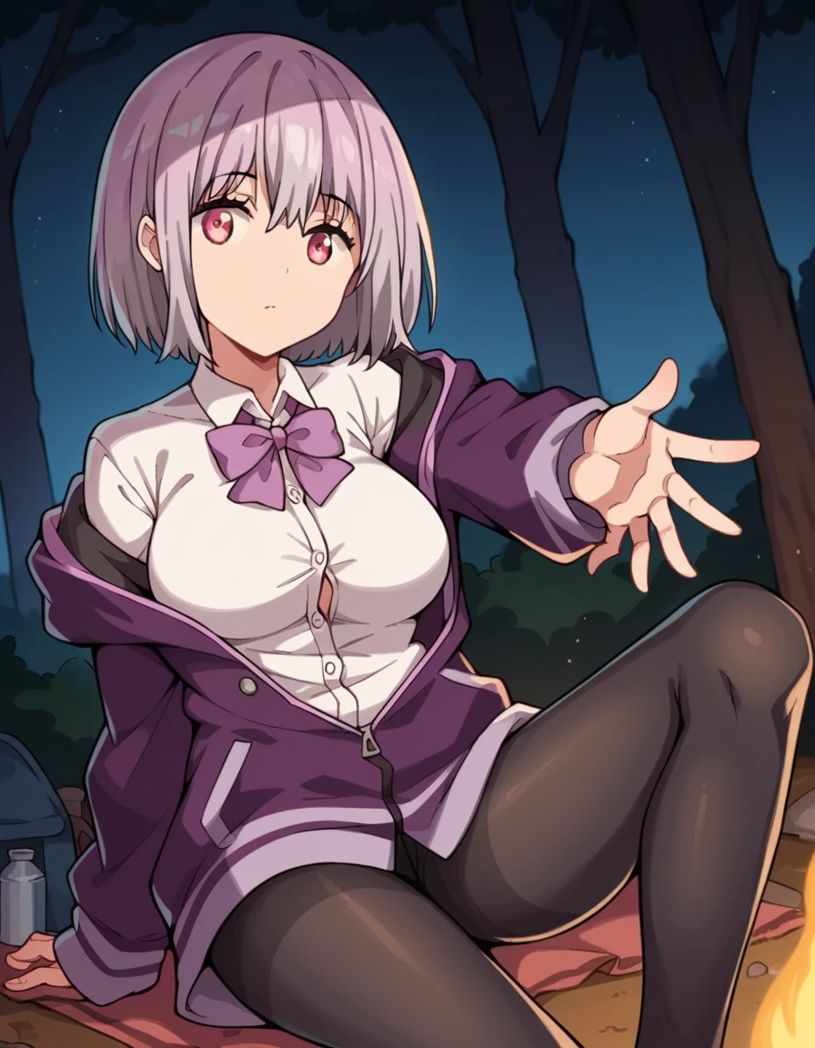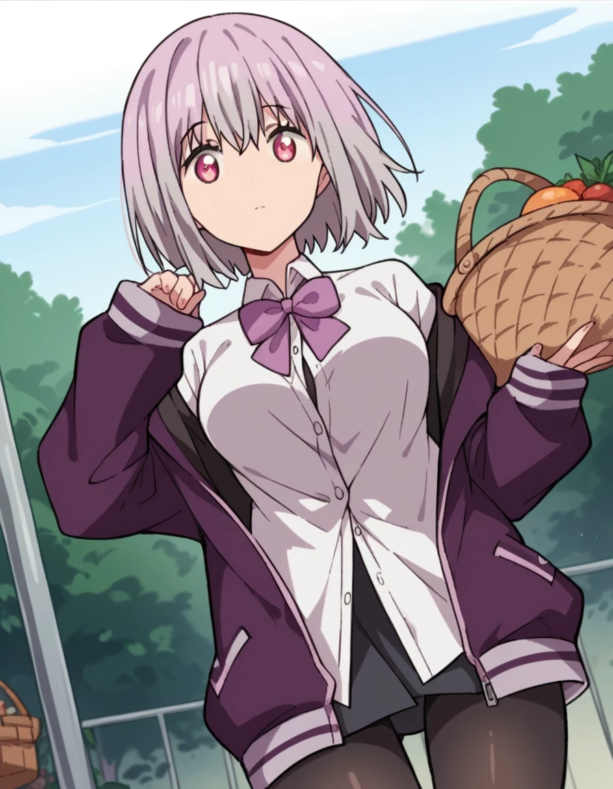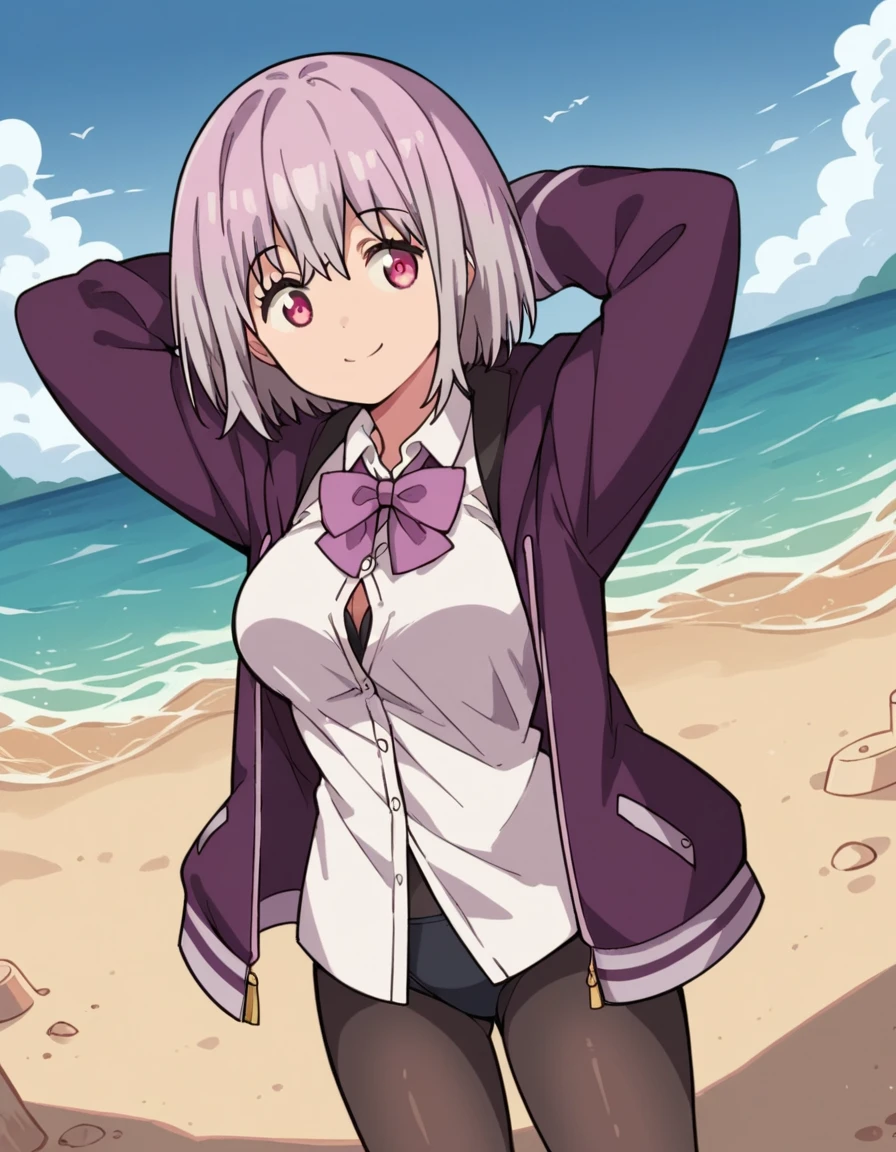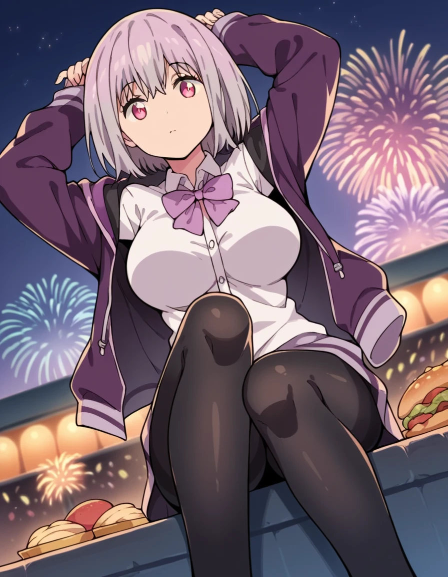 <lora:akane-shinjou-s1-ponyxl-lora-nochekaiser:1>, akane shinjou, light purple hair, pink eyes, short hair, large breasts,
