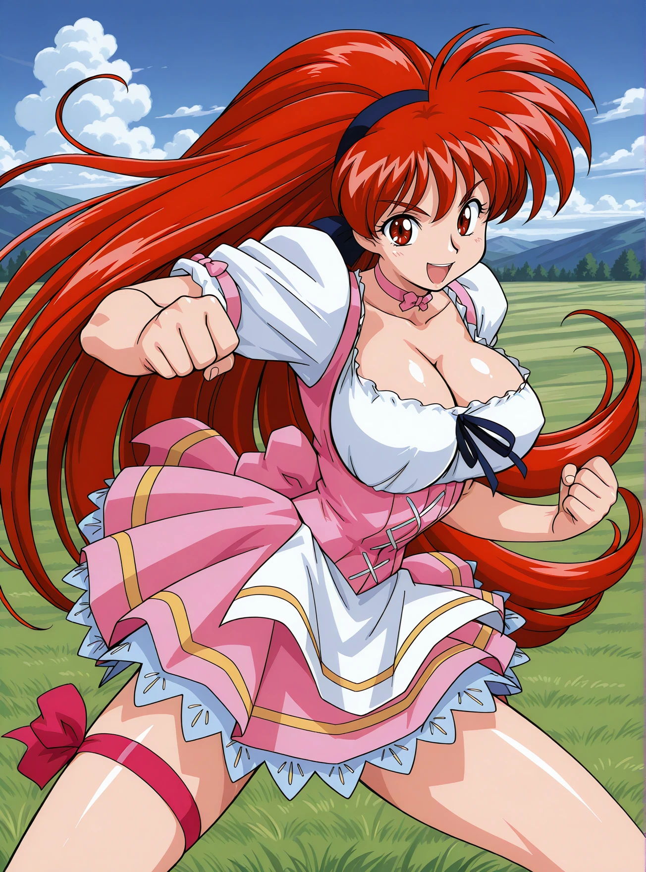 honjouji_akira, red eyes, red hair, long hair, very long hair, hair ribbon, hairband, cleavage, choker, waitress, puffy short sleeves, pink skirt, single thigh ribbon,