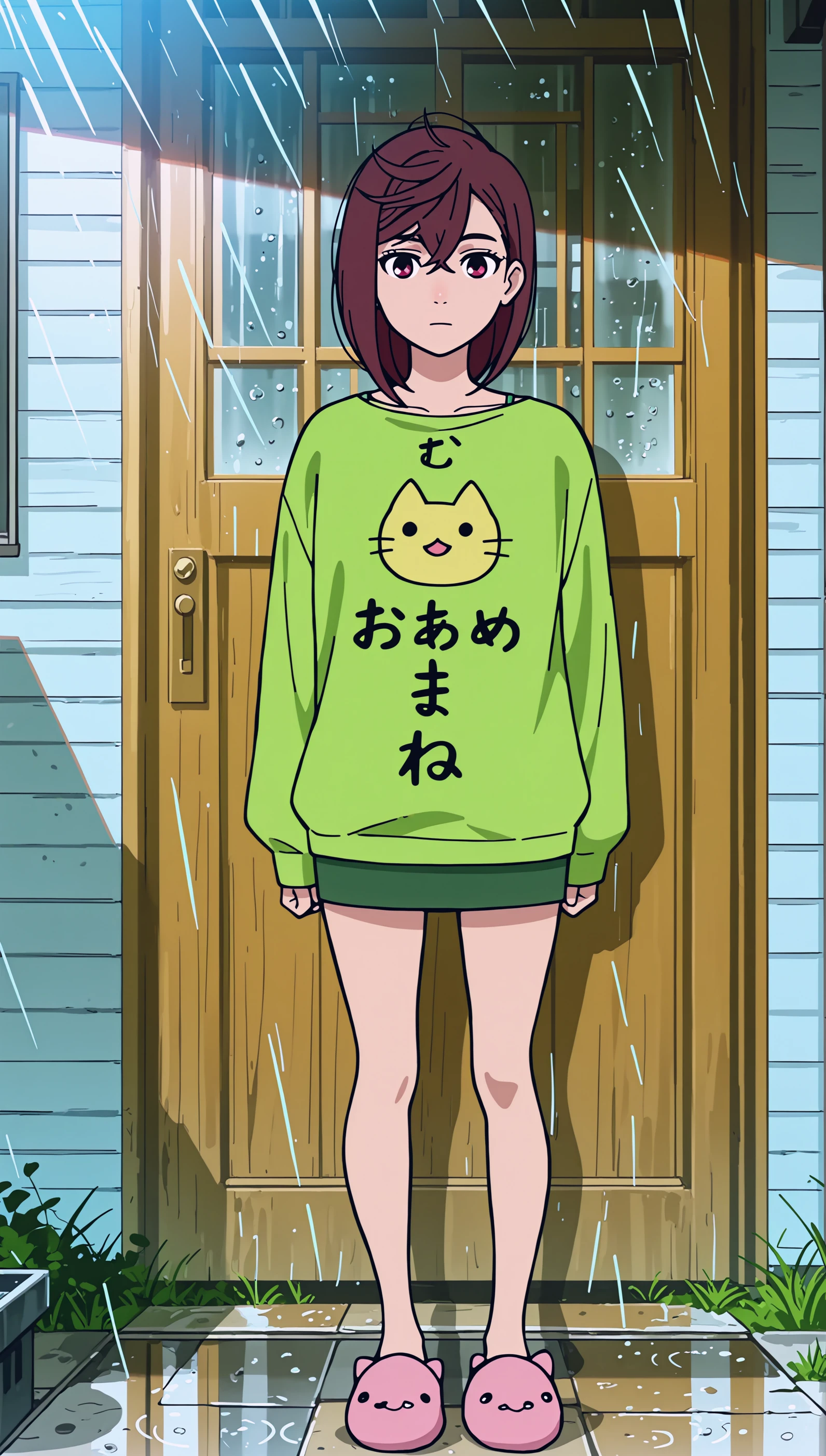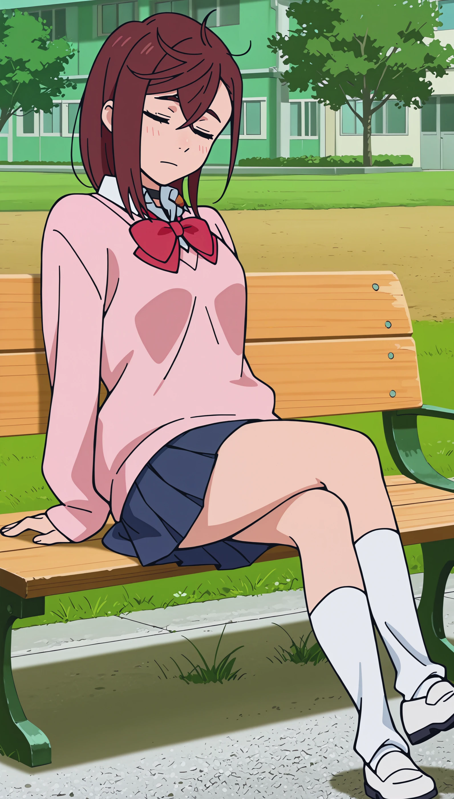 Optionnal Words: bow, school uniform, pleated skirt, shoes, socks, sweater, blue skirt