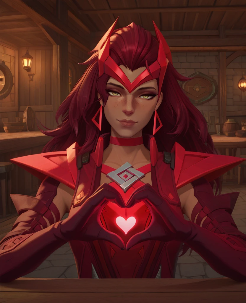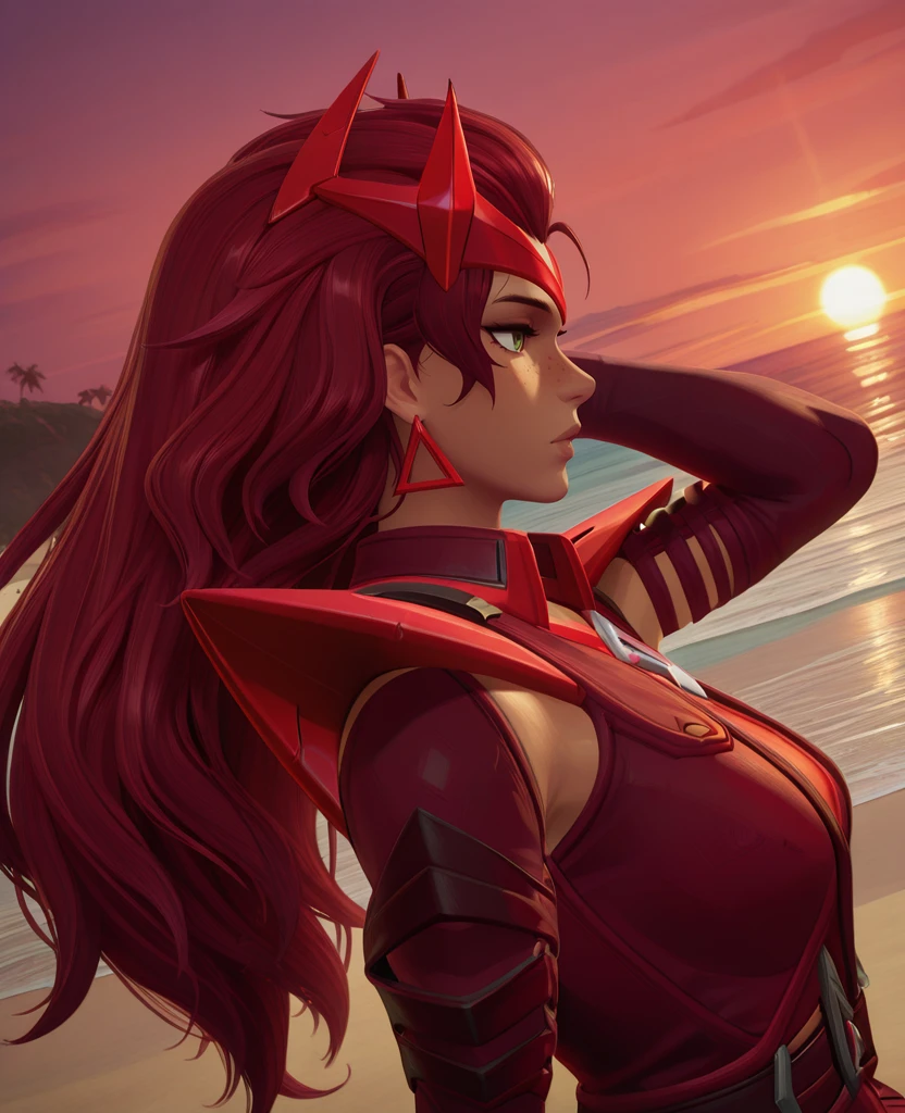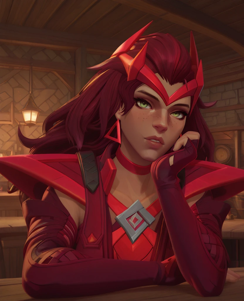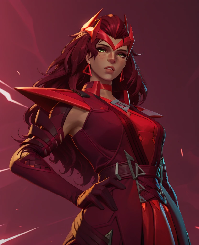 sc1, 1girl, solo, long hair, red hair, green eyes, red lips, freckles, elbow gloves, earrings, dress, headgear, choker, dark-skinned female, boots,