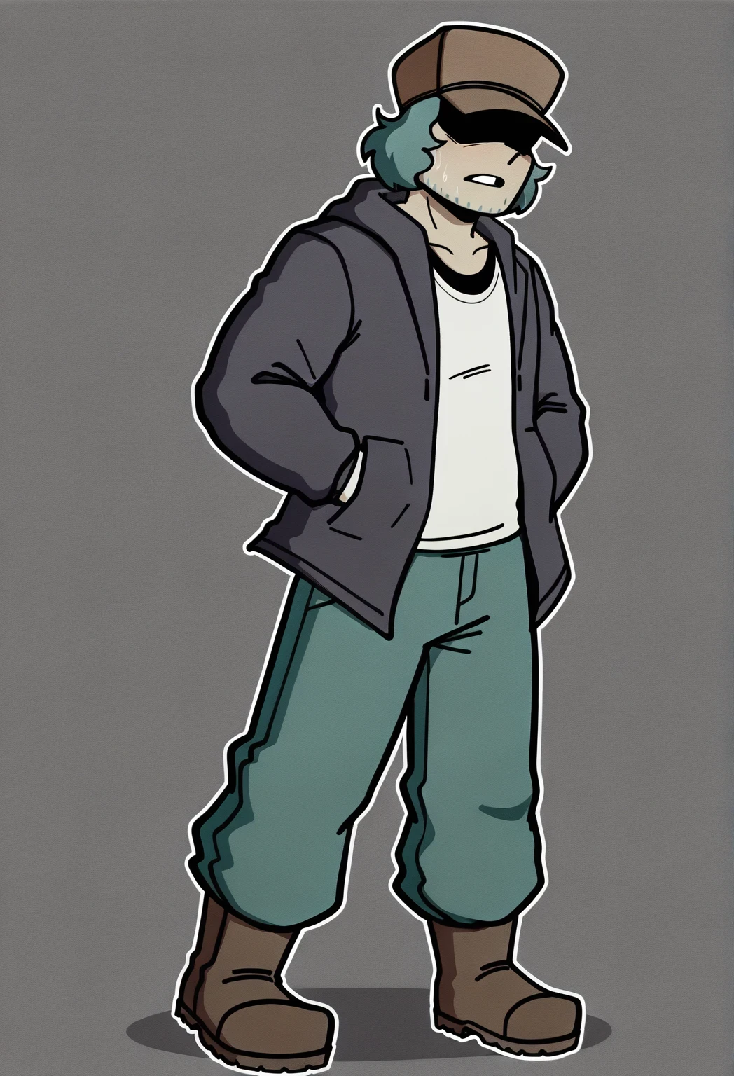 GarcelloFNFHR, 1boy, teal hair, brown hat over eyes, brown eyes, grey-black jacket hoodie, plain white t-shirt, teal pants, brown boots, white fingerless gloves, teal stubble