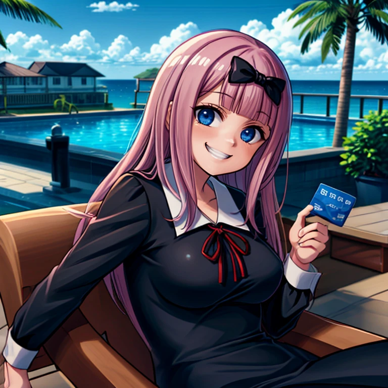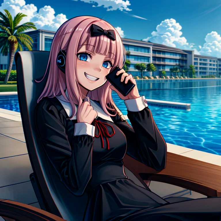 solo focus,architecture,poolside, palm tree, building,beach,luxury,(((phone,sitting,reclining,chair,laughing,evil eyes,evil grin,talking on phone))),