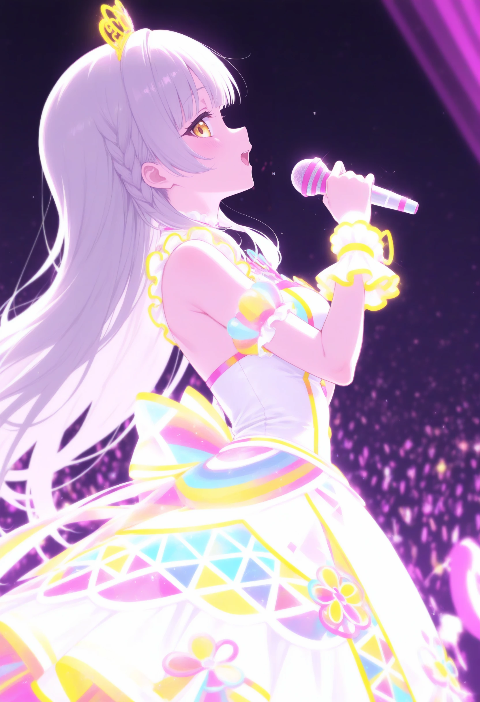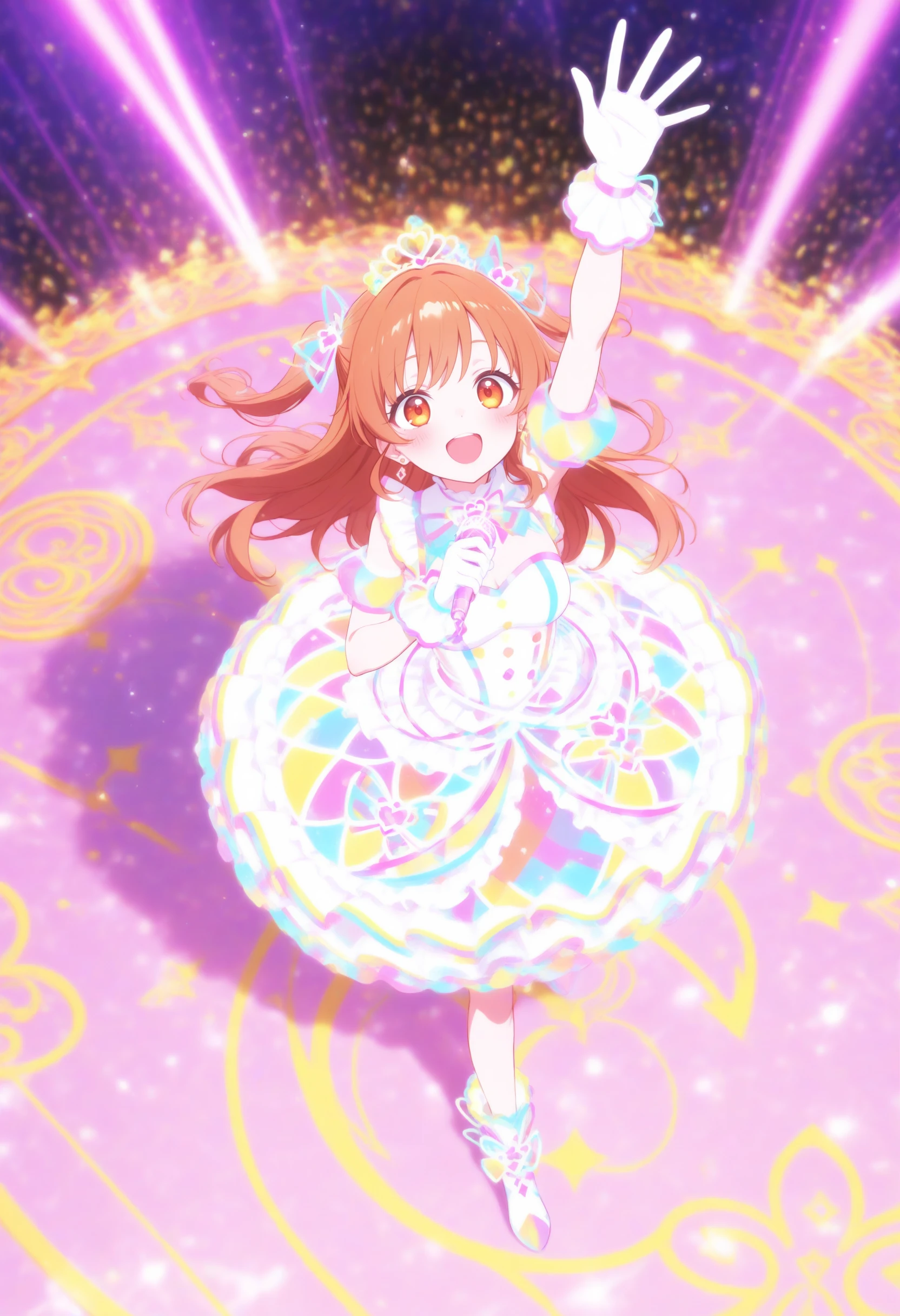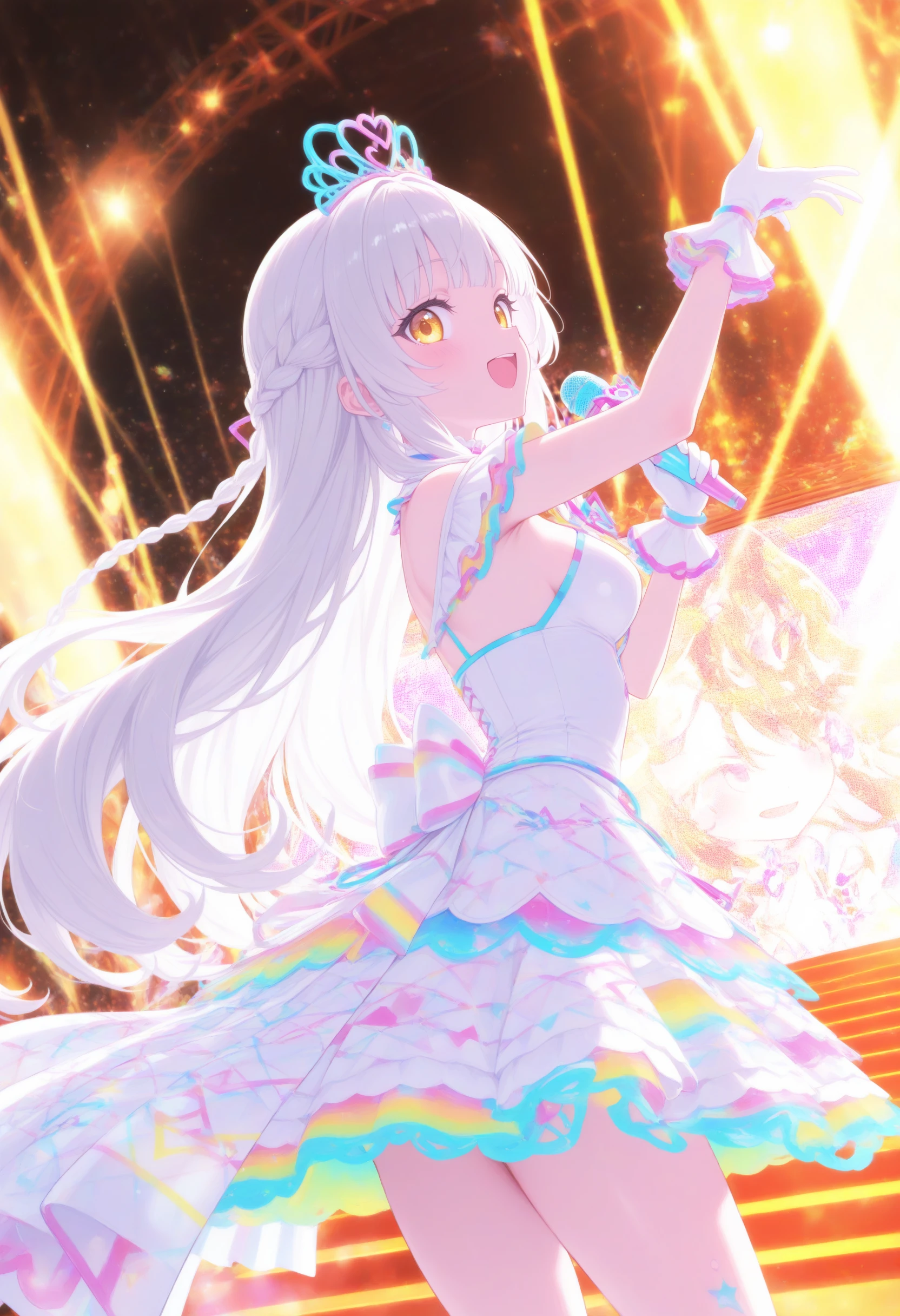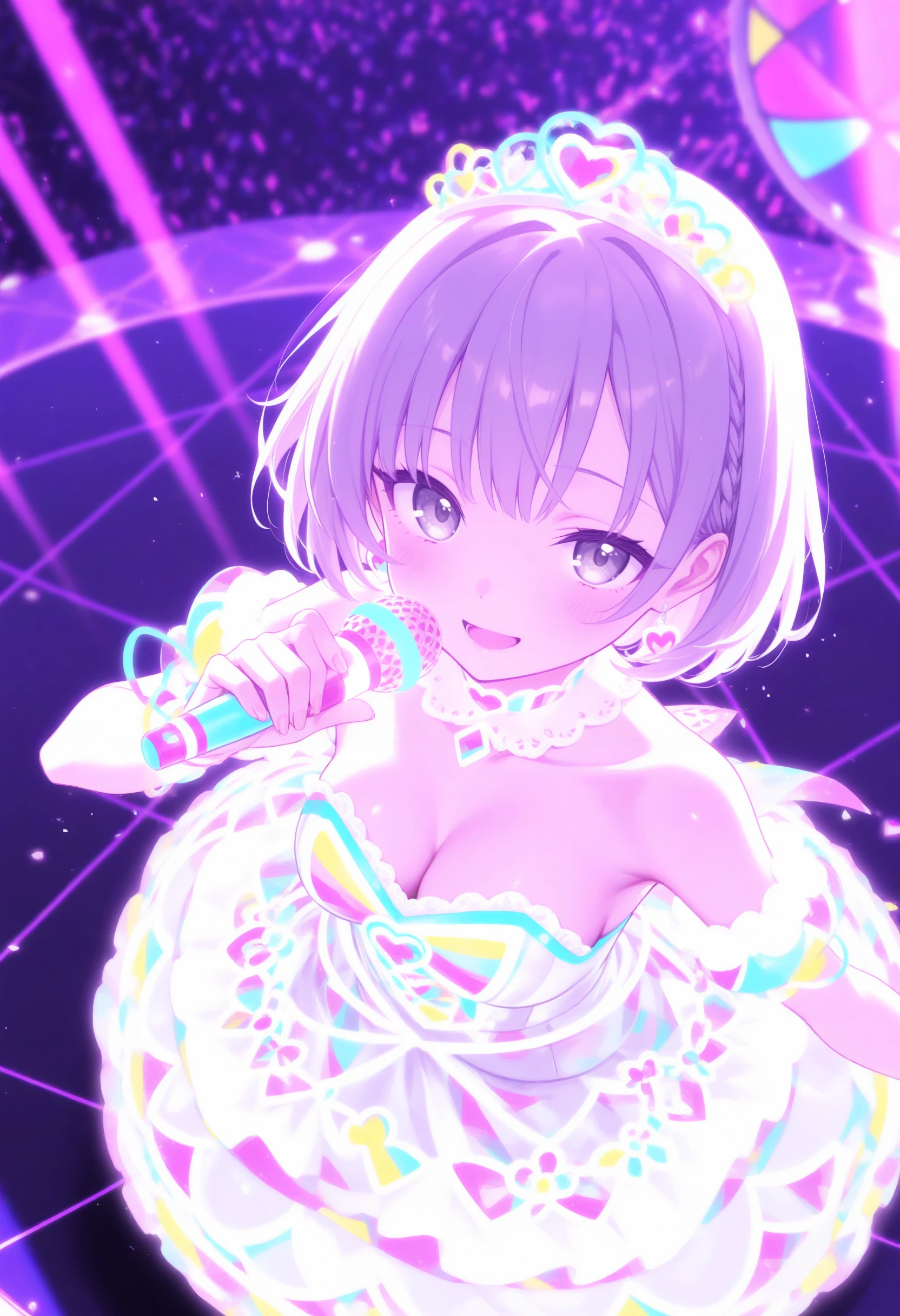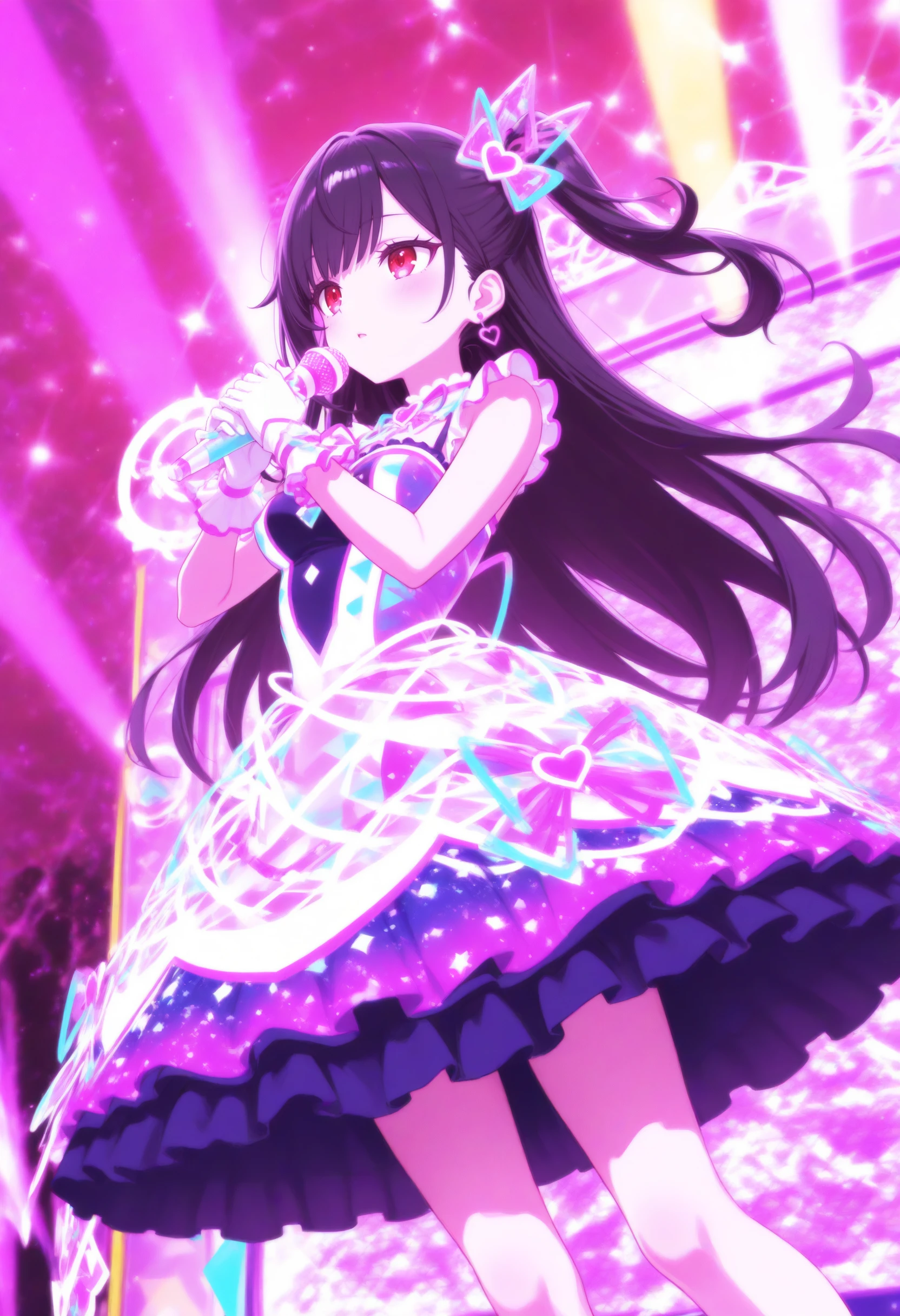 トリガーだけだと中途半端に光ったり会場も再現しないので idol,idol clothes,colorful,multicolored dress, glowing clothes ,cyber fashion ,glowing ,stage,microphone,stage lights,sparkle,concert, singing, dancing 辺りからお好みのプロンプトで補強して下さい。