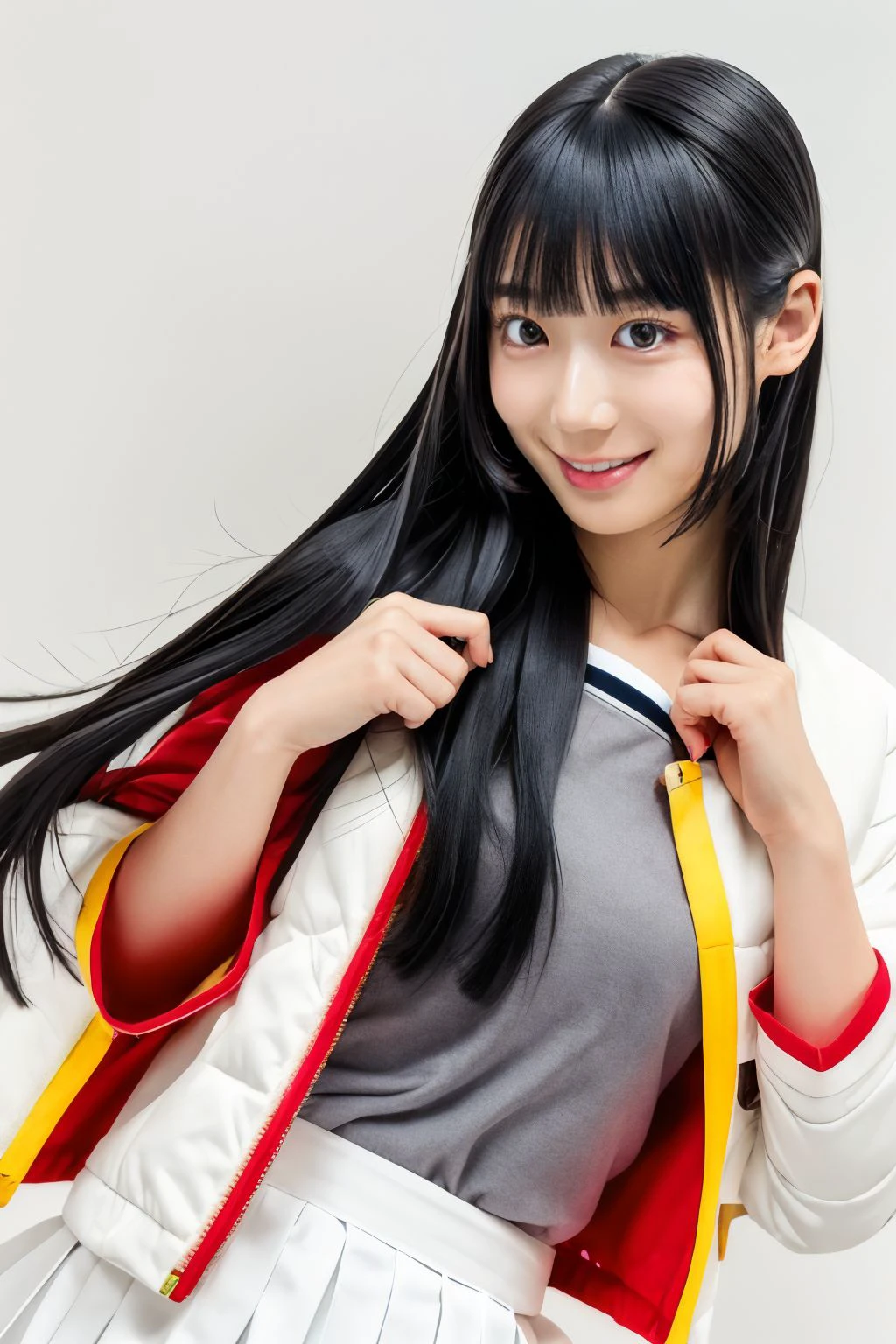 Recommend prompt: 1girl, loli, 16 years old, solo, medium breasts, looking at viewer, realistic, photorealistic, black hair, long hair, smile, black eyes, bangs,