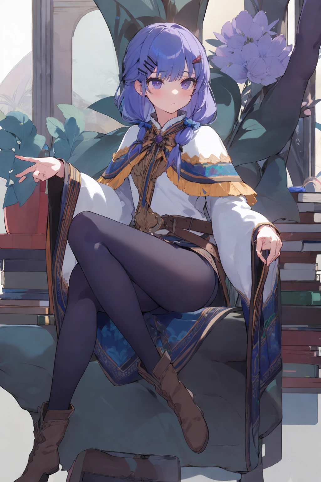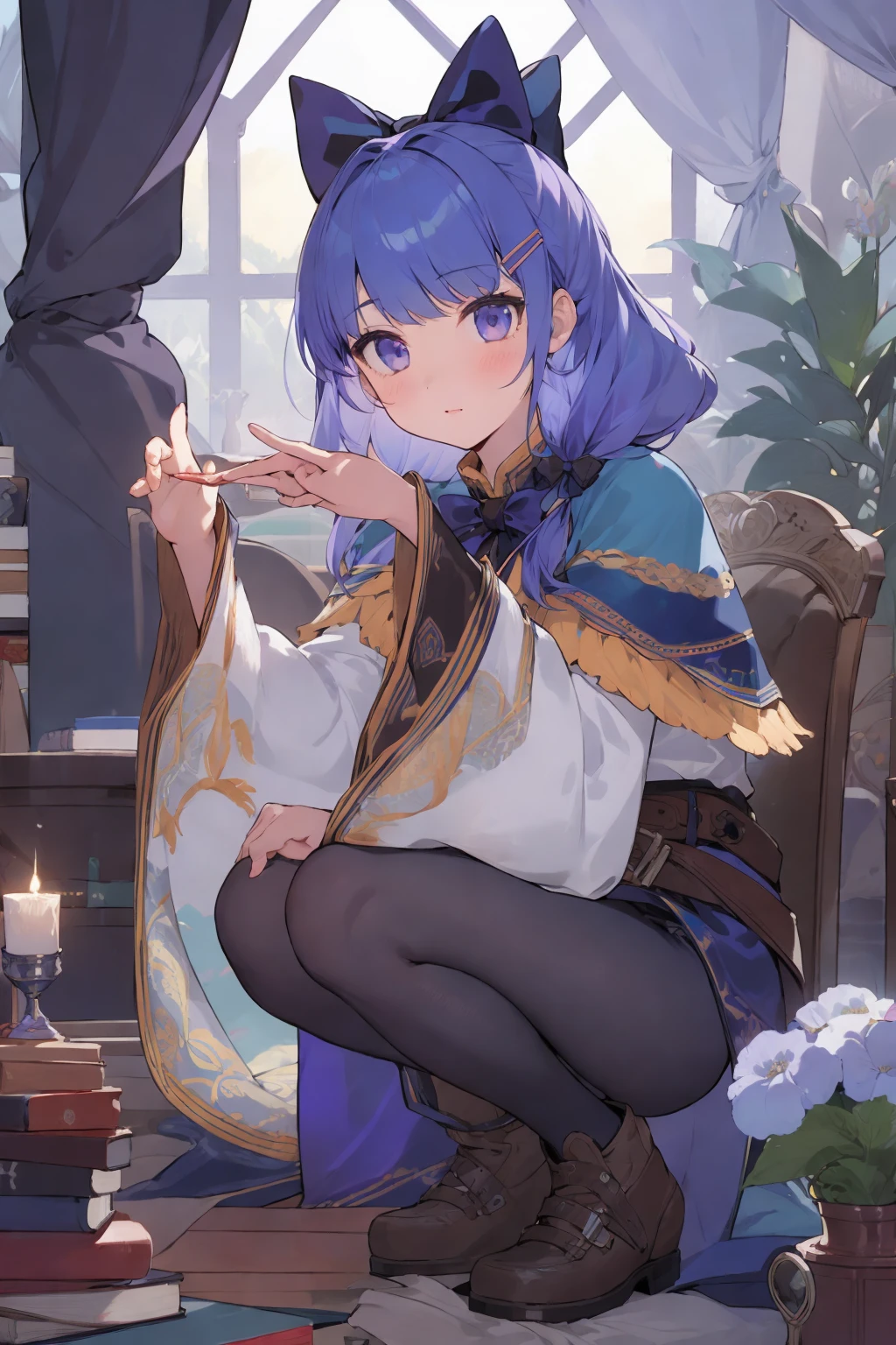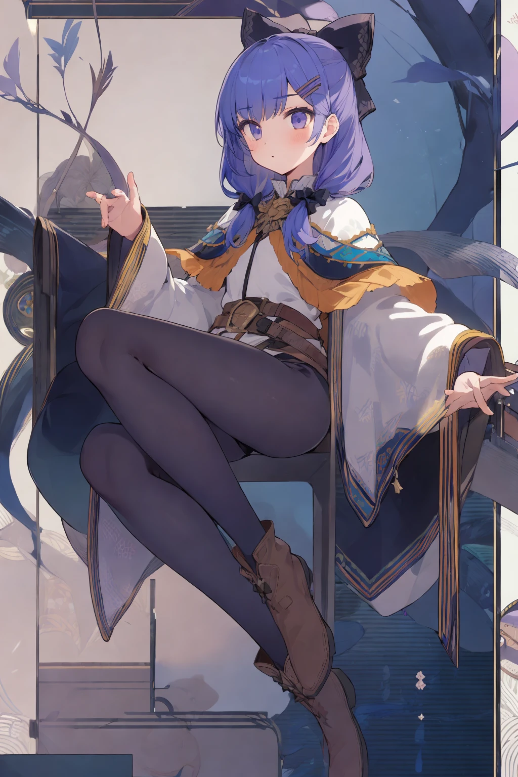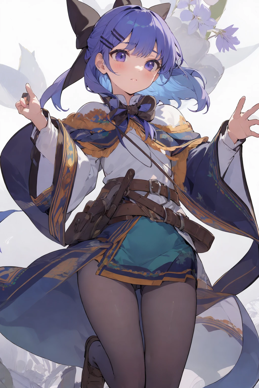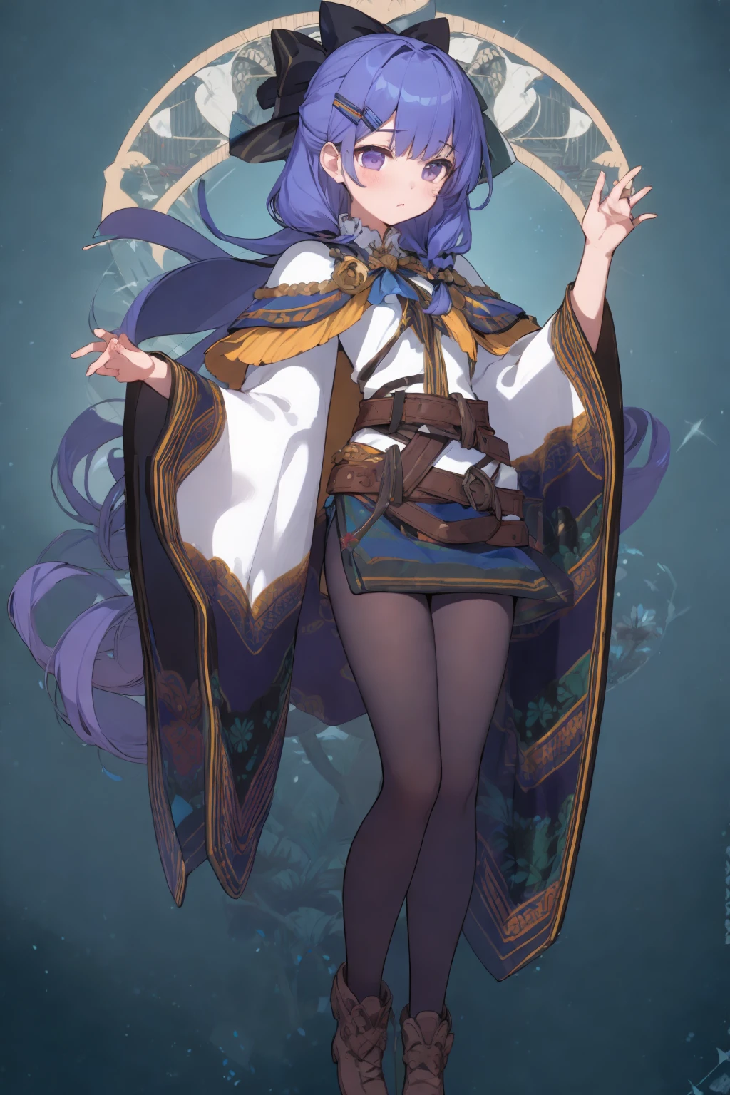1girl, pantyhose, wide sleeves,belt, brown footwear, hairclip, long sleeves, capelet, purple hair, Blue hair hair bow