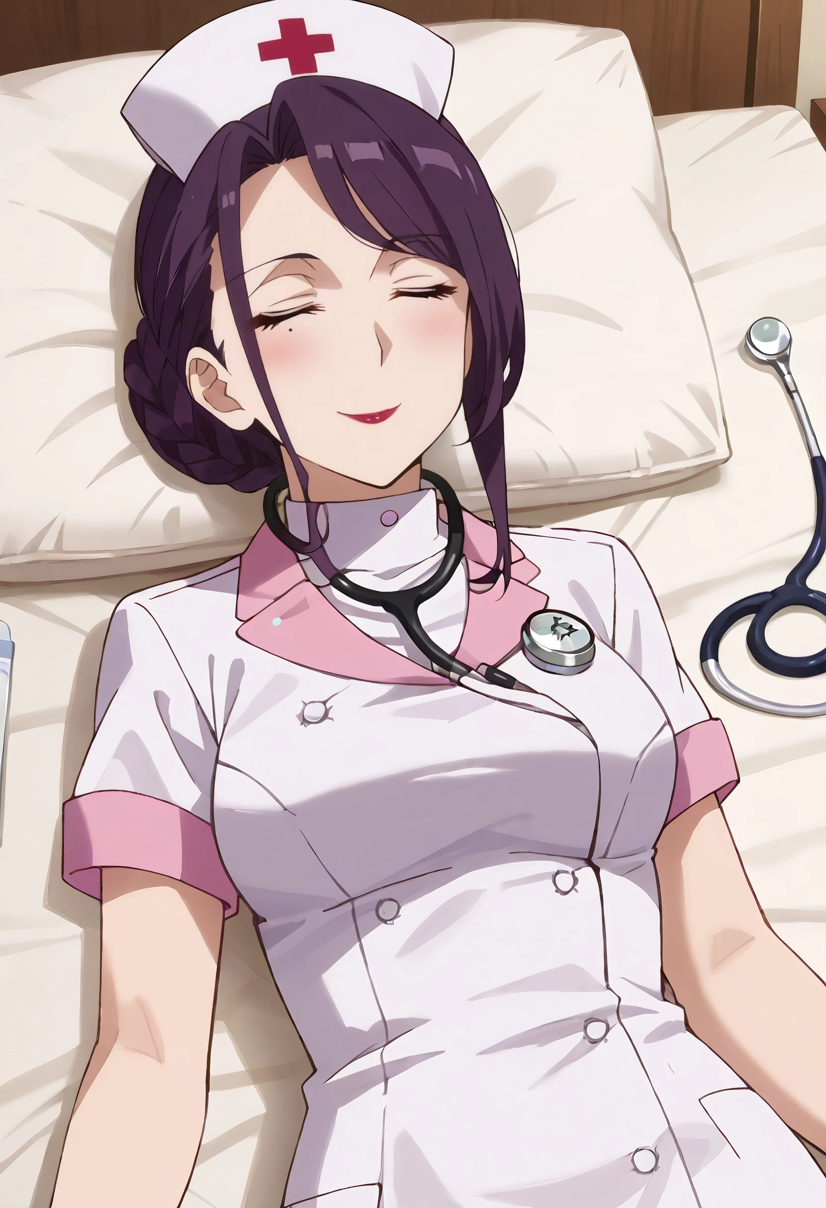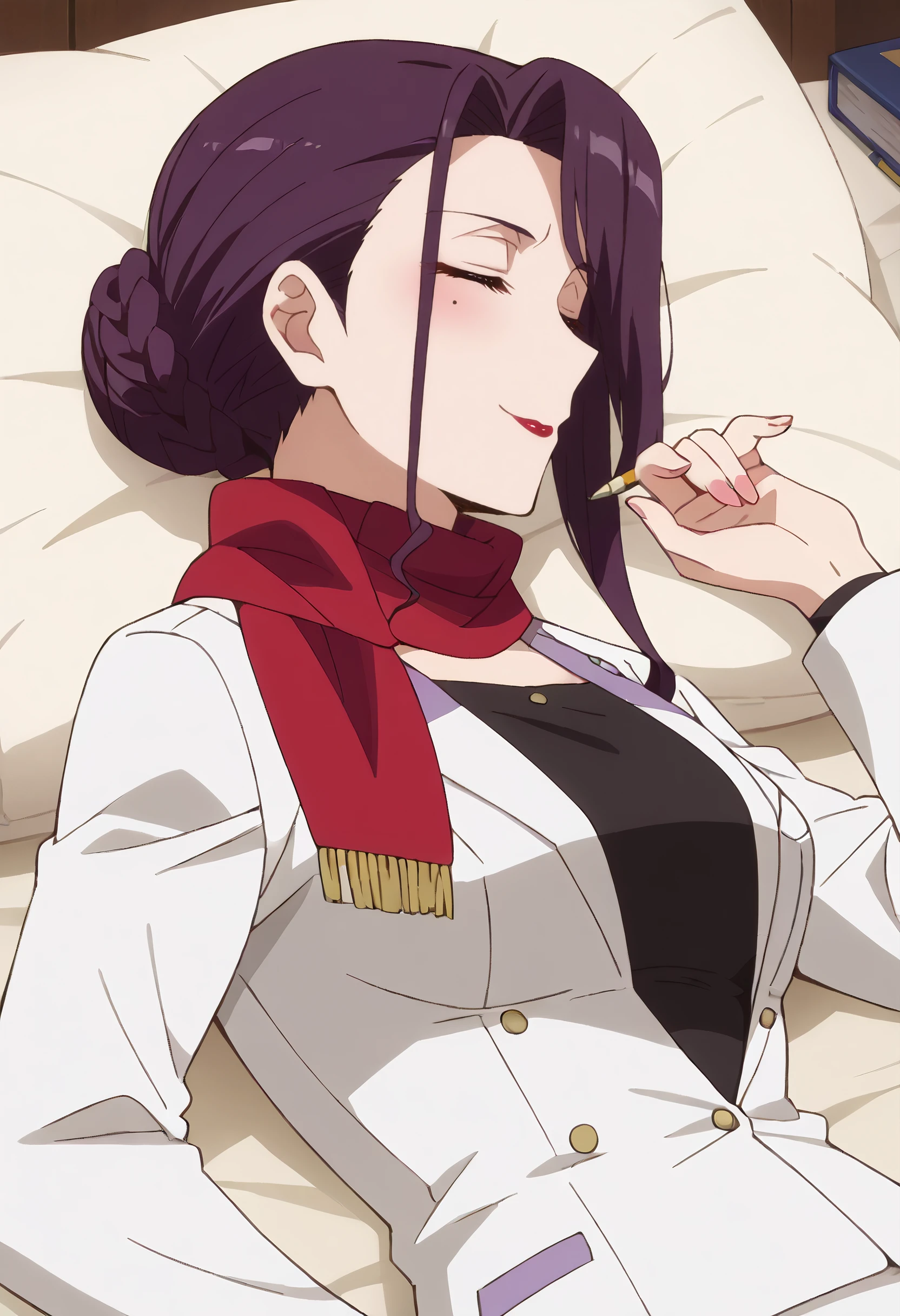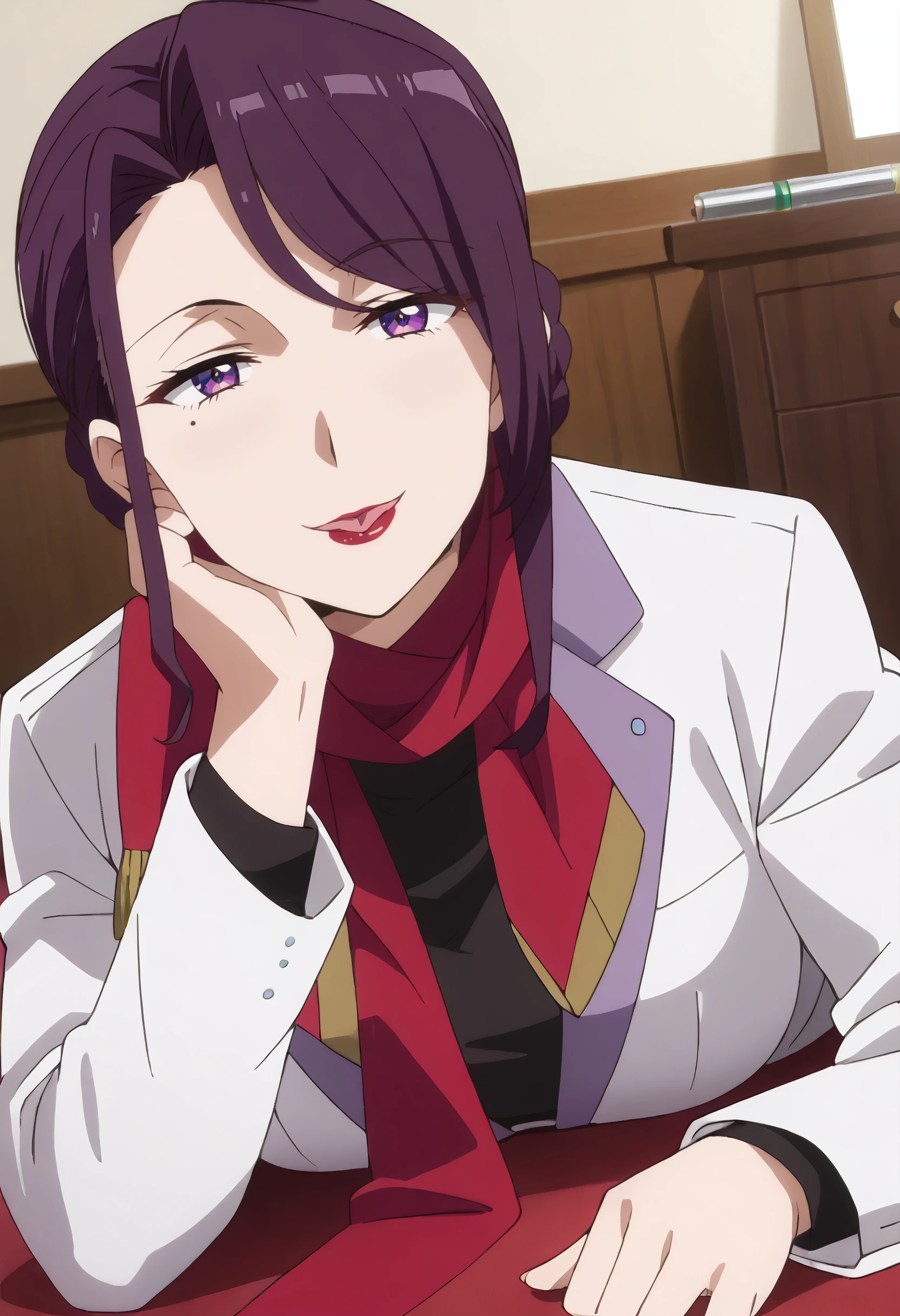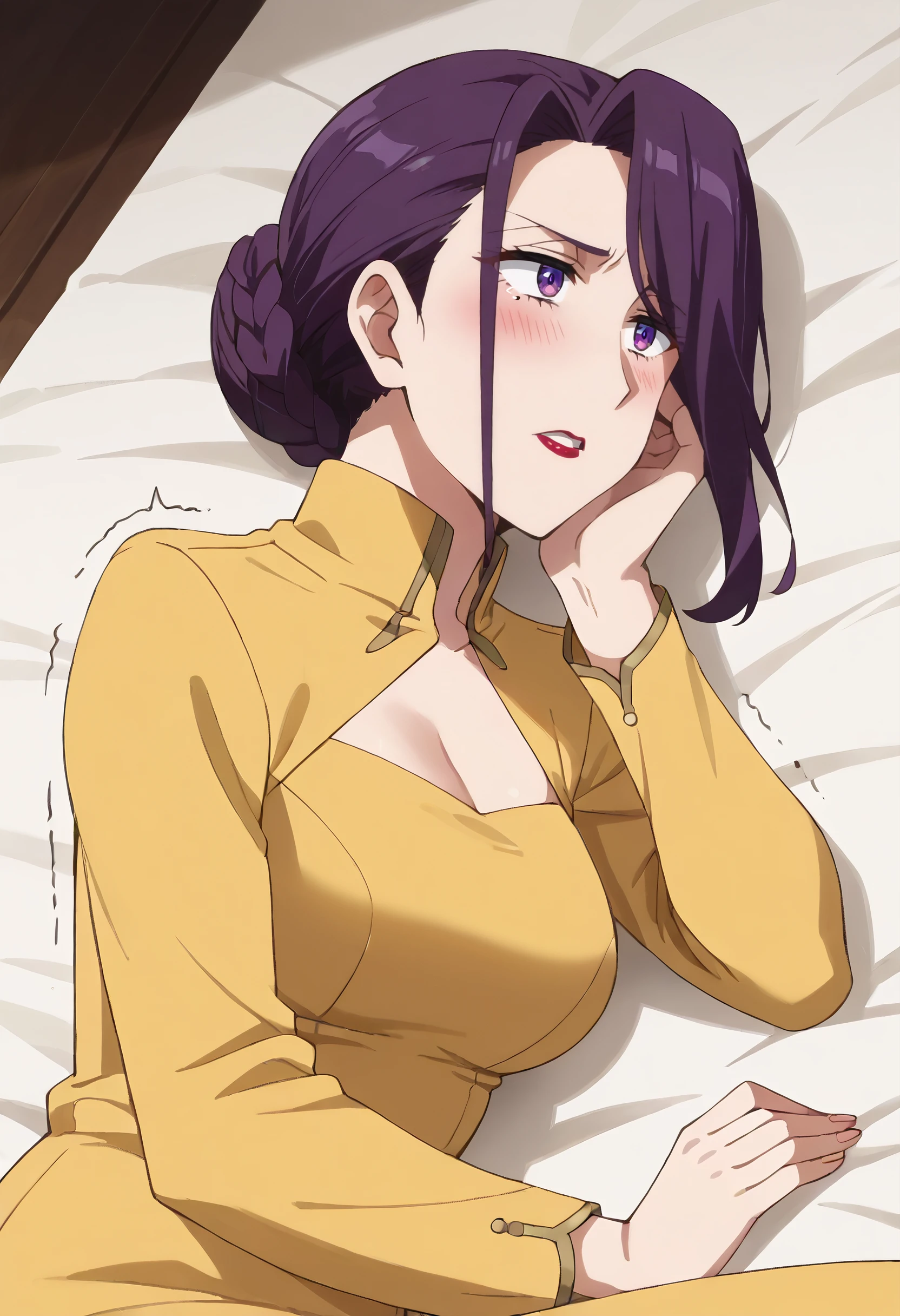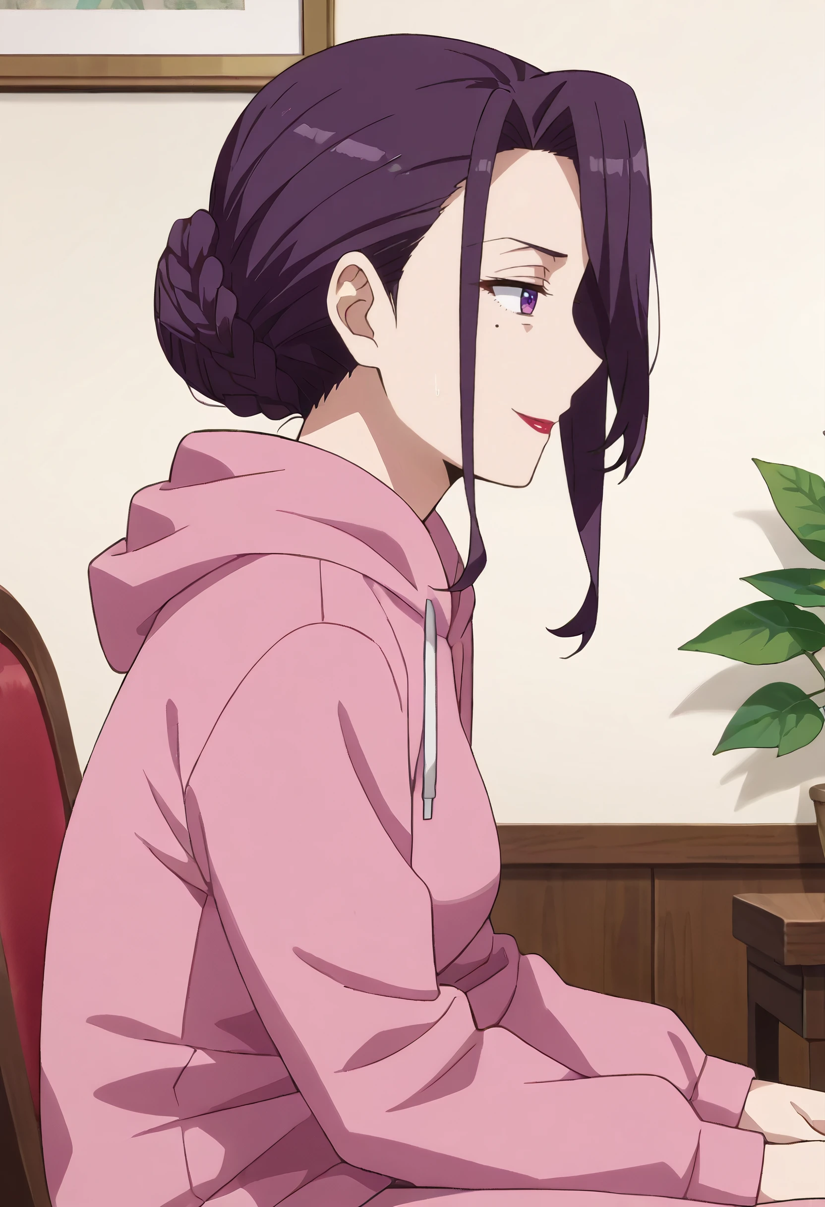 TNMYukinaT, hair bun, purple eyes, single hair bun, black hair, mole, braid, mole under eye, long hair, lipstick, sidelocks, makeup, mature female,