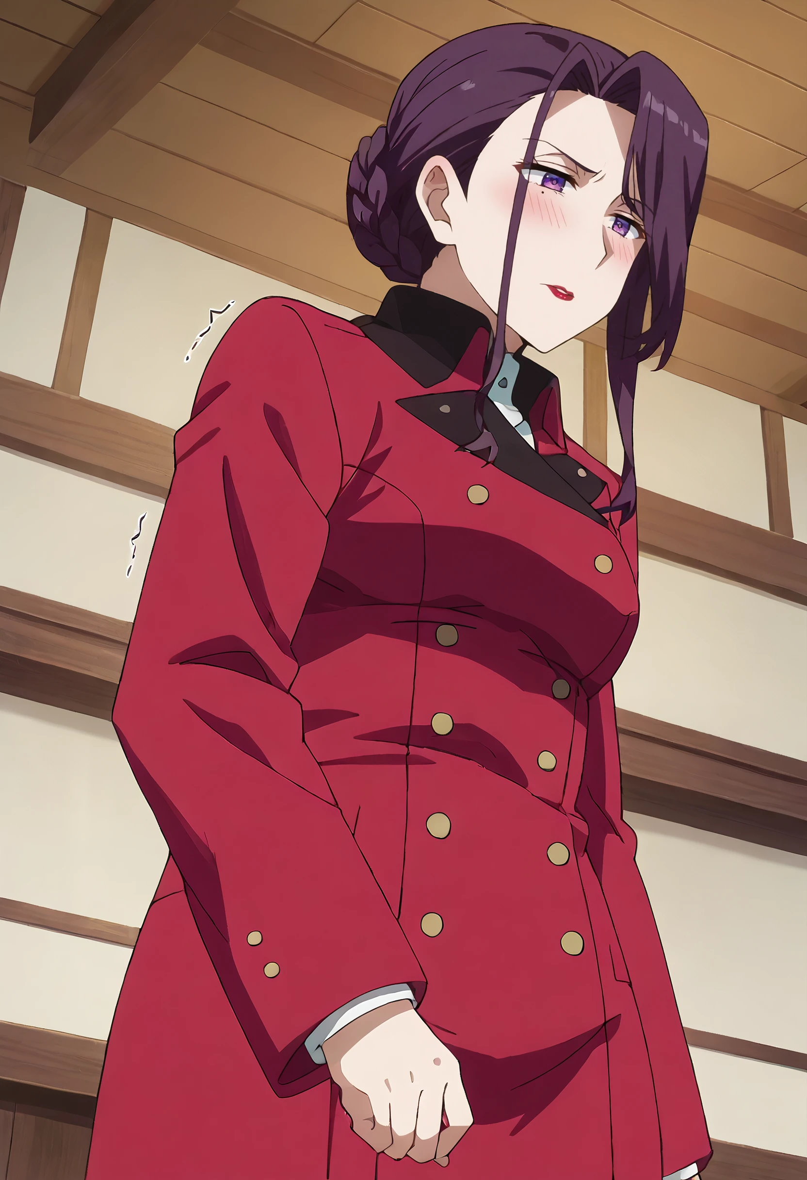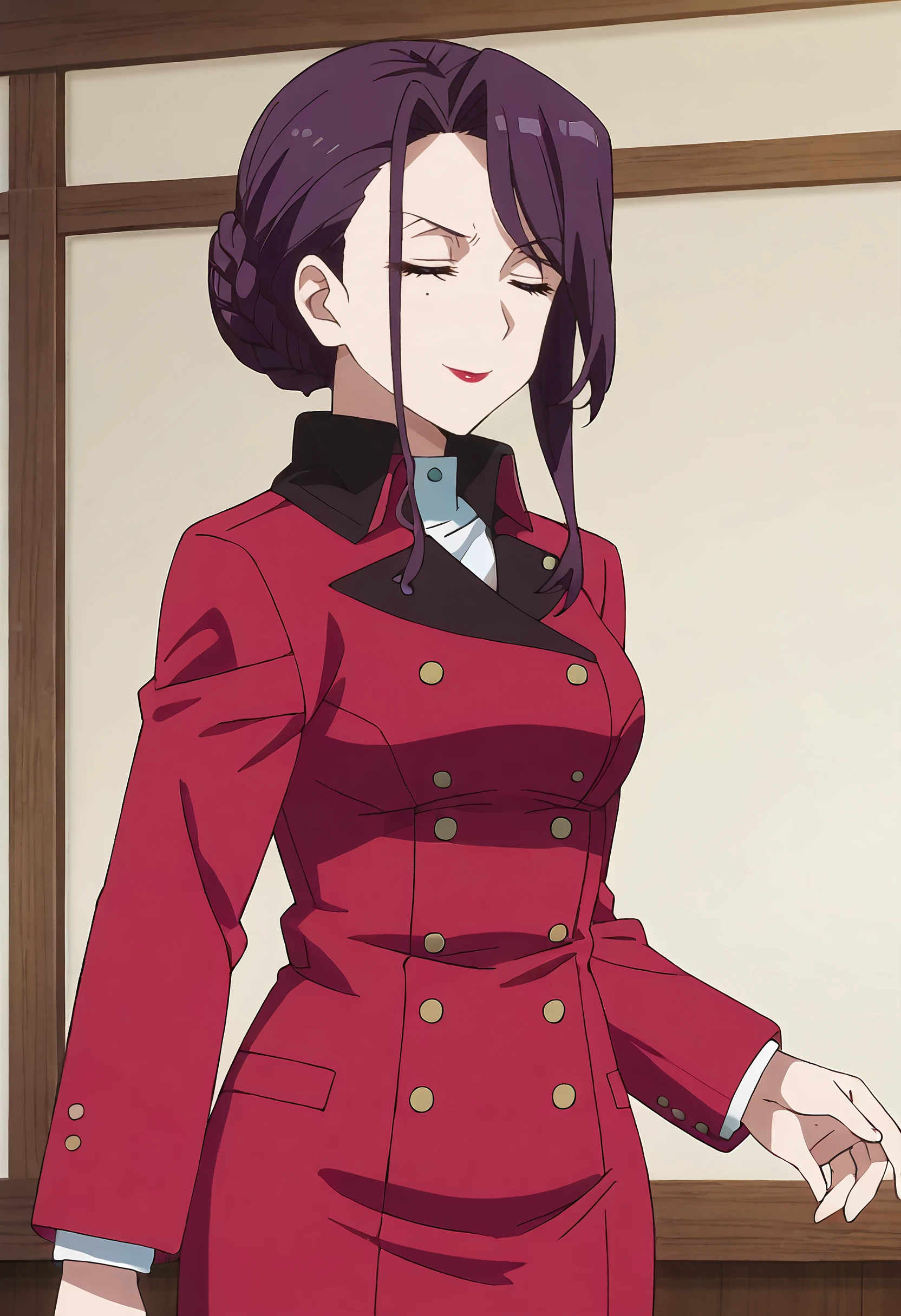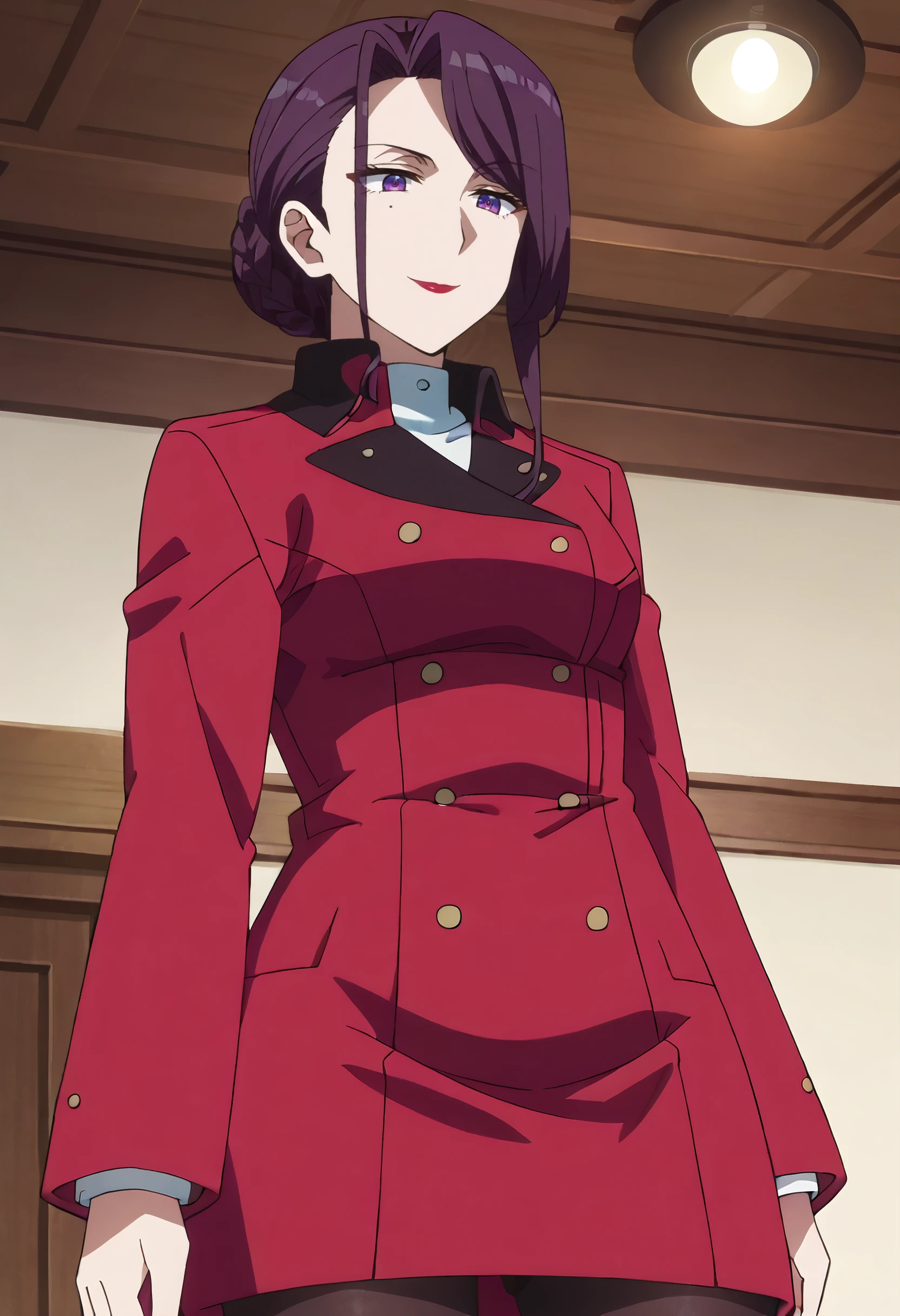 YukinaTJacketA, coat, long sleeves, jacket, red jacket, buttons, double-breasted, red coat, braided bun, trench coat, pantyhose, suit, school uniform, black pantyhose,
