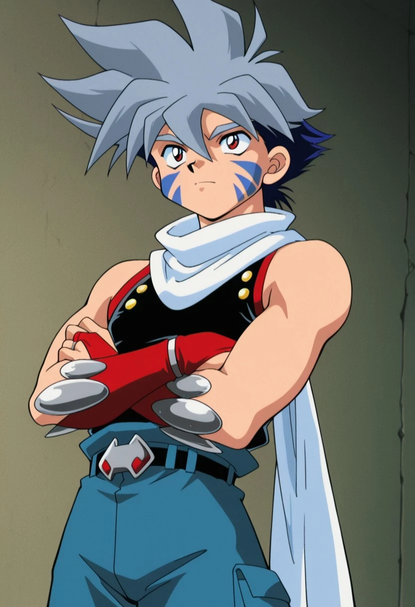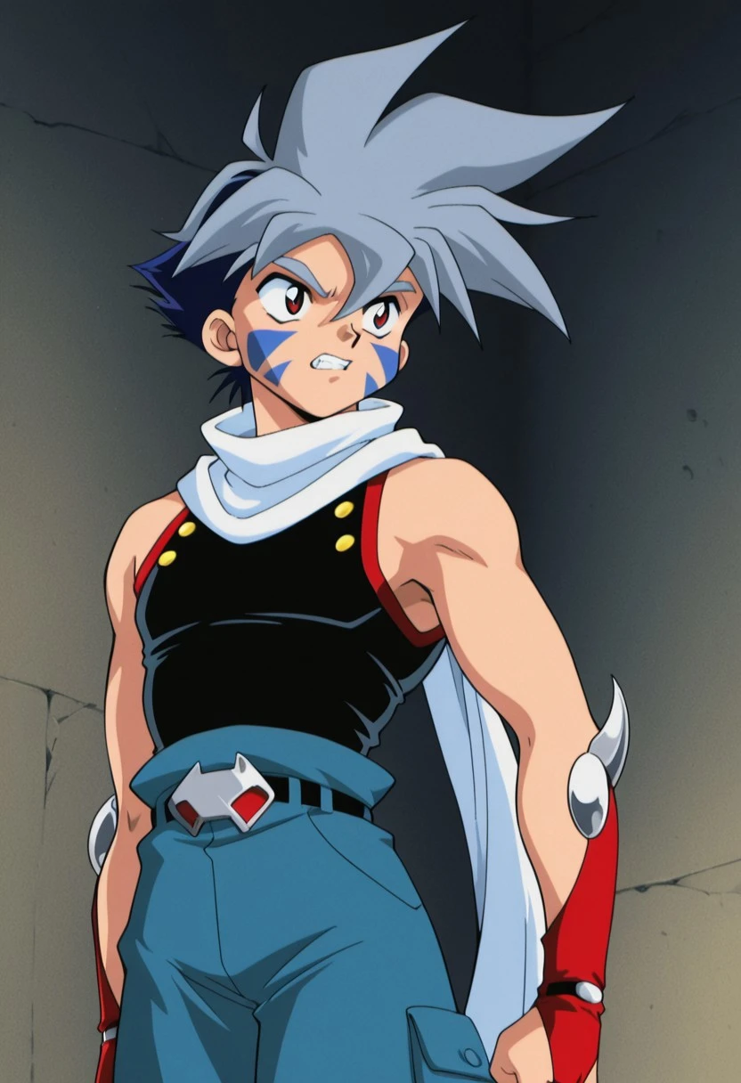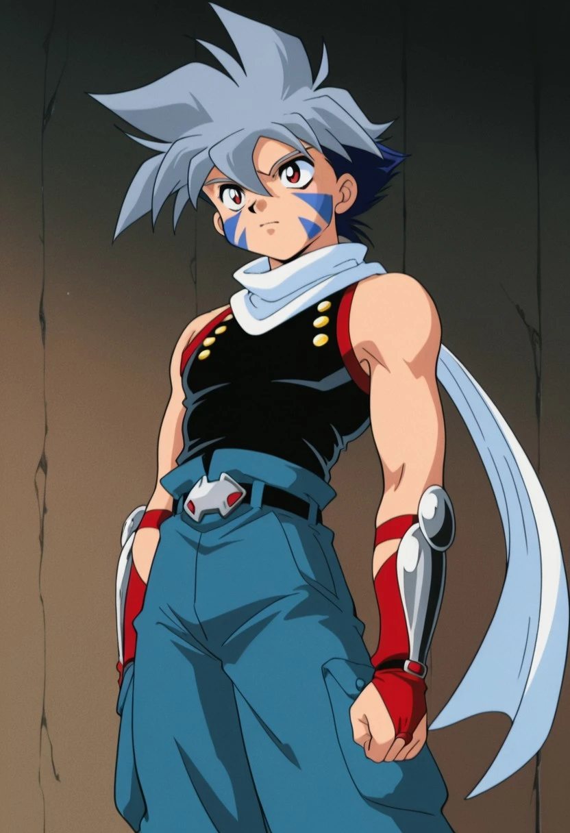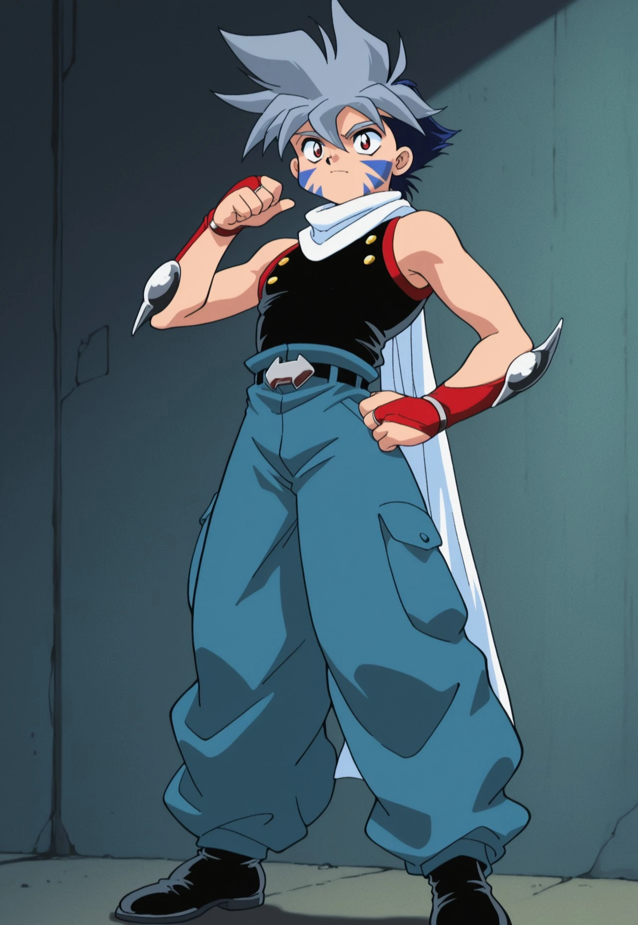 kaihiwa, 1boy, male focus, solo, facial tattoo, red eyes, grey hair, white scarf, black shirt, sleeveless, belt, blue pants, baggy pants, bridal gauntlets, black footwear,
