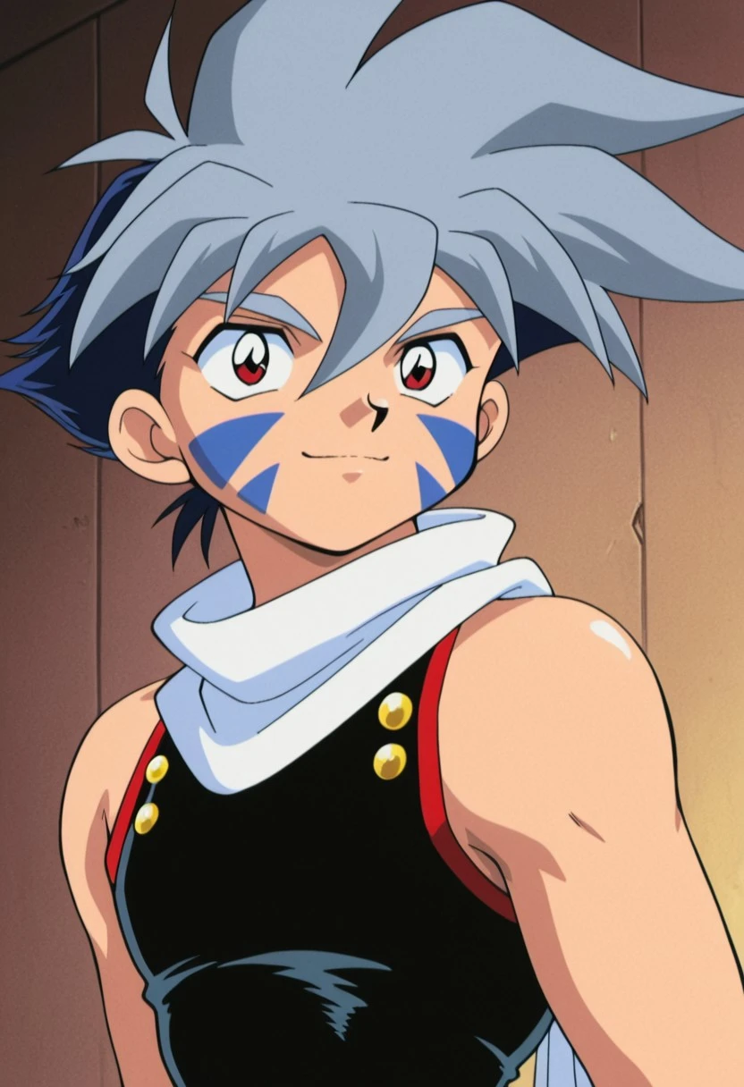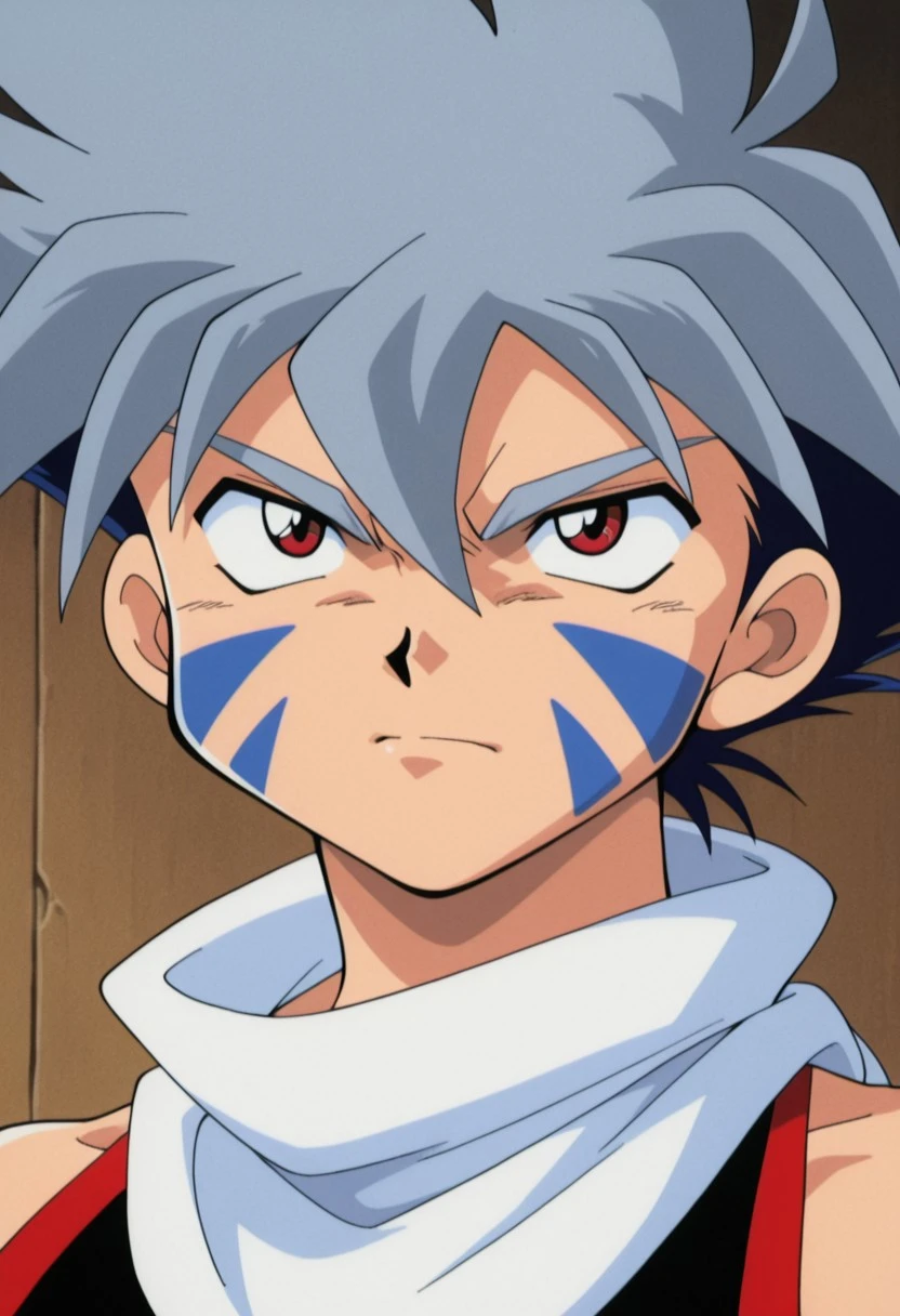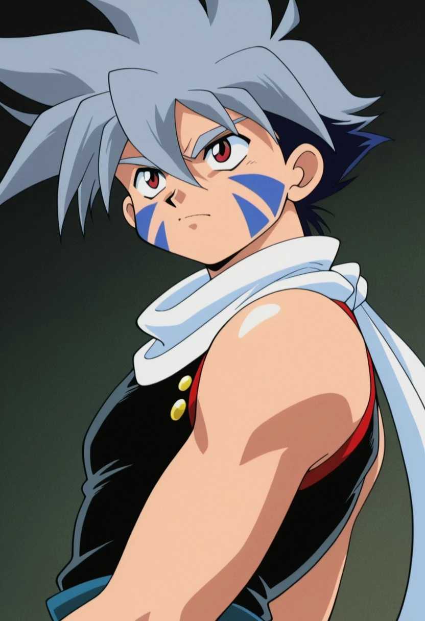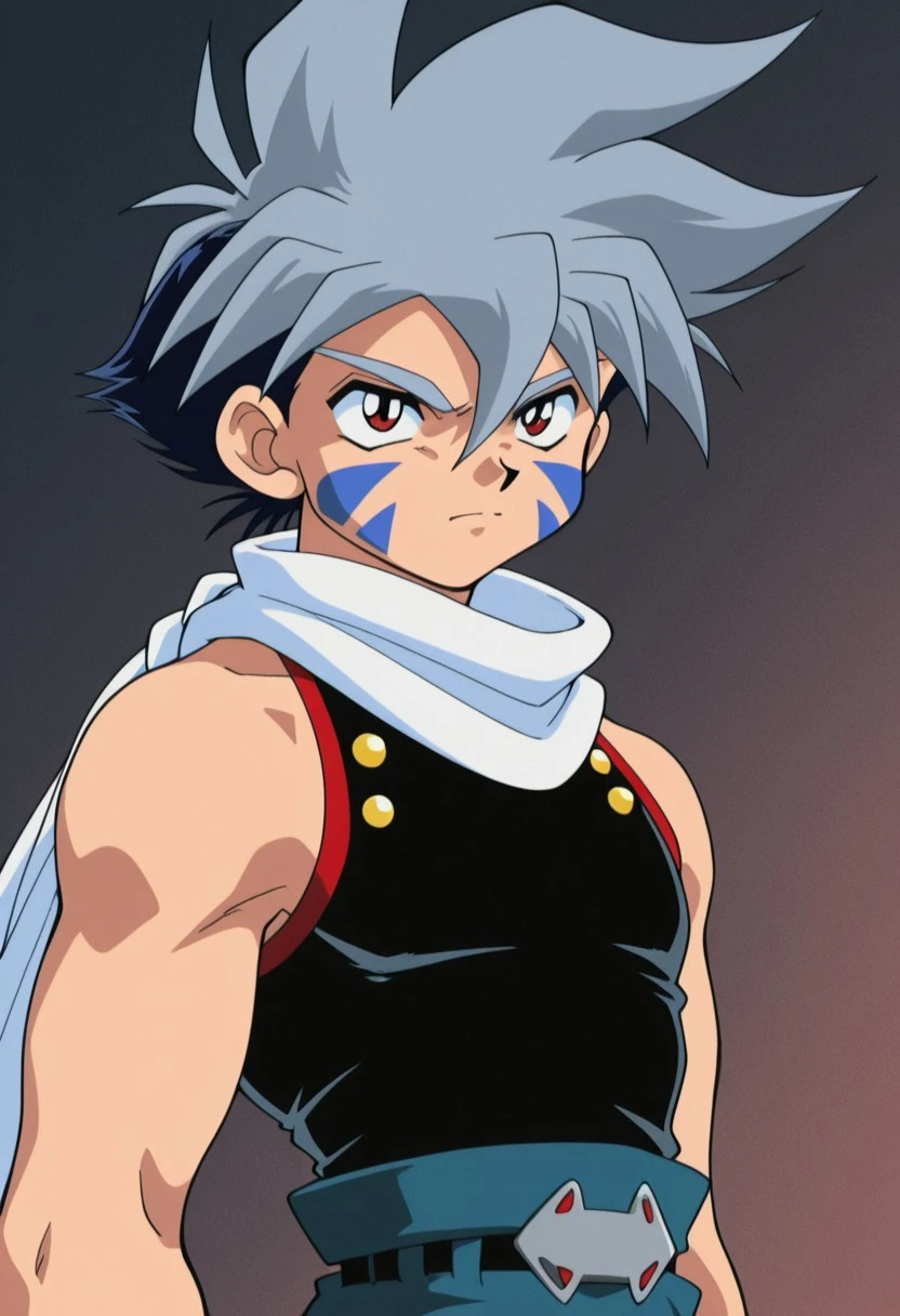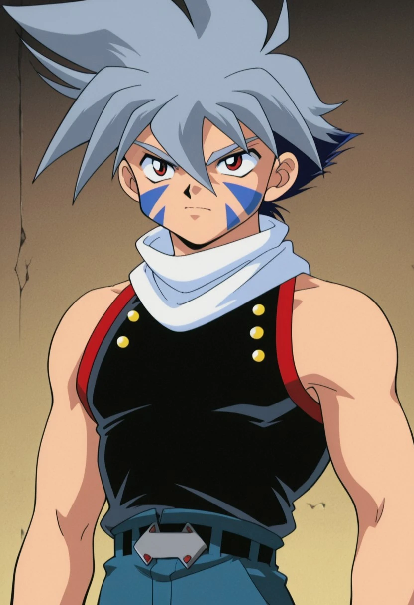 kaihiwa, 1boy, male focus, solo, facial tattoo, red eyes, grey hair, white scarf, black shirt, sleeveless, belt, blue pants, baggy pants, bridal gauntlets, black footwear,