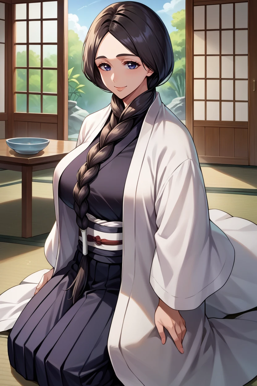 Add "white coat, black kimono, black skirt, hakama skirt" for her typical look.