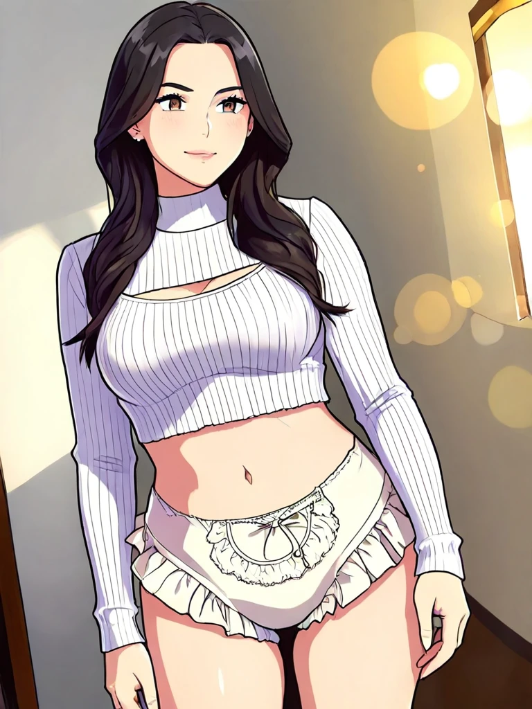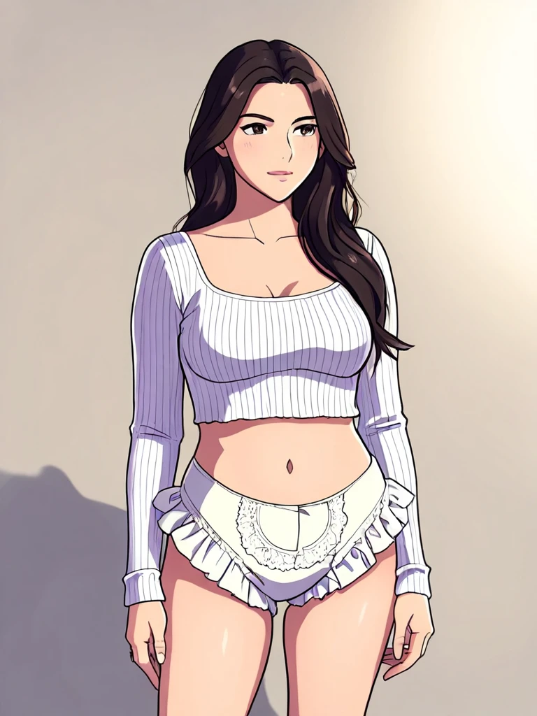 Cream/tan colored ribbed long sleeve crop top with detailed frilly shorts to match