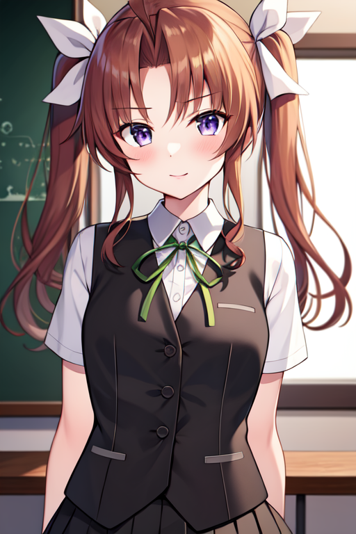 Default outfit: kageroukainiKC, long hair, gloves, twintails, hair ribbon, ahoge, shirt, school uniform, white shirt, short sleeves, black gloves, vest, neck ribbon,pleated skirt,bike shorts,fingerless gloves,