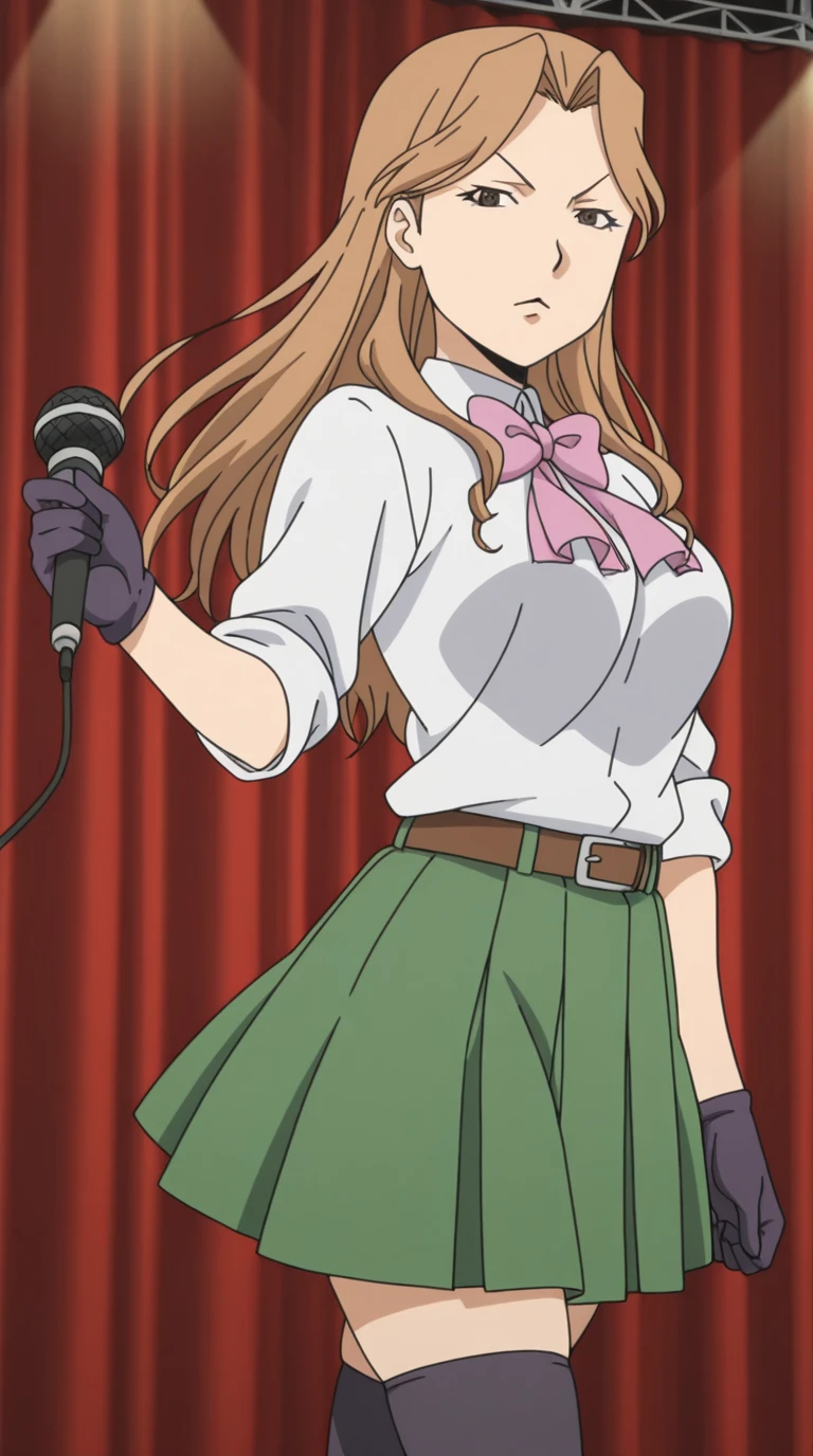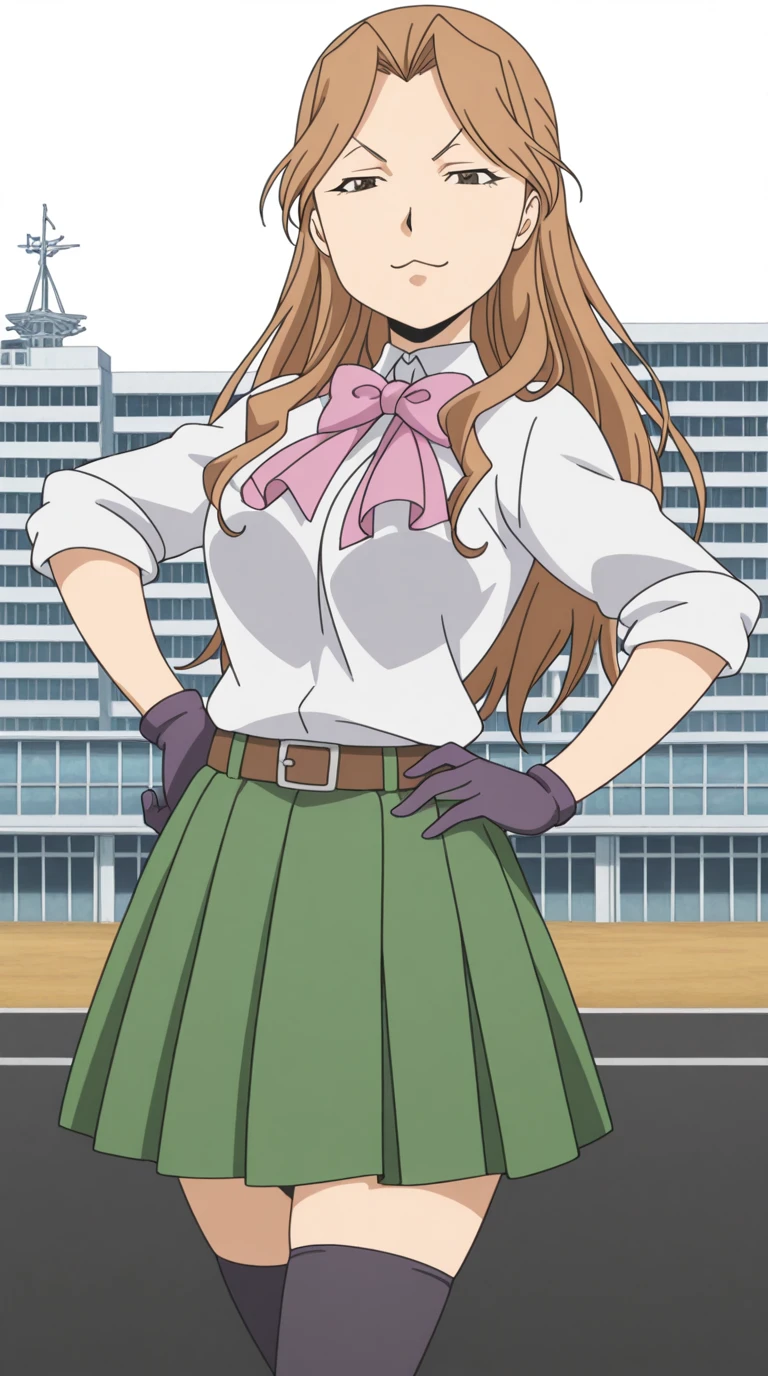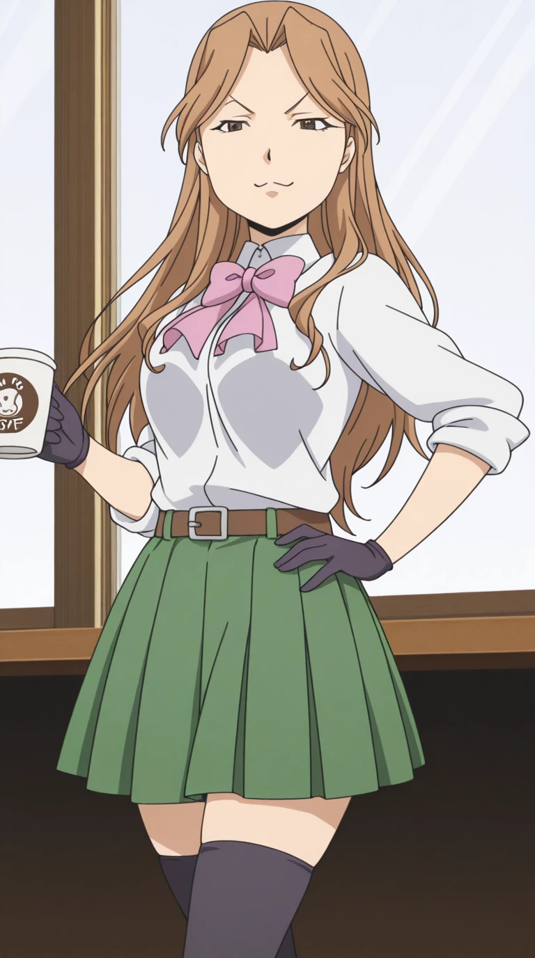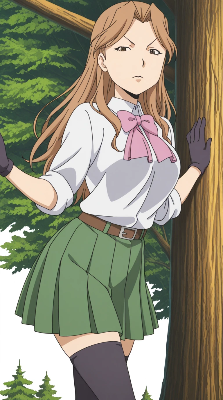 skirt, gloves, thighhighs, bow, black thighhighs, pink bowtie, pleated skirt, green skirt, belt, sleeves rolled up, collared shirt, white shirt