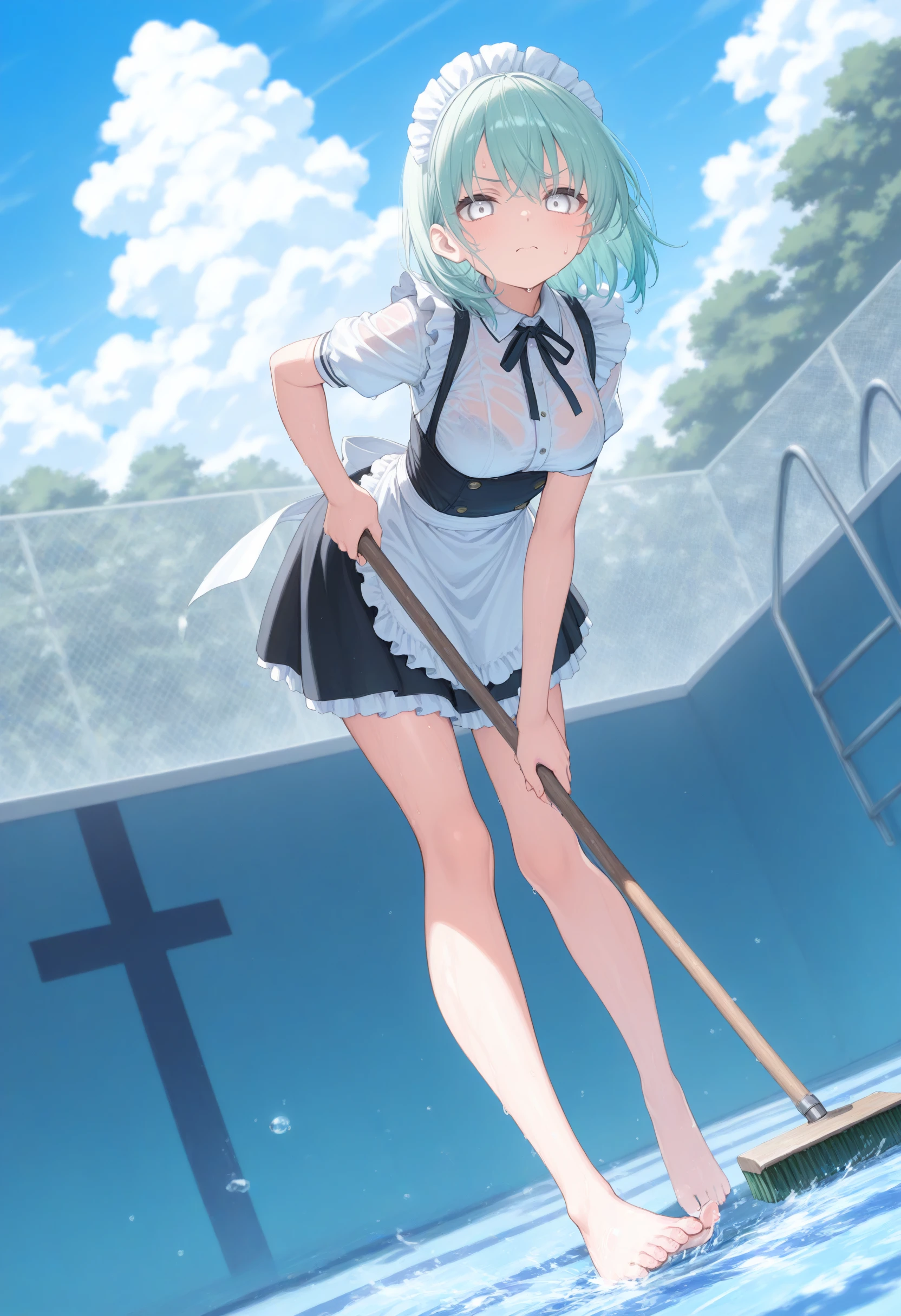 状況的に pool, water, day, outdoors, wet, sky,sunlight, wet clothes, water drop, splashing, lens flare, wet hair, sweatdrop 辺りから必要なものを入れ、服装は水着でも体操着でも制服でも好きなものを、後は holding hose ,hose と broom, barefoot, holding broom, cleaning のどちらかもしくは両方でブラシやホースを持ちます。