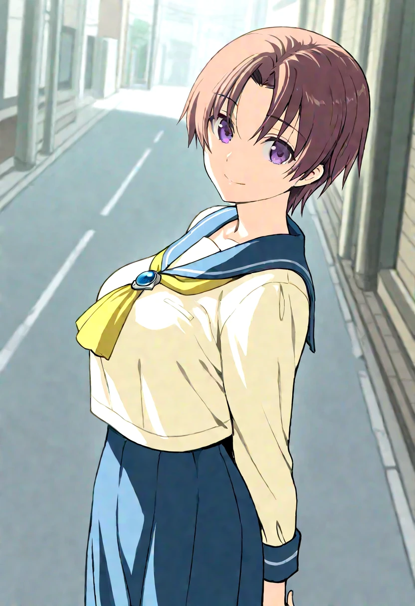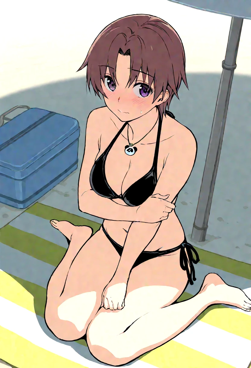 1girl,shishido_yui,very short hair,brown hair,purple eyes,parted bangs,