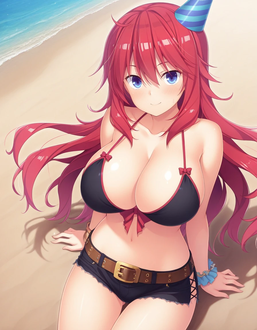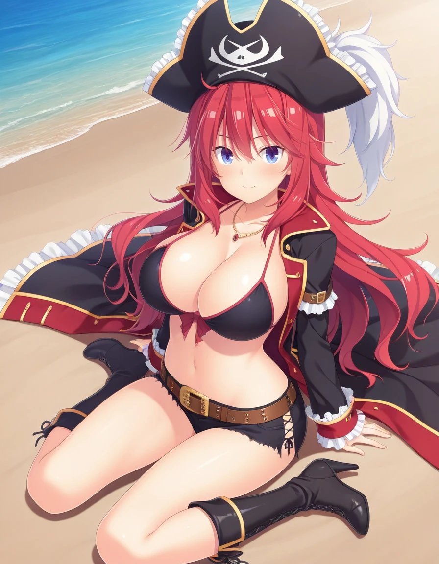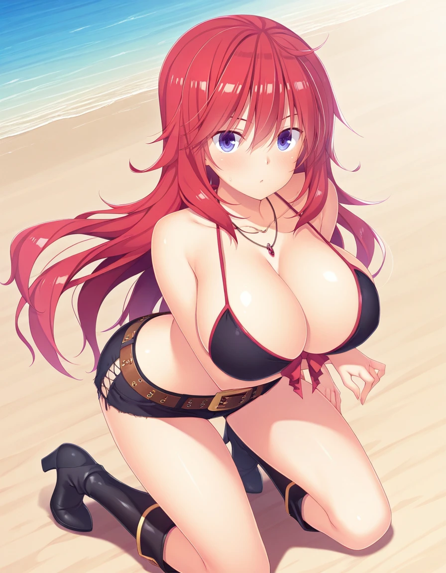 red hair, blue eyes, jewelry, bikini top only, bikini, high heels, knee boots, necklace, swimsuit, belt, short shorts, high heel boots,