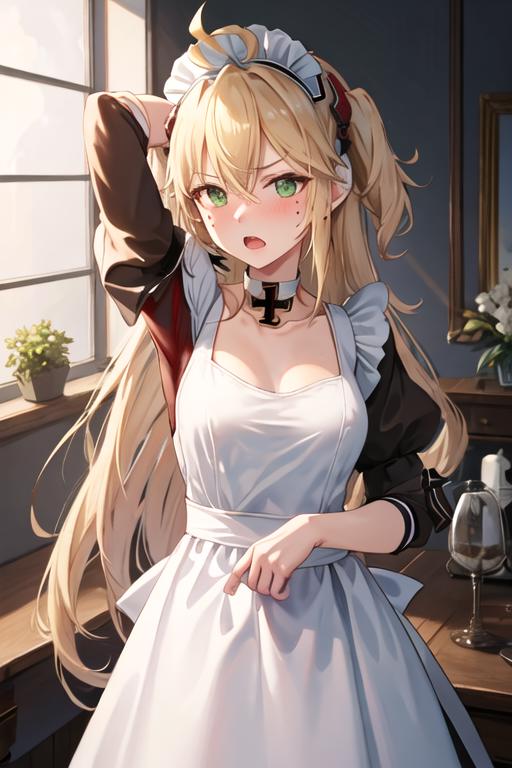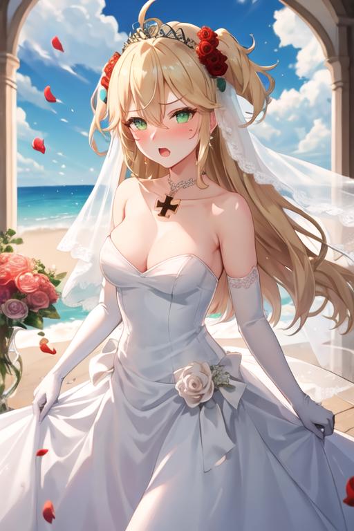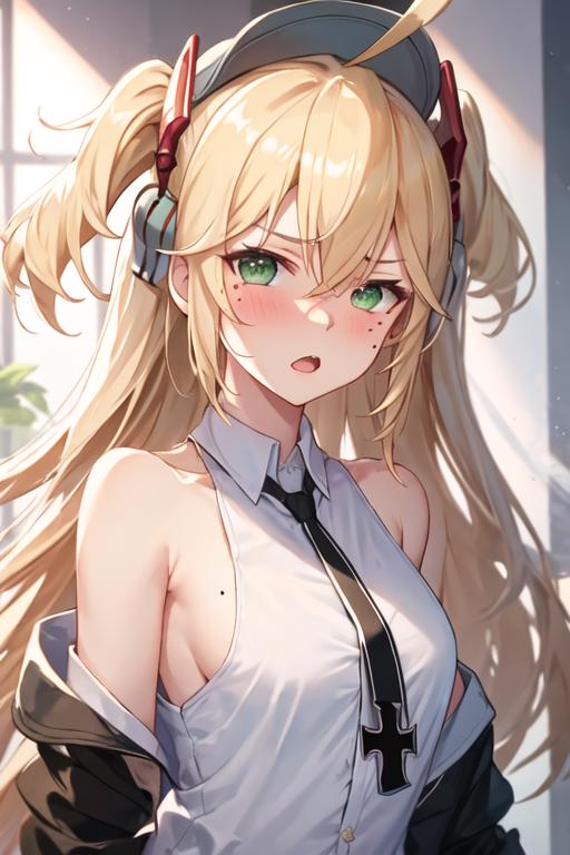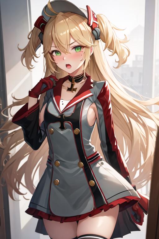 The trigger word is admiral_hipper_azurlane, and the recommended tags are best quality, masterpiece, highres, solo, {admiral_hipper_azurlane:1.15}, blonde_hair, long_hair, green_eyes, two_side_up, bangs, hair_between_eyes, ahoge, blush, cross, mole, iron_cross, breasts, open_mouth, mole_under_eye, collarbone, hat.