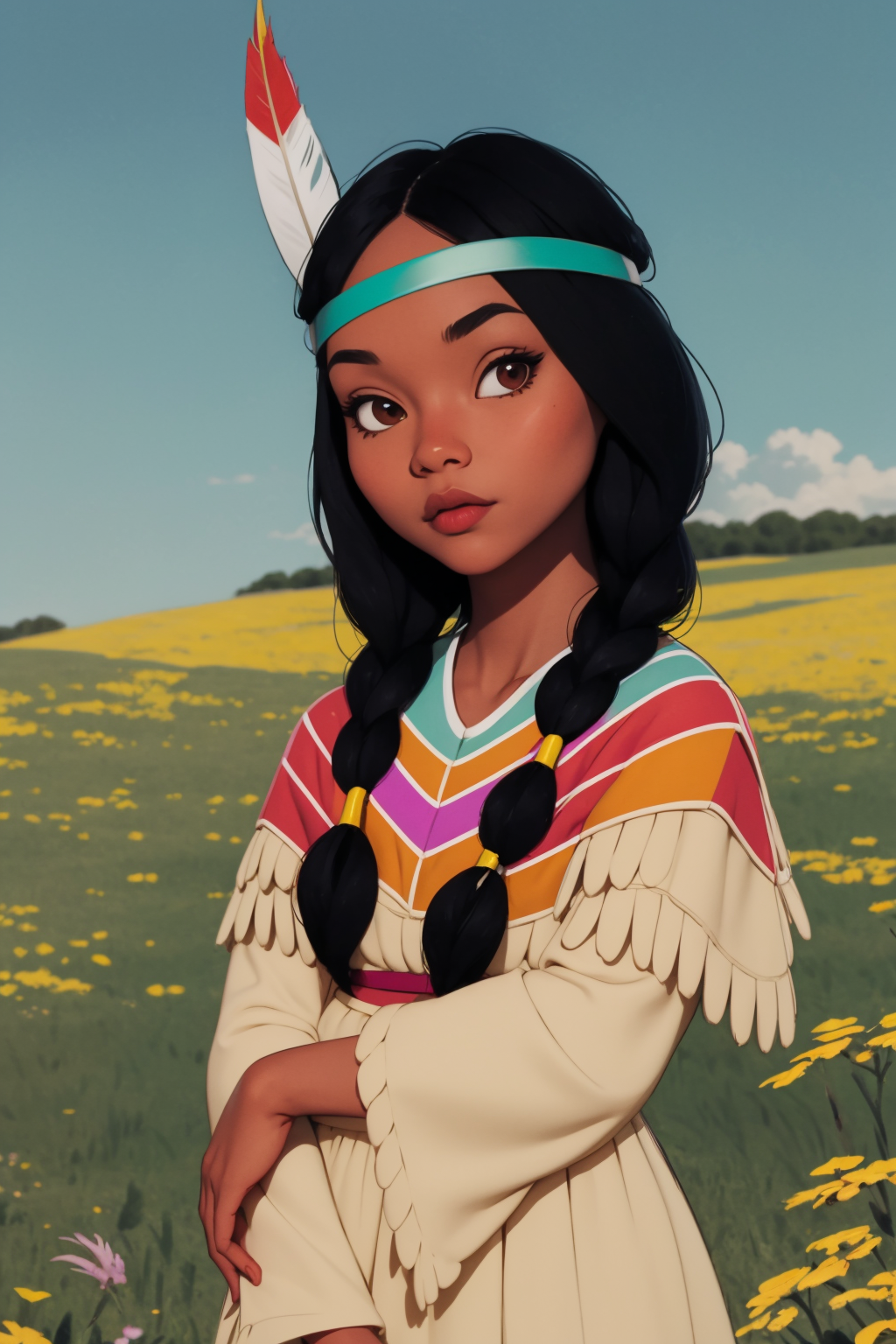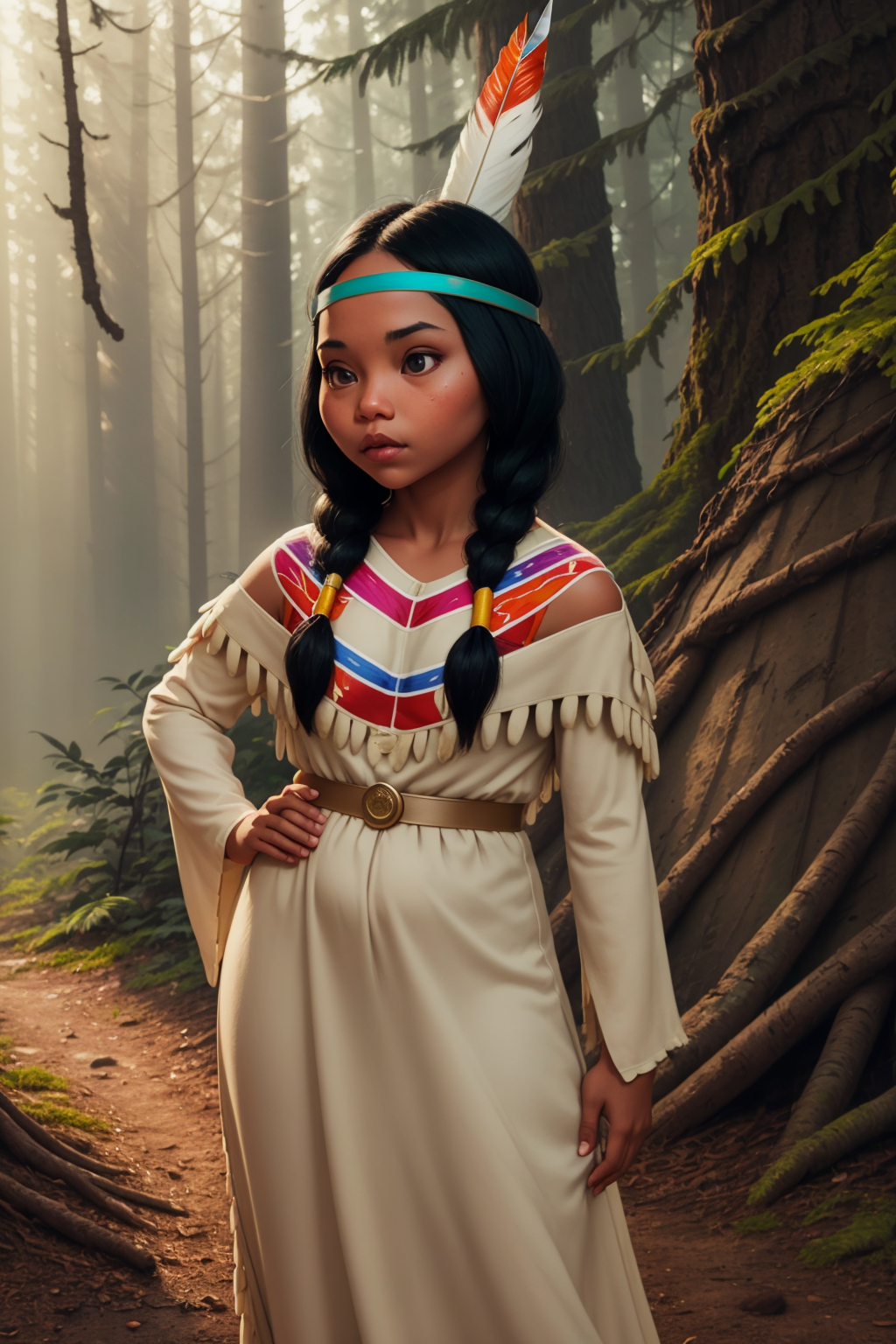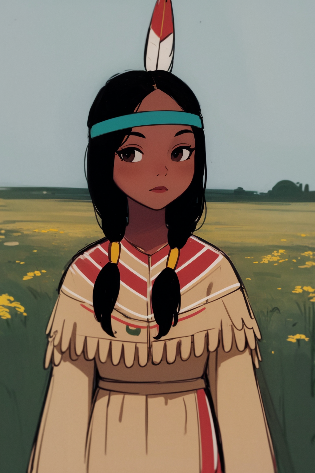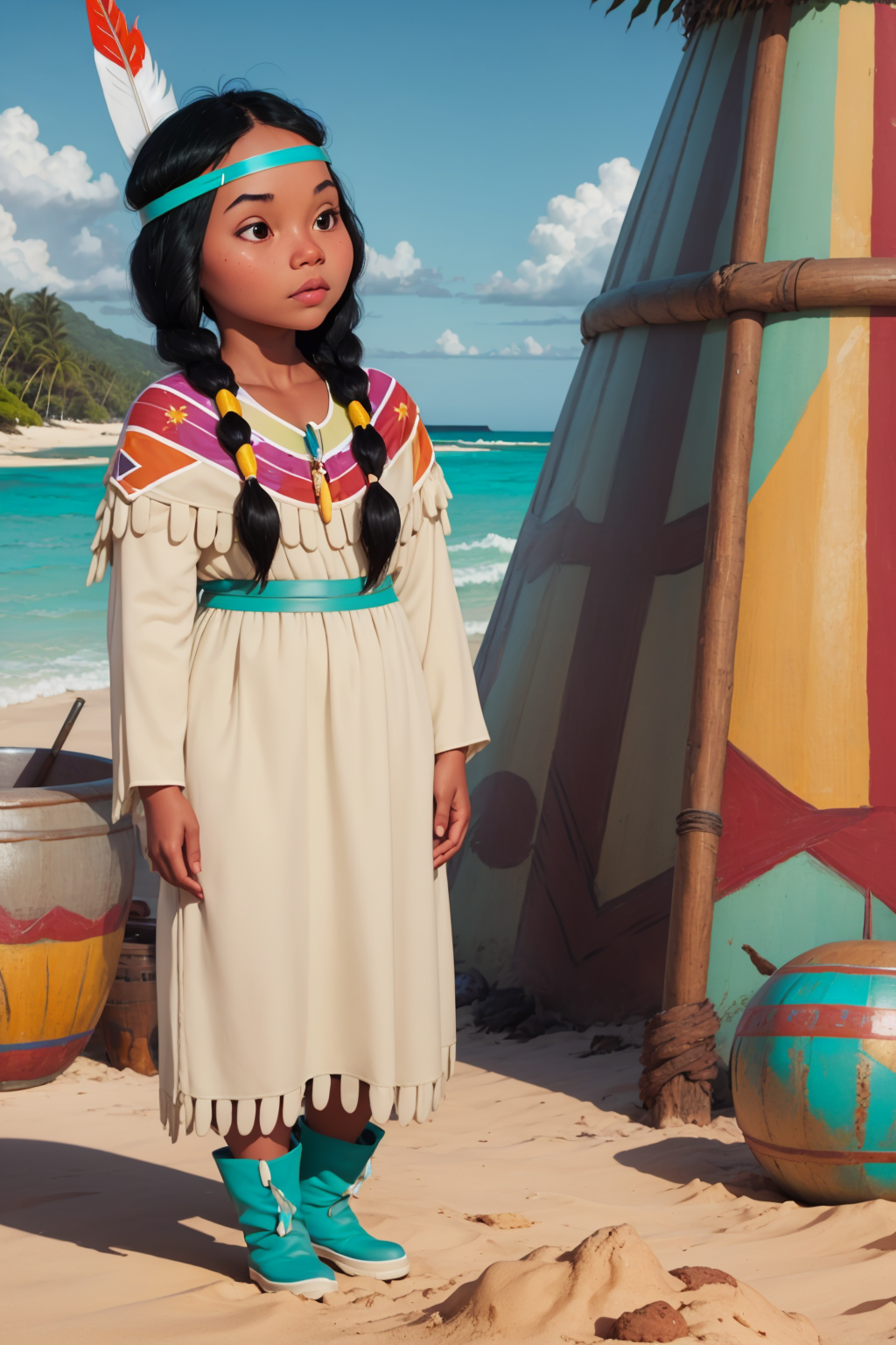 Other prompts : 1girl, black hair, twintails, feather hair ornament, headband, dark skin, dress, native american, aqua boots