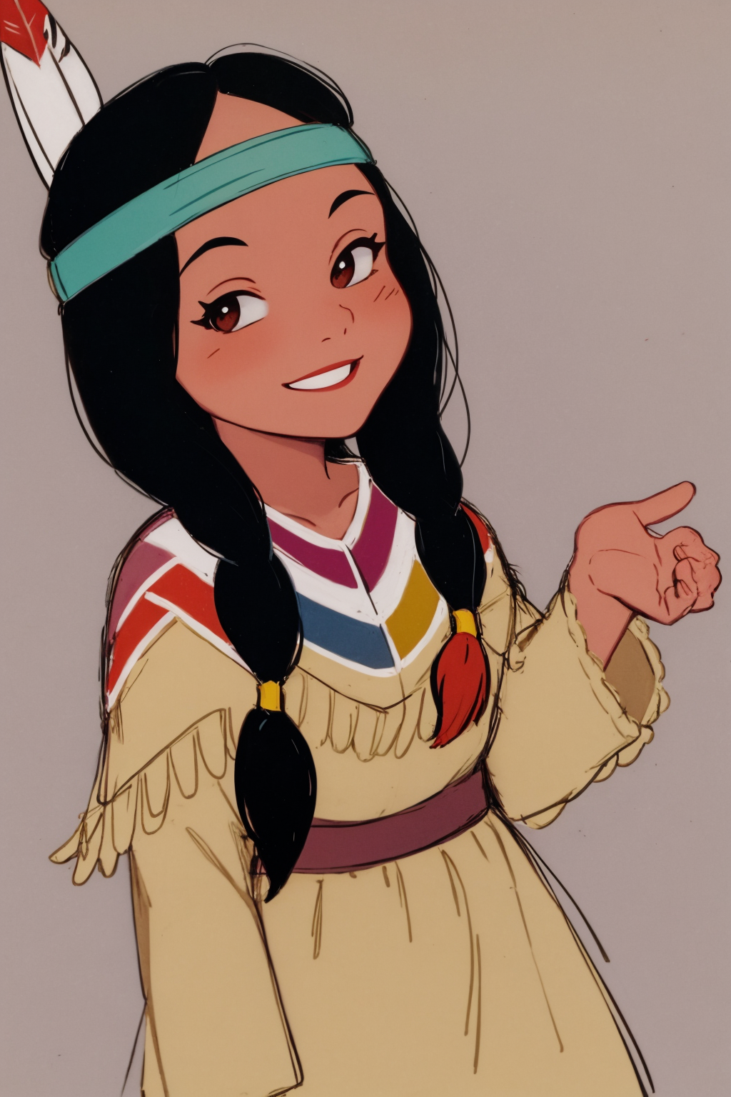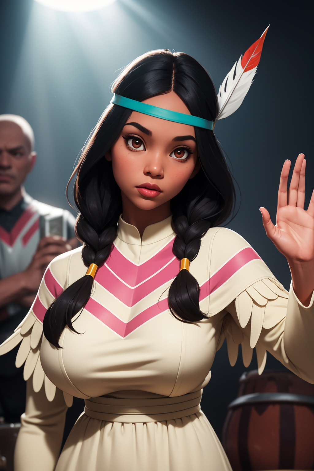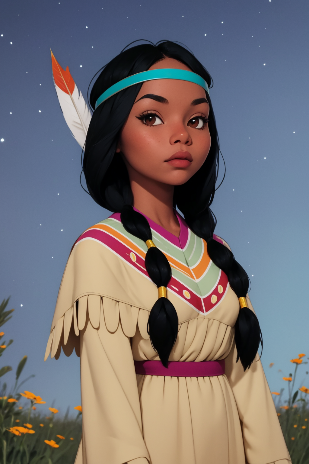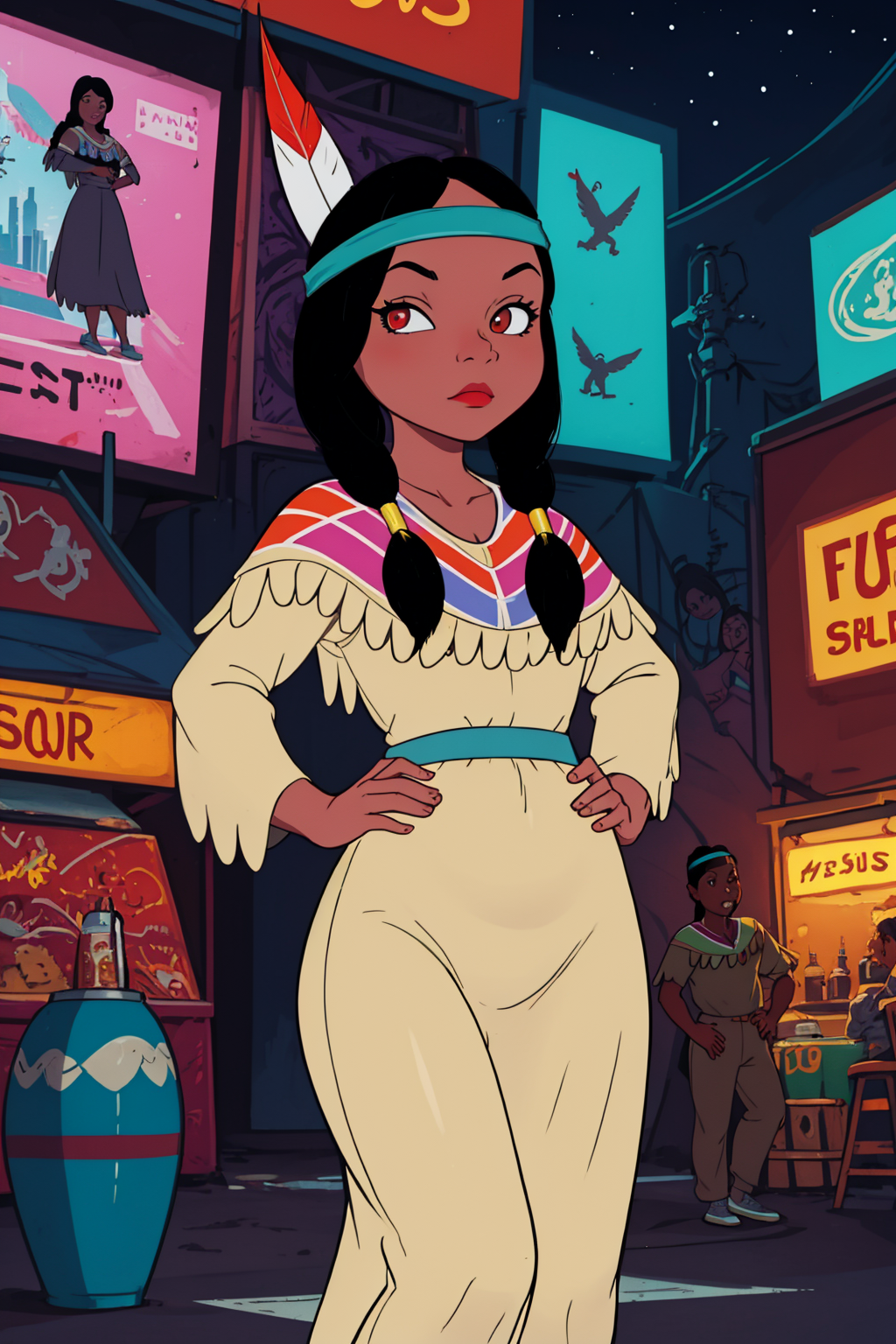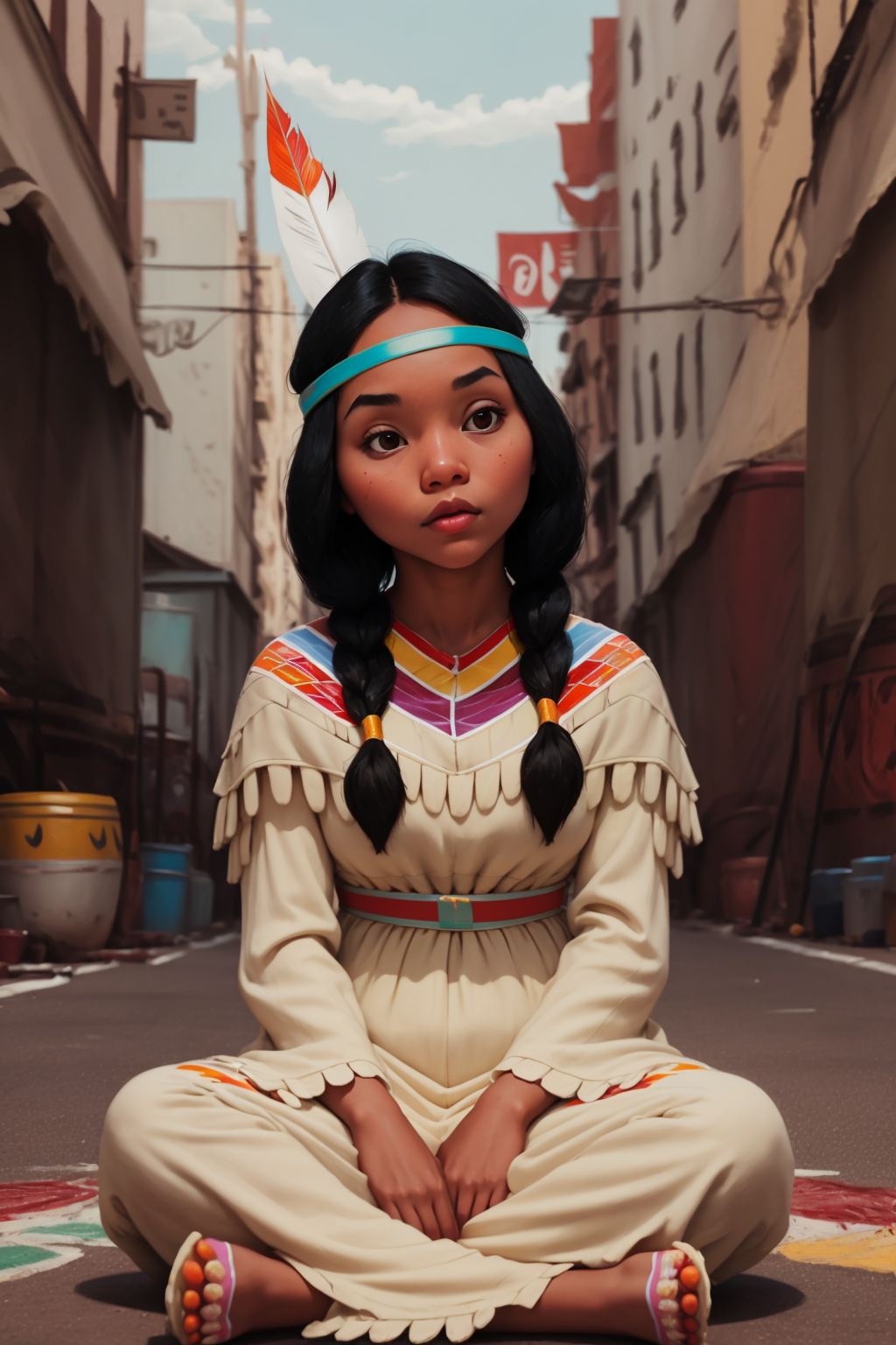 Other prompts : 1girl, black hair, twintails, feather hair ornament, headband, dark skin, dress, native american, aqua boots