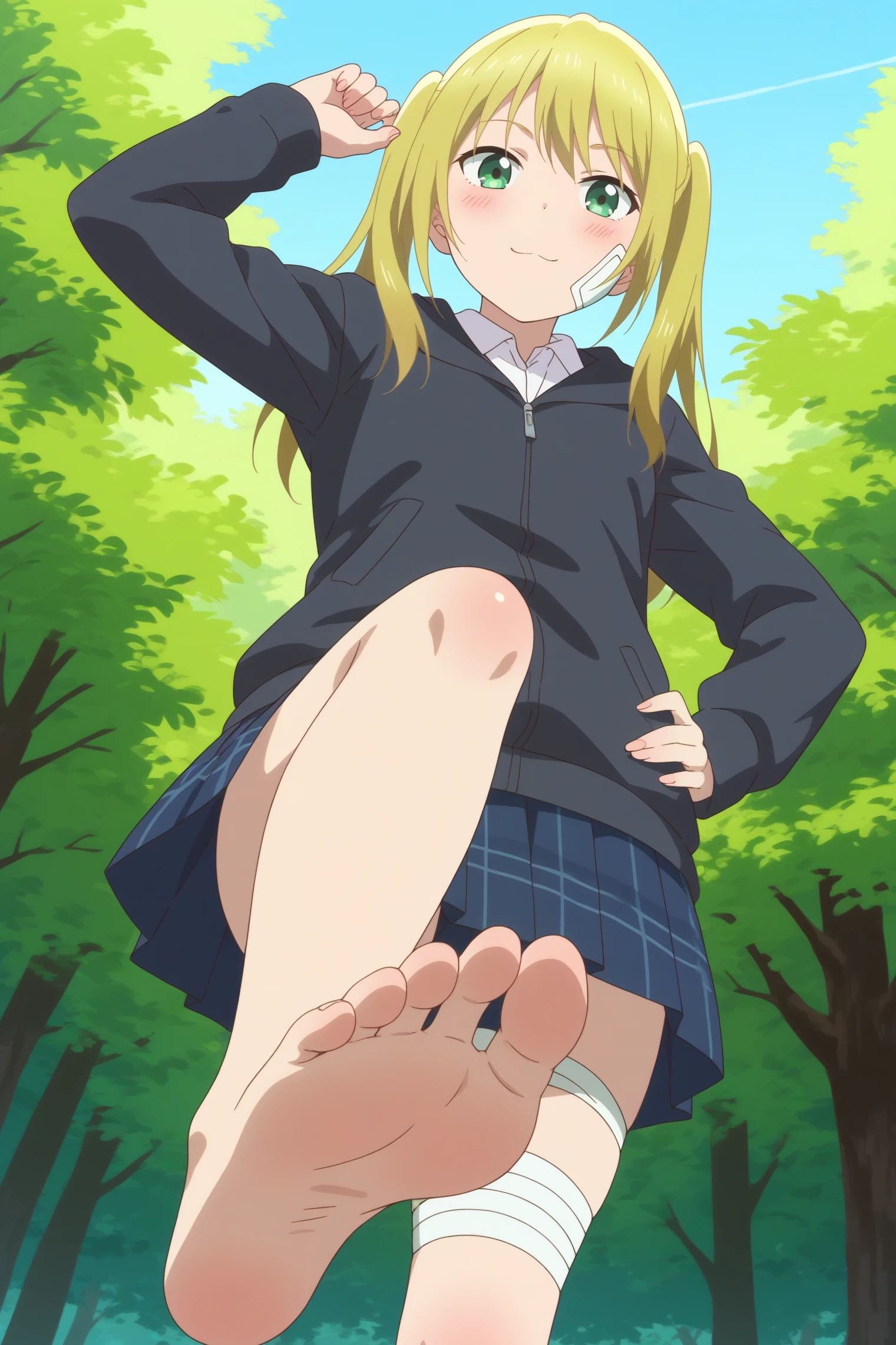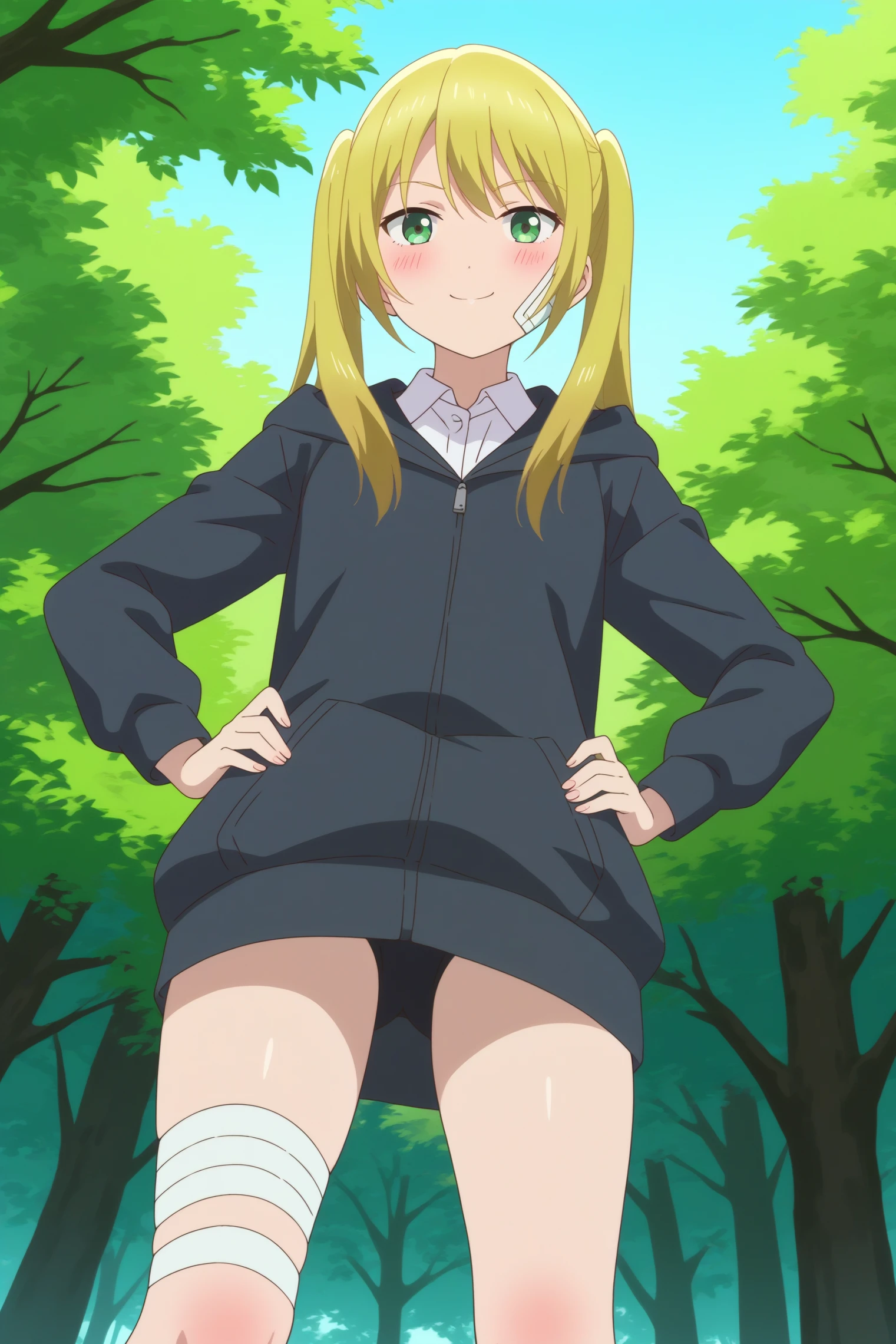 Triggers : 1girl,solo,minami yamamoto,blonde hair,hood,long hair,shirt,hoodie,collared shirt,school uniform,bandage,twintails, thighhigh,stripped