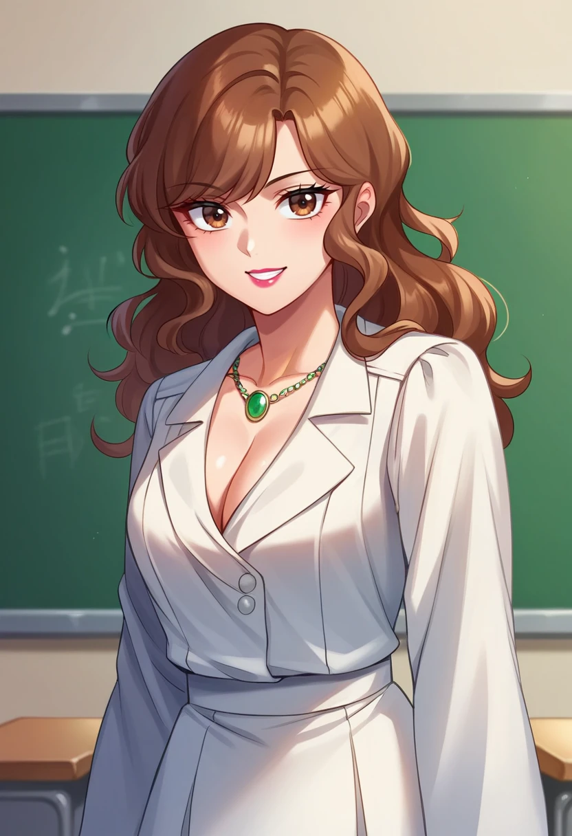 Tags: oharamt, brown hair, long hair, brown eyes, lipstick, green necklace, white jacket, cleavage, white skirt
