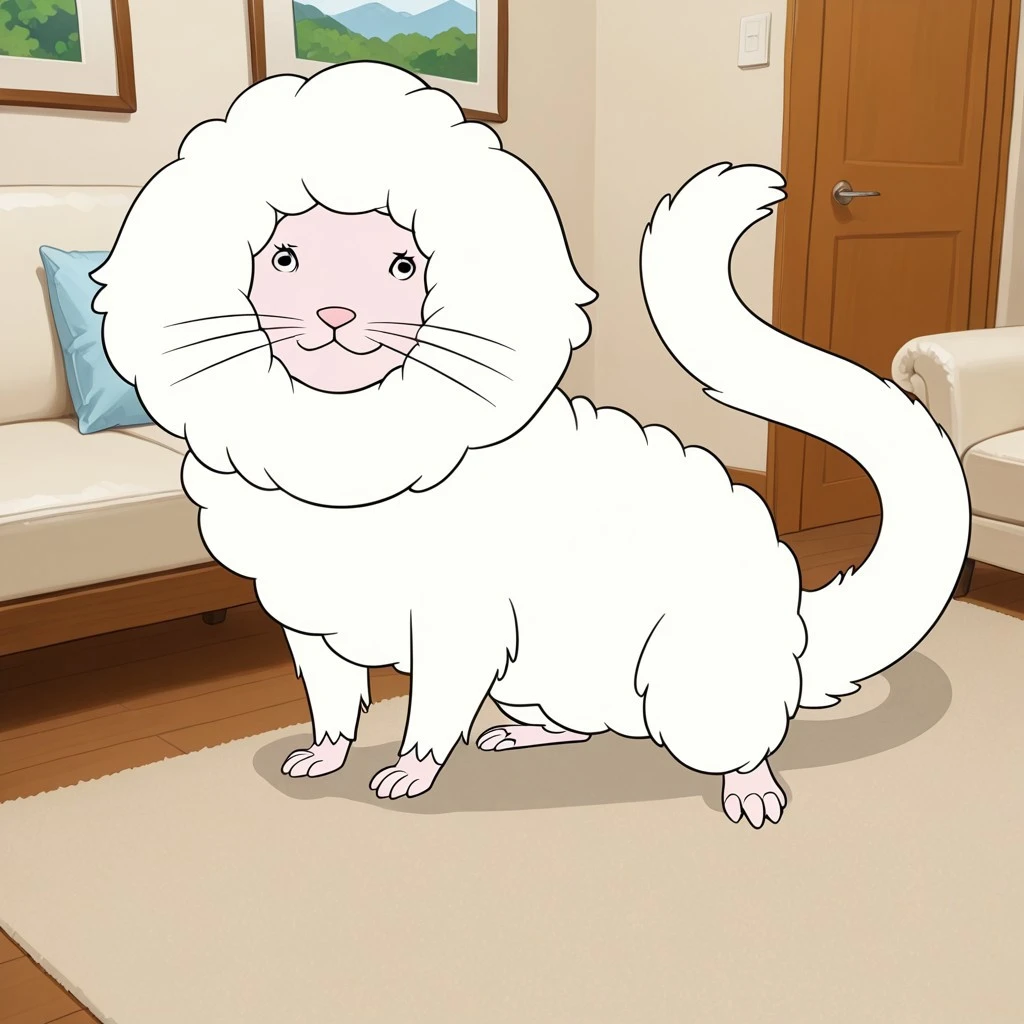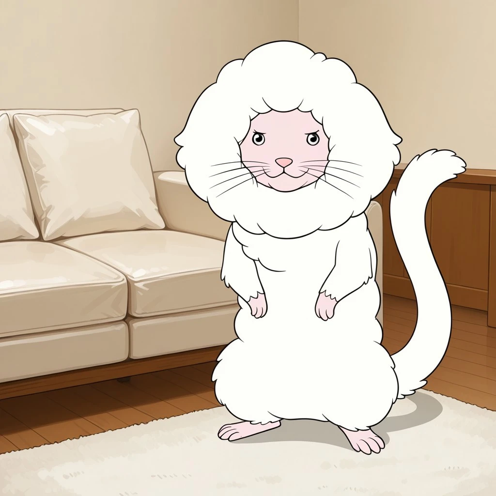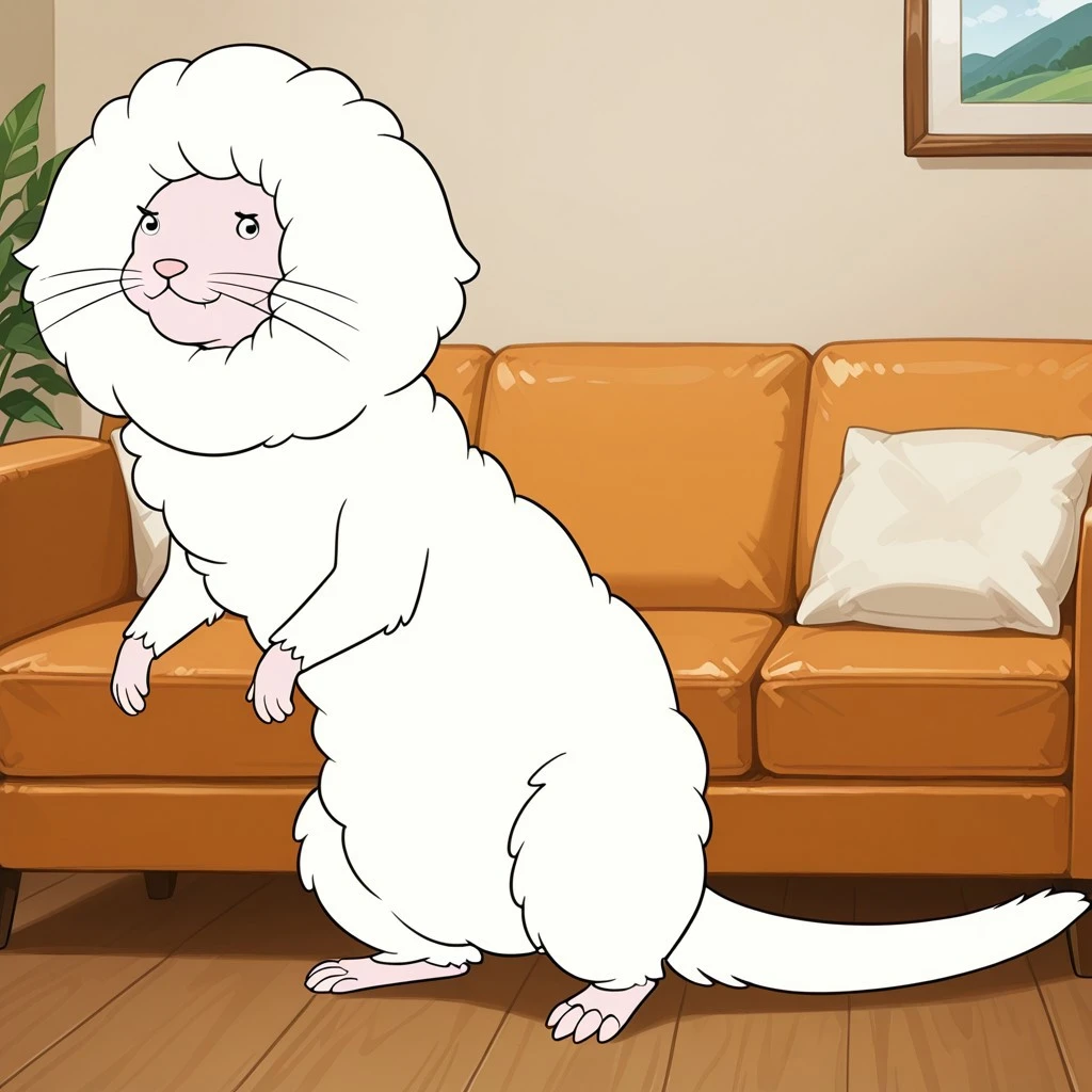 ferret, white fur, fluffy fur, hairless face, pink nose, whiskers, black eyes, hairless hands, hairless toes, tail,