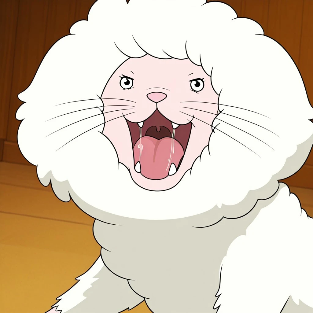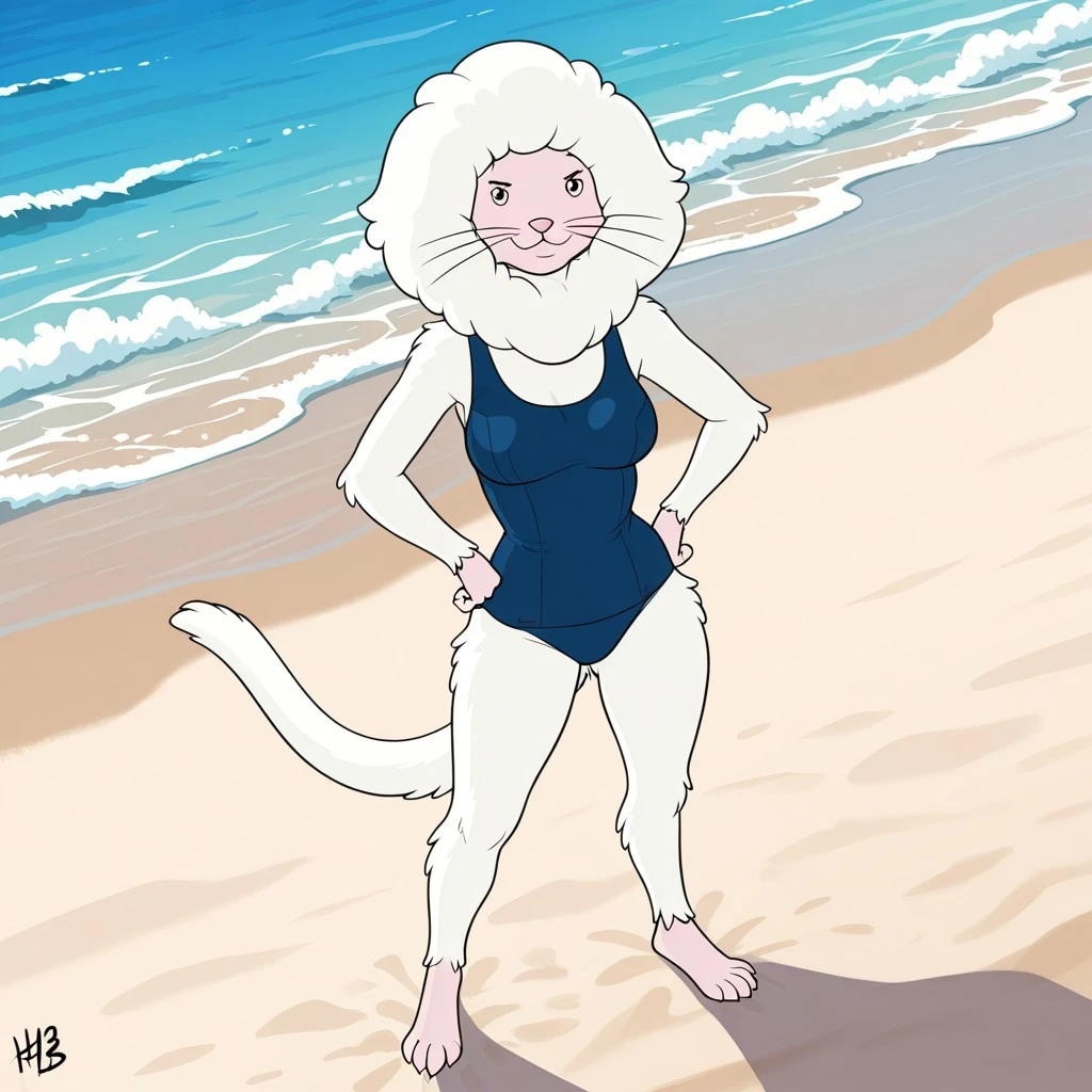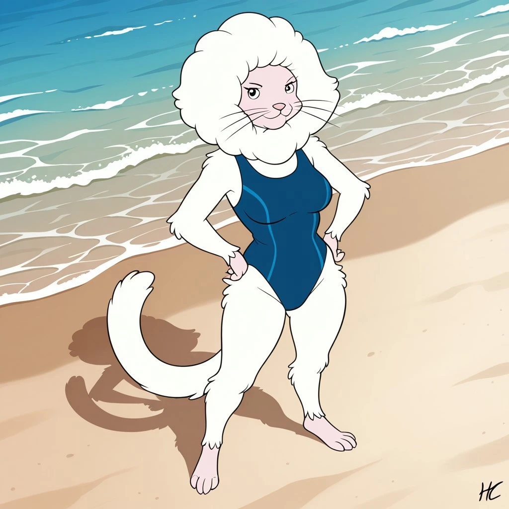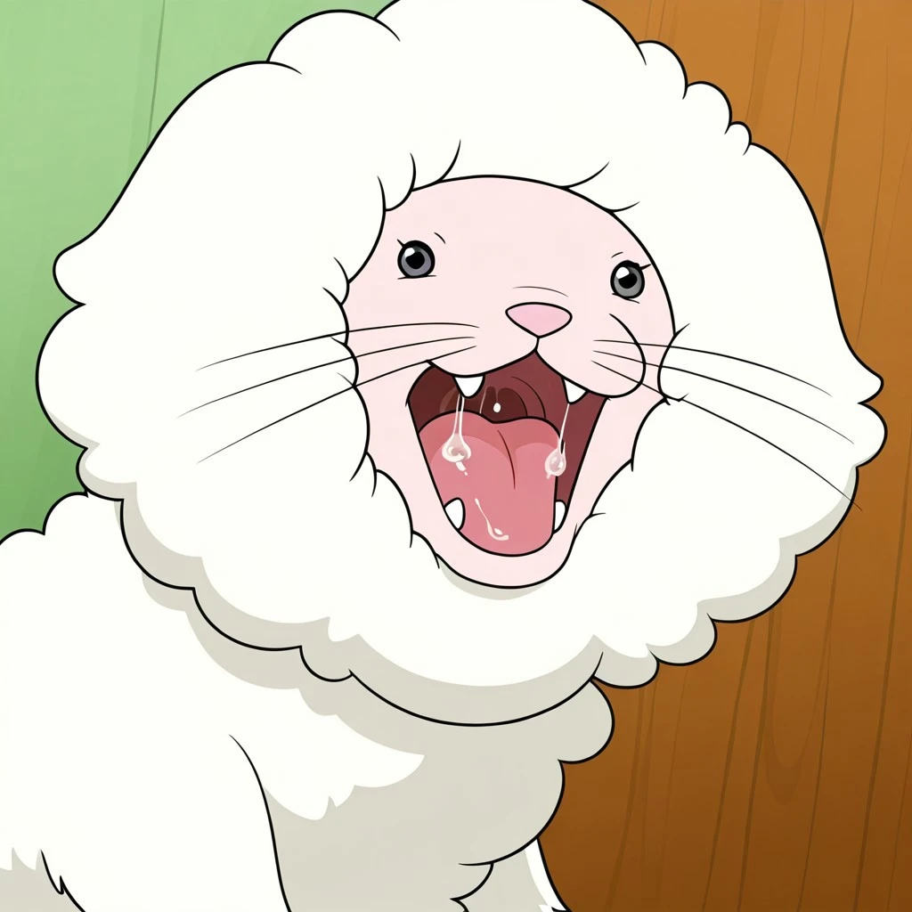 ferret, white fur, fluffy fur, hairless face, pink nose, whiskers, black eyes, hairless hands, hairless toes, tail,