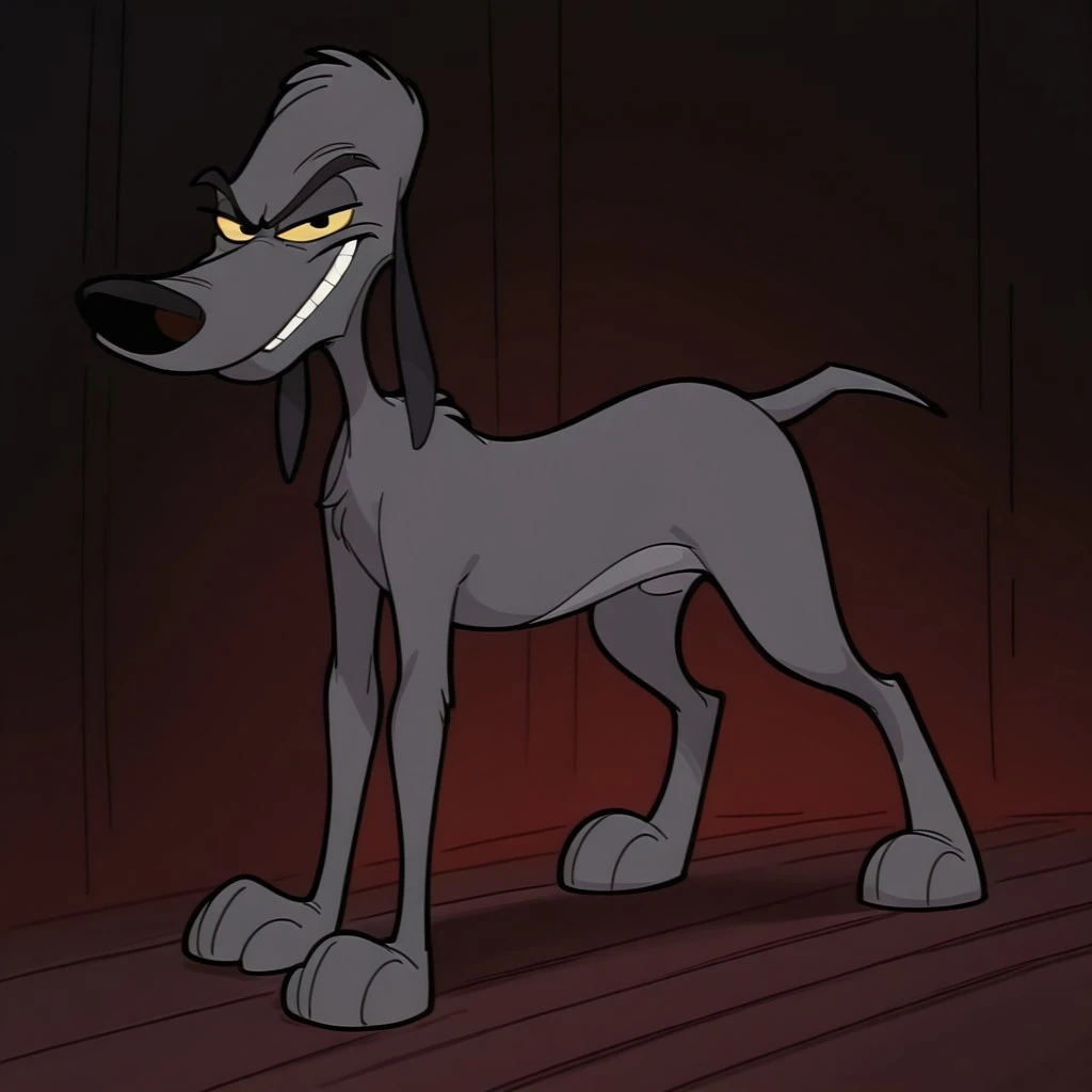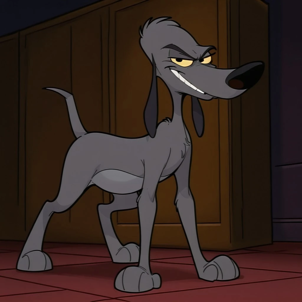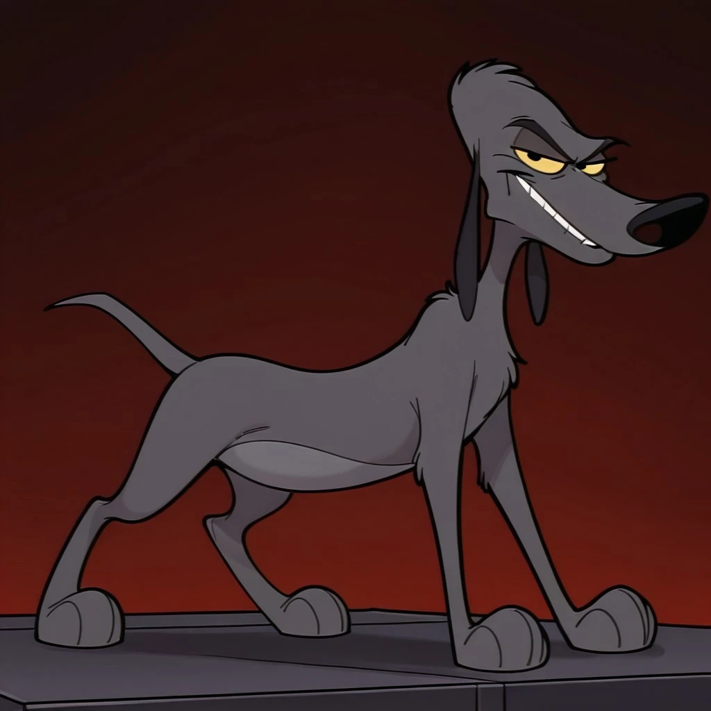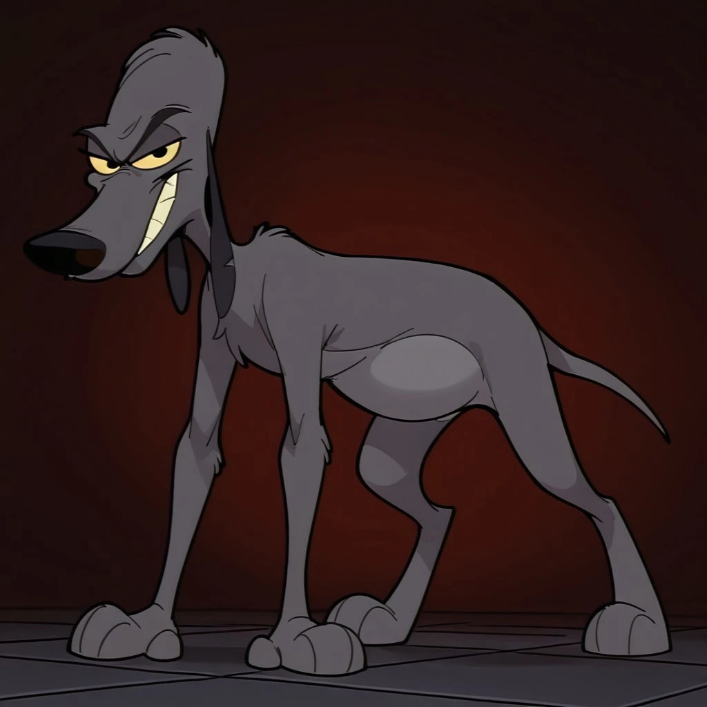 mooch, male, dog, disney, grey fur, dark grey ears, light grey belly, yellow sclera, black eyes