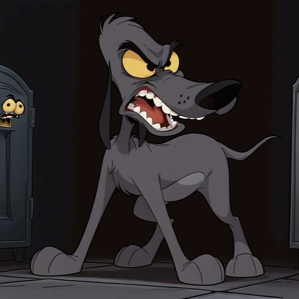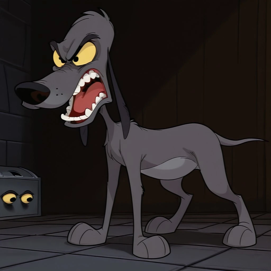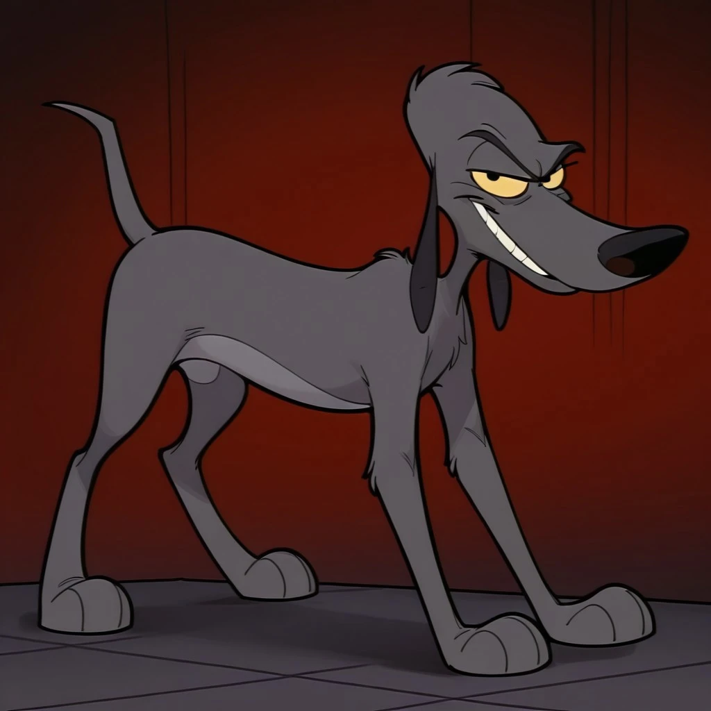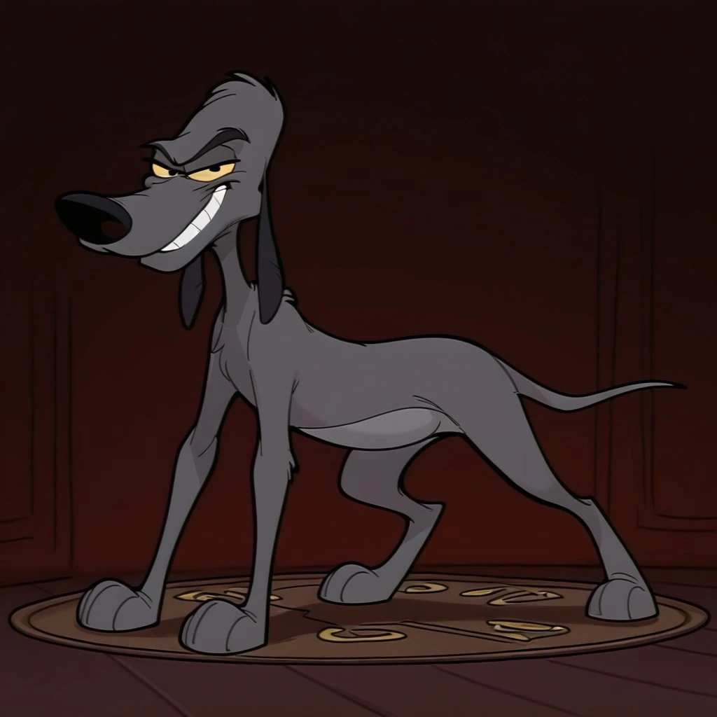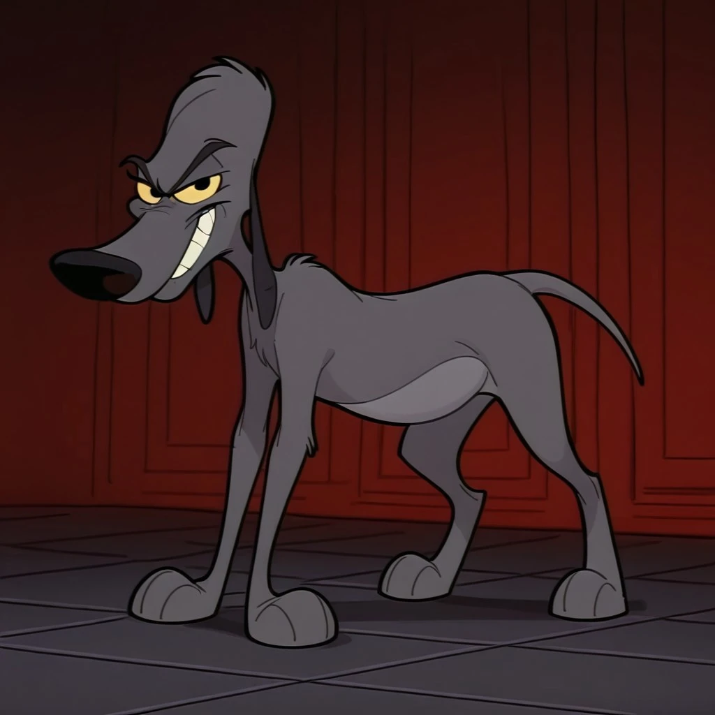 mooch, male, dog, disney, grey fur, dark grey ears, light grey belly, yellow sclera, black eyes