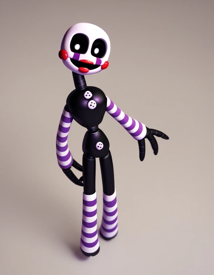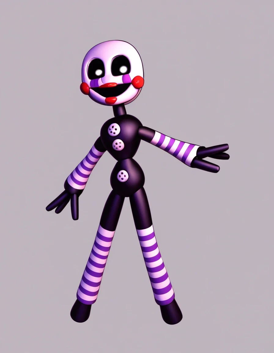 Adventure_PuppetFNAF, 1girl white eyes, open mouth, striped, no humans, black skin, robot girl, female, White mask with black eye sockets, red lips, purple tear marks, red cheeks, three white torso buttons, three fingers on each hand, skinny, lanky, striped legs, striped arms, black sclera, colored sclera