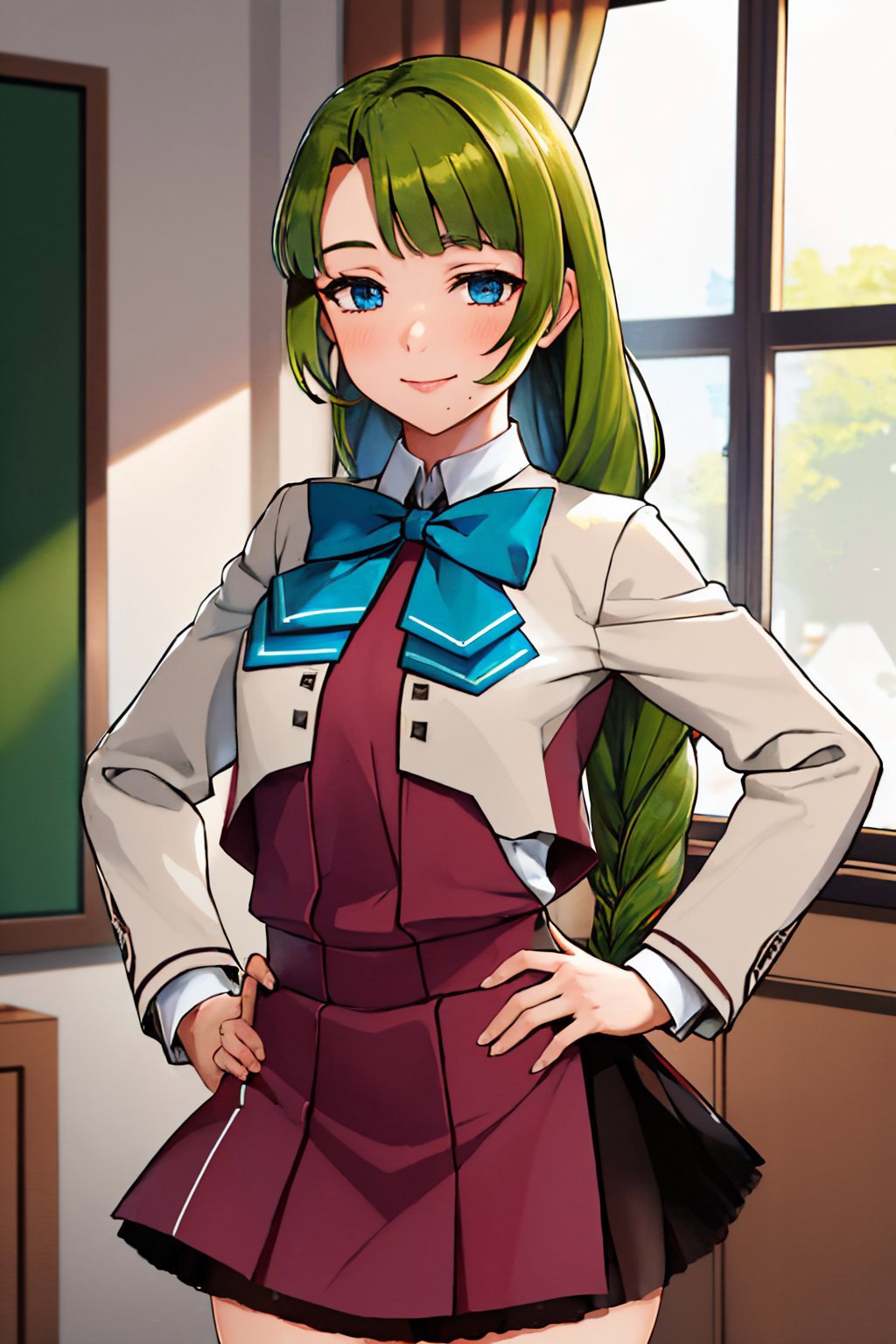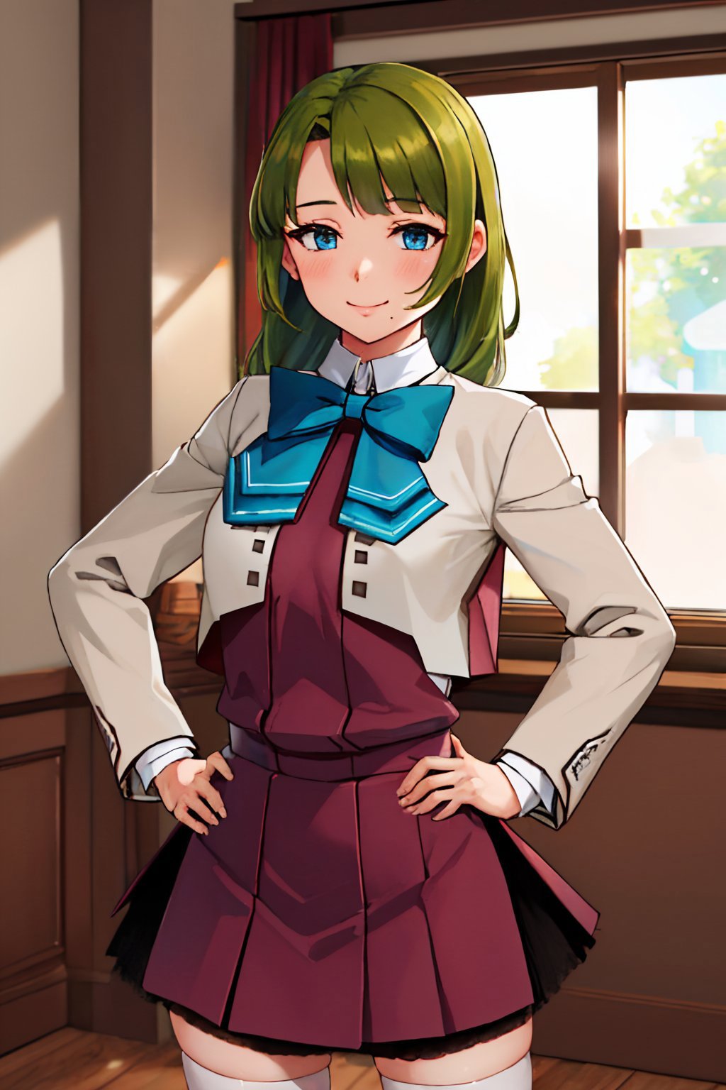 Default Outfit: school uniform, blazer, halterneck, bowtie, long sleeves, grey thighhighs