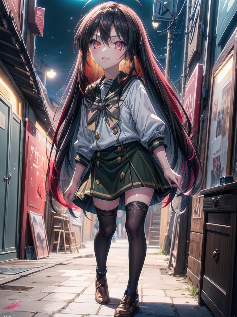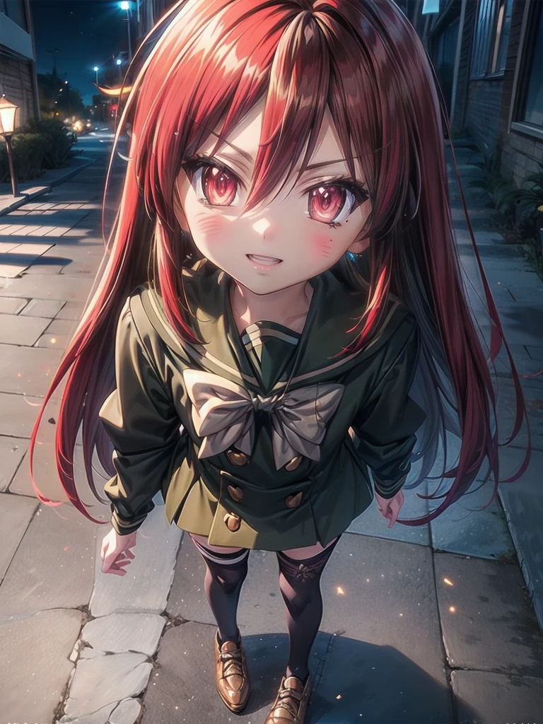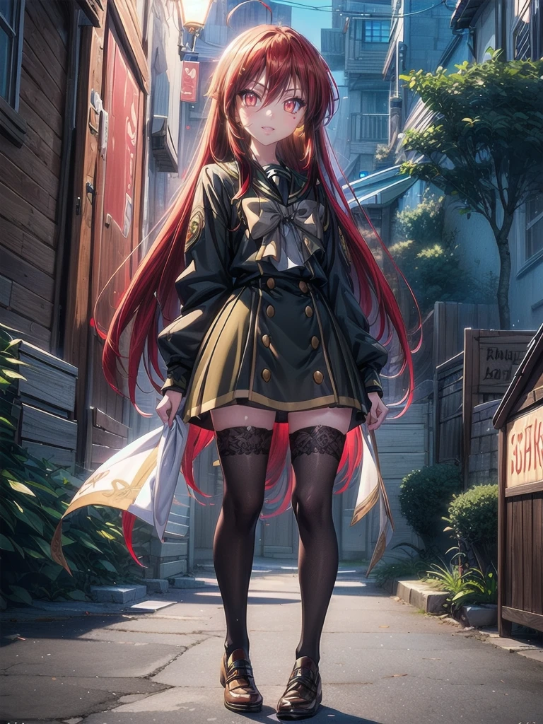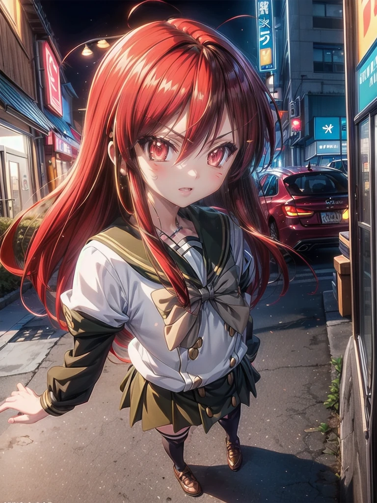 anime style,anime coloring,1girl,long hair,solo,red hair,red eyes,school uniform,serafuku,pendant,jewelry,looking at viewer,anime coloring,hair between eyes,thighhighs,sky,ahoge,zettai ryouiki,night,portrait,serious,cloud,very long hair,parted lips,necklace,blush,shakugan no shana,standing,(((Full Body)))