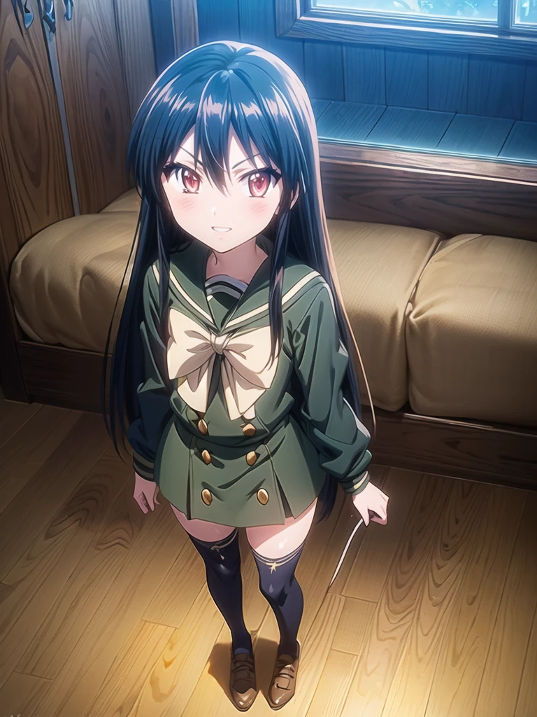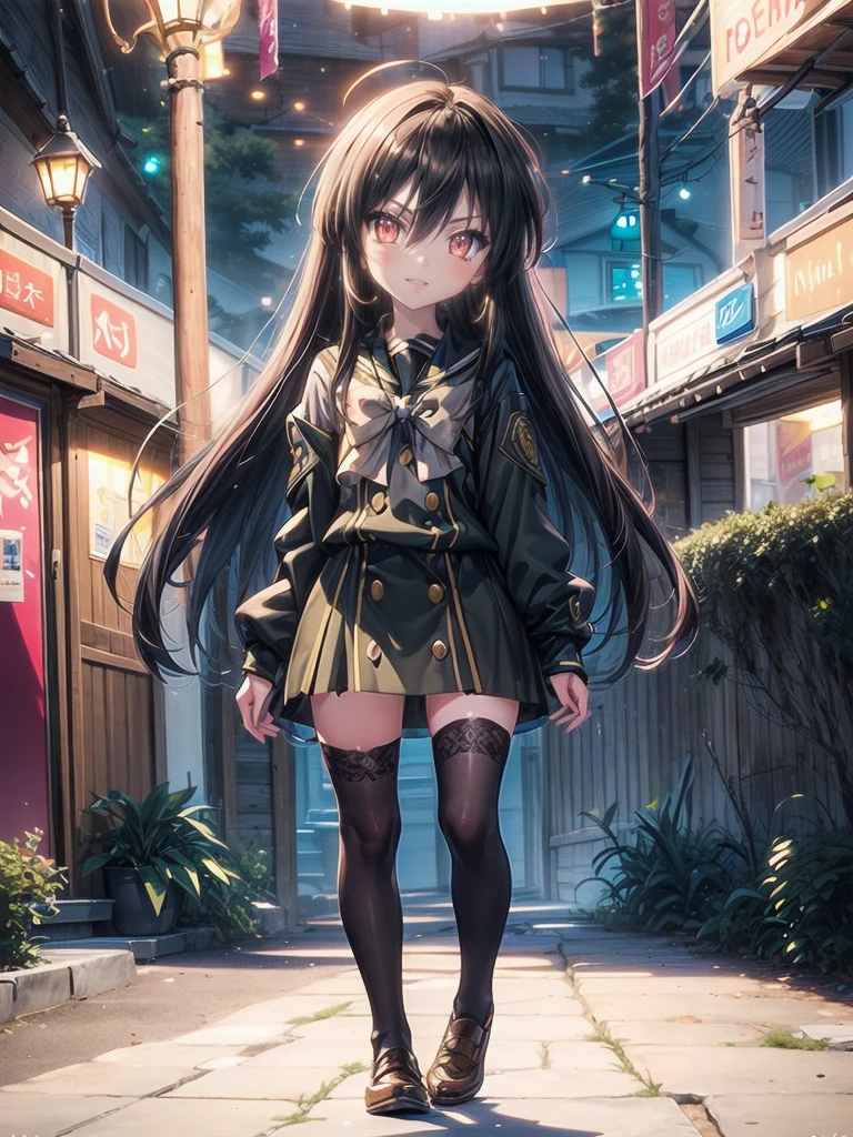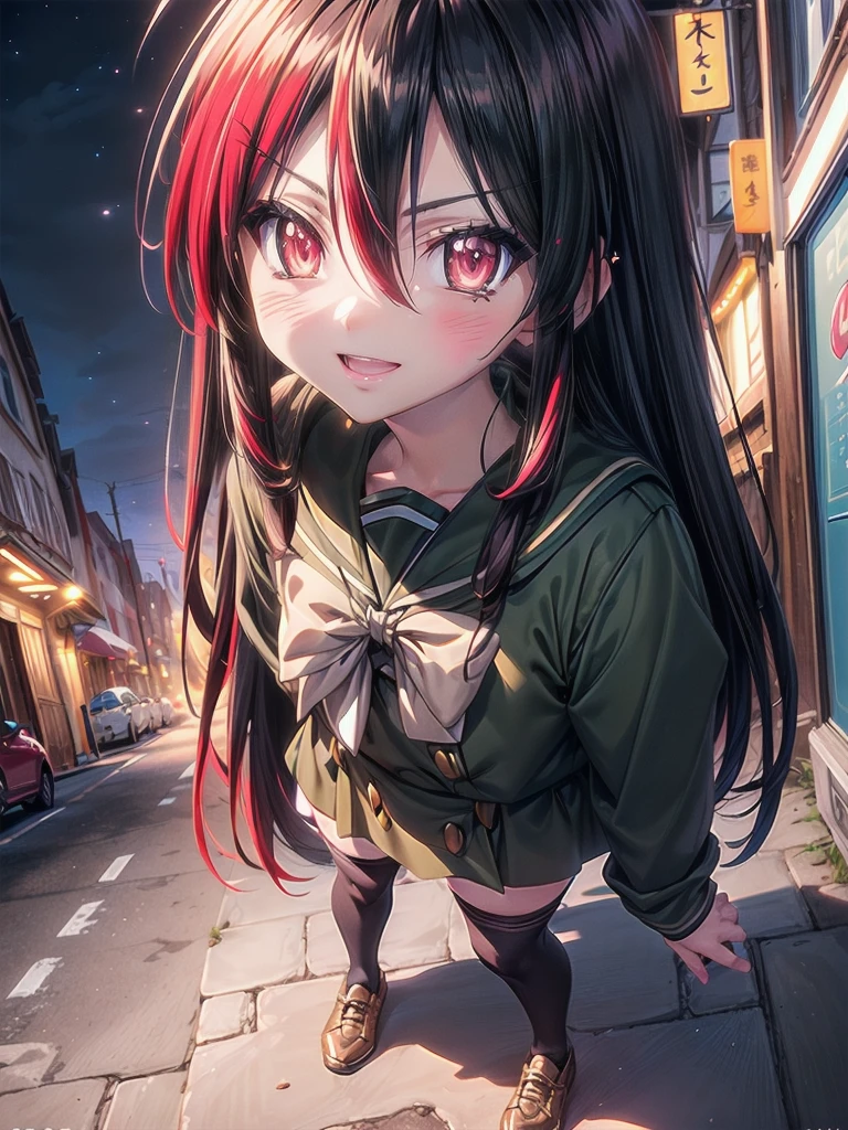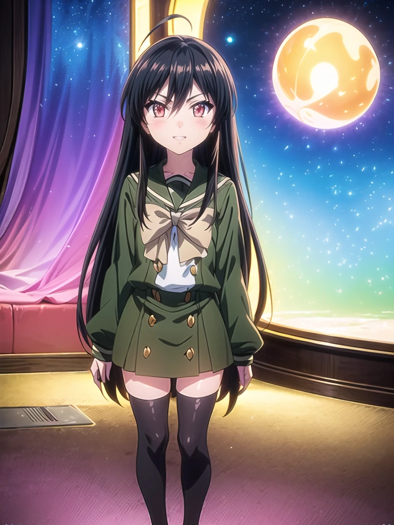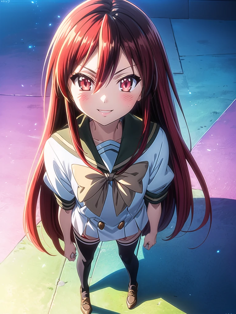 anime style,anime coloring,1girl,long hair,solo,red hair,red eyes,school uniform,serafuku,pendant,jewelry,looking at viewer,anime coloring,hair between eyes,thighhighs,sky,ahoge,zettai ryouiki,night,portrait,serious,cloud,very long hair,parted lips,necklace,blush,shakugan no shana,standing,(((Full Body)))