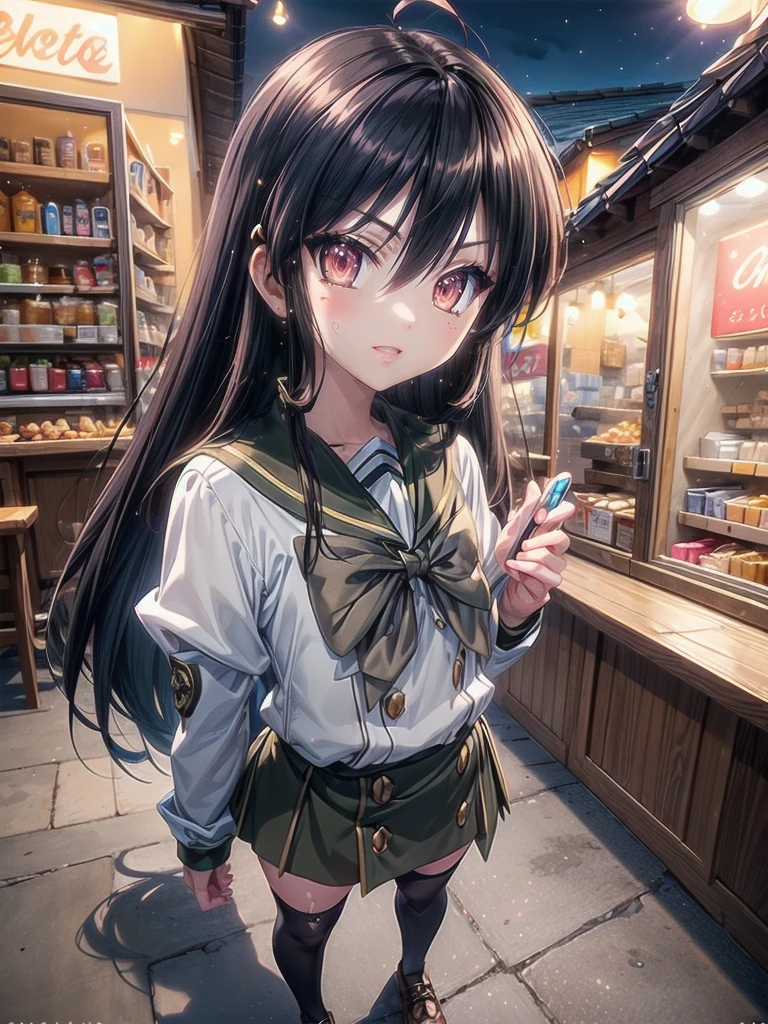 1girl,long hair,solo,black hair,brown eyes,school uniform,serafuku,pendant,jewelry,looking at viewer,anime coloring,hair between eyes,thighhighs,sky,ahoge,zettai ryouiki,night,portrait,serious,cloud,very long hair,parted lips,necklace,blush