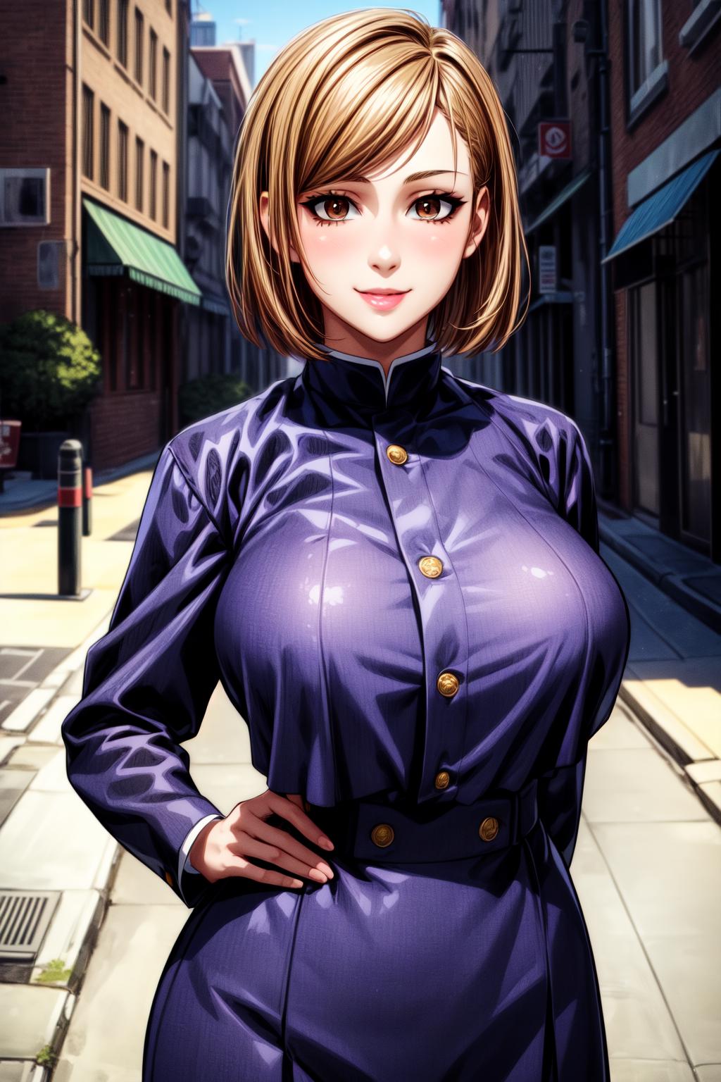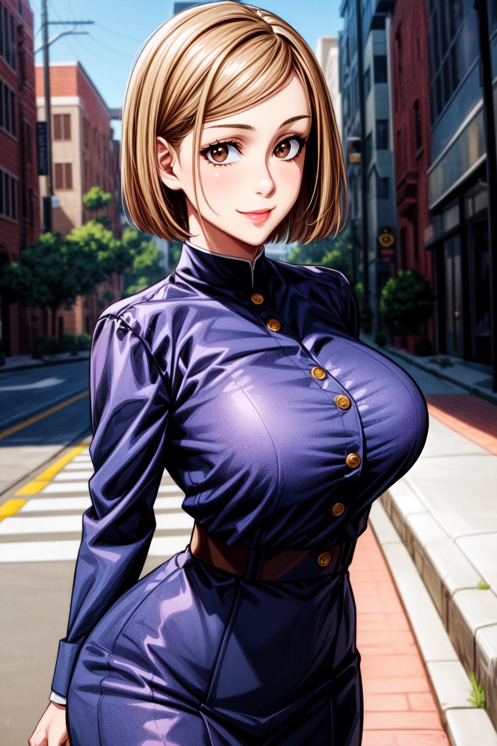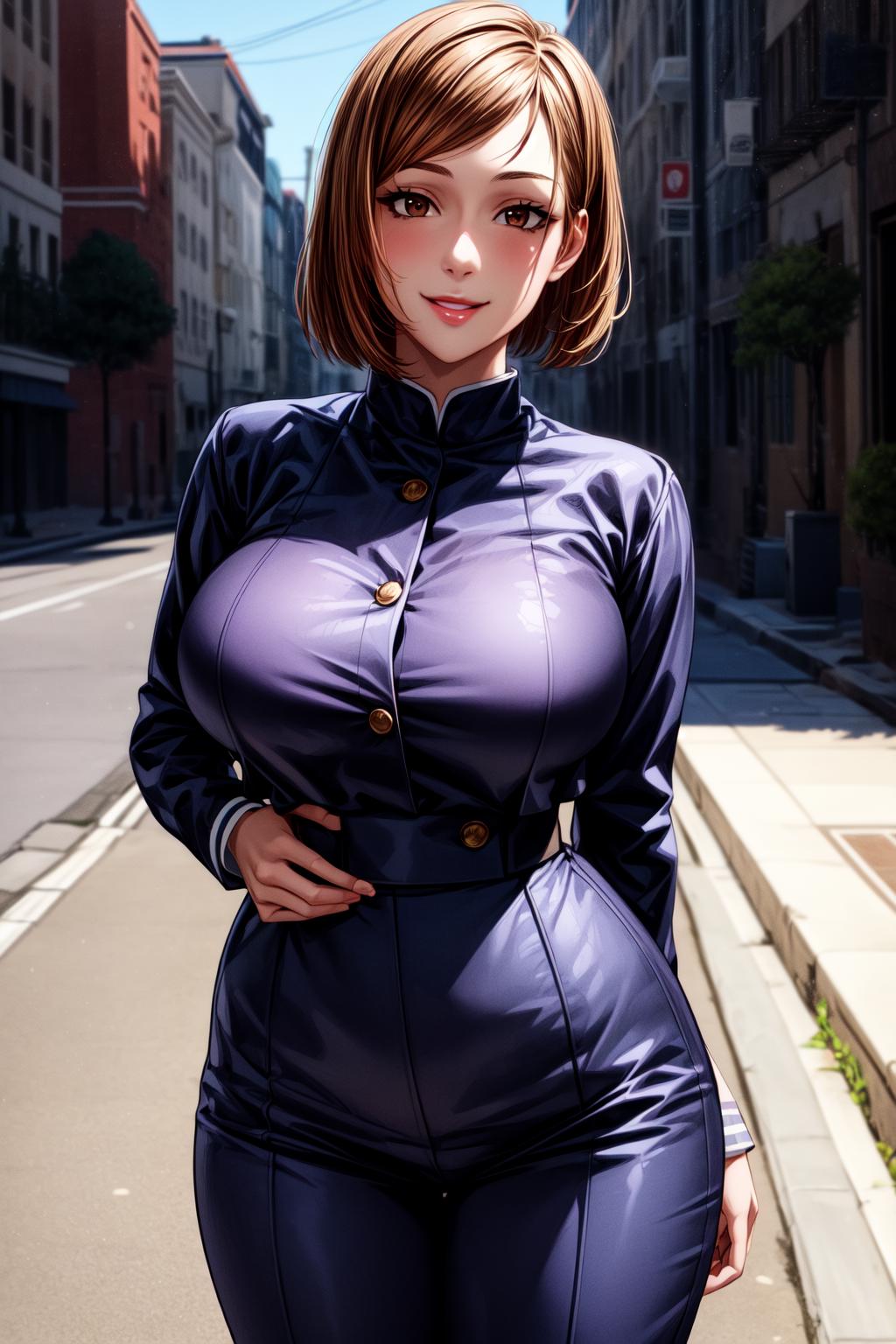 NobaraNDV, 1girl, large breasts, jujutsu uniform, looking at viewer, brown hair, short hair