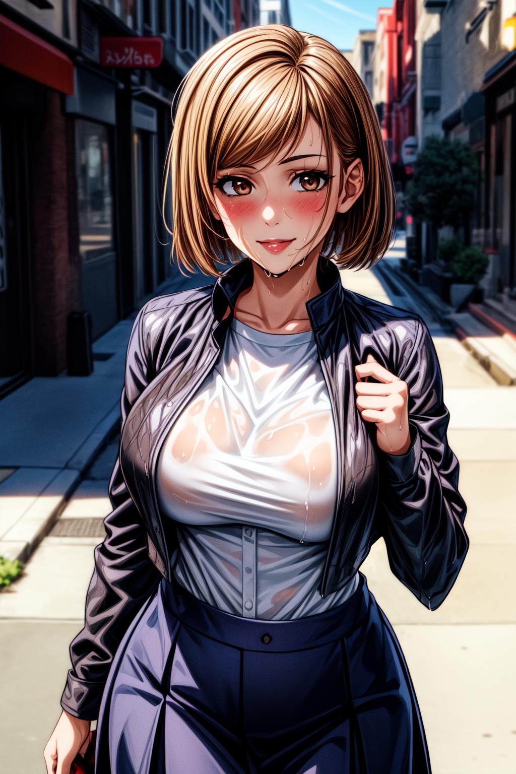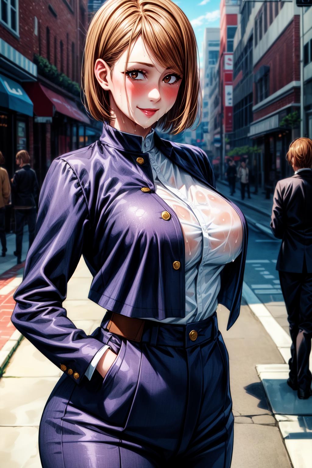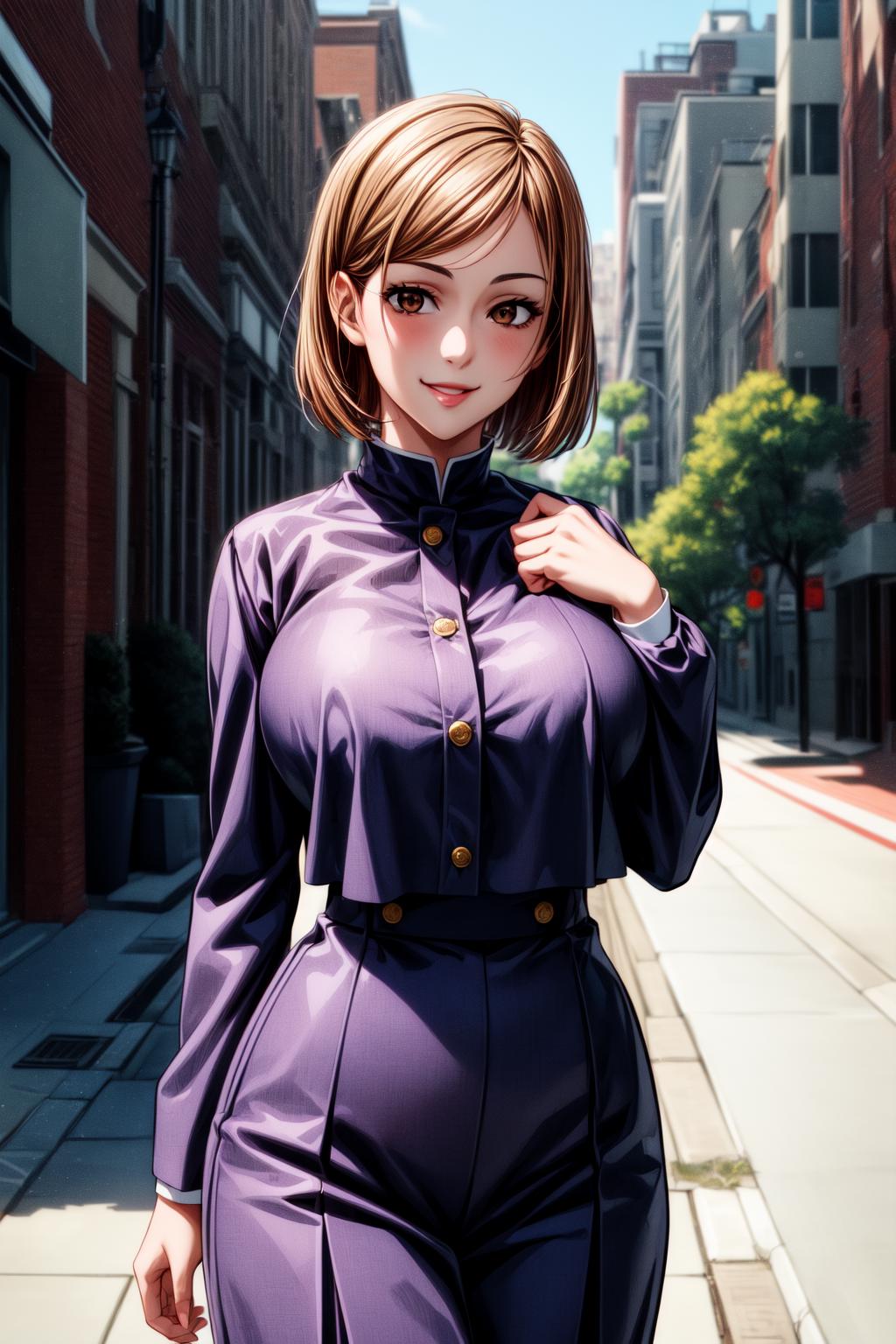 NobaraNDV, 1girl, large breasts, jujutsu uniform, looking at viewer, brown hair, short hair
