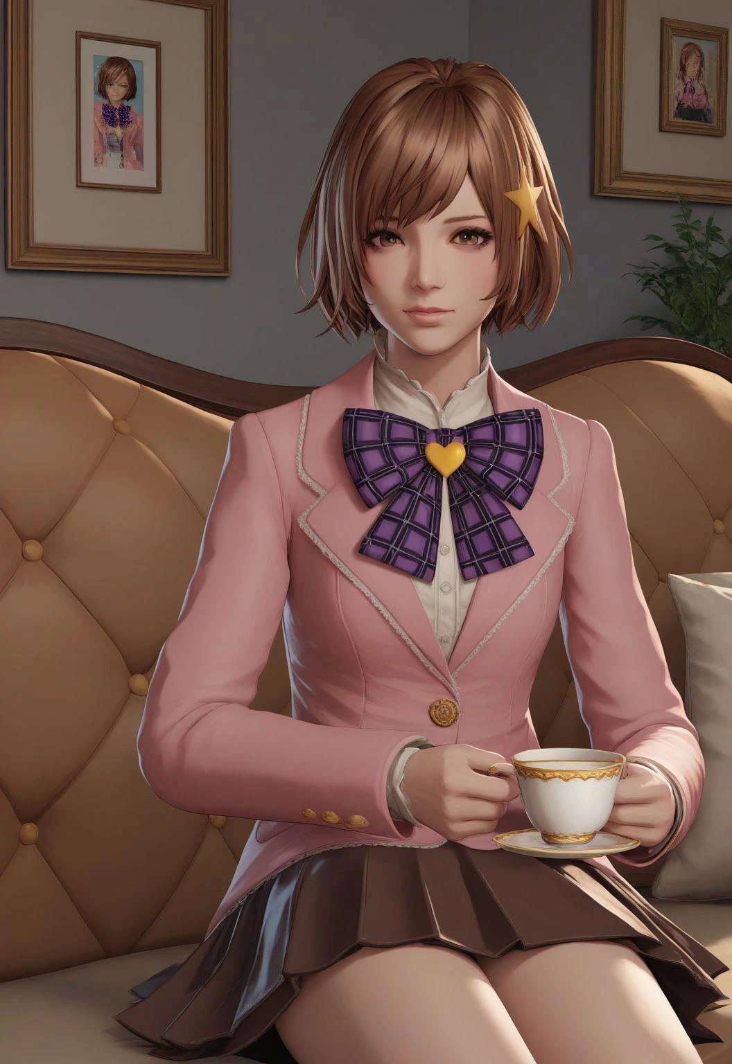 mikatakekawa, brown hair, (star hairpin:0.7), pink blazer, brown skirt, laced trim, purple plaid bowtie with a yellow heart, brown eyes,