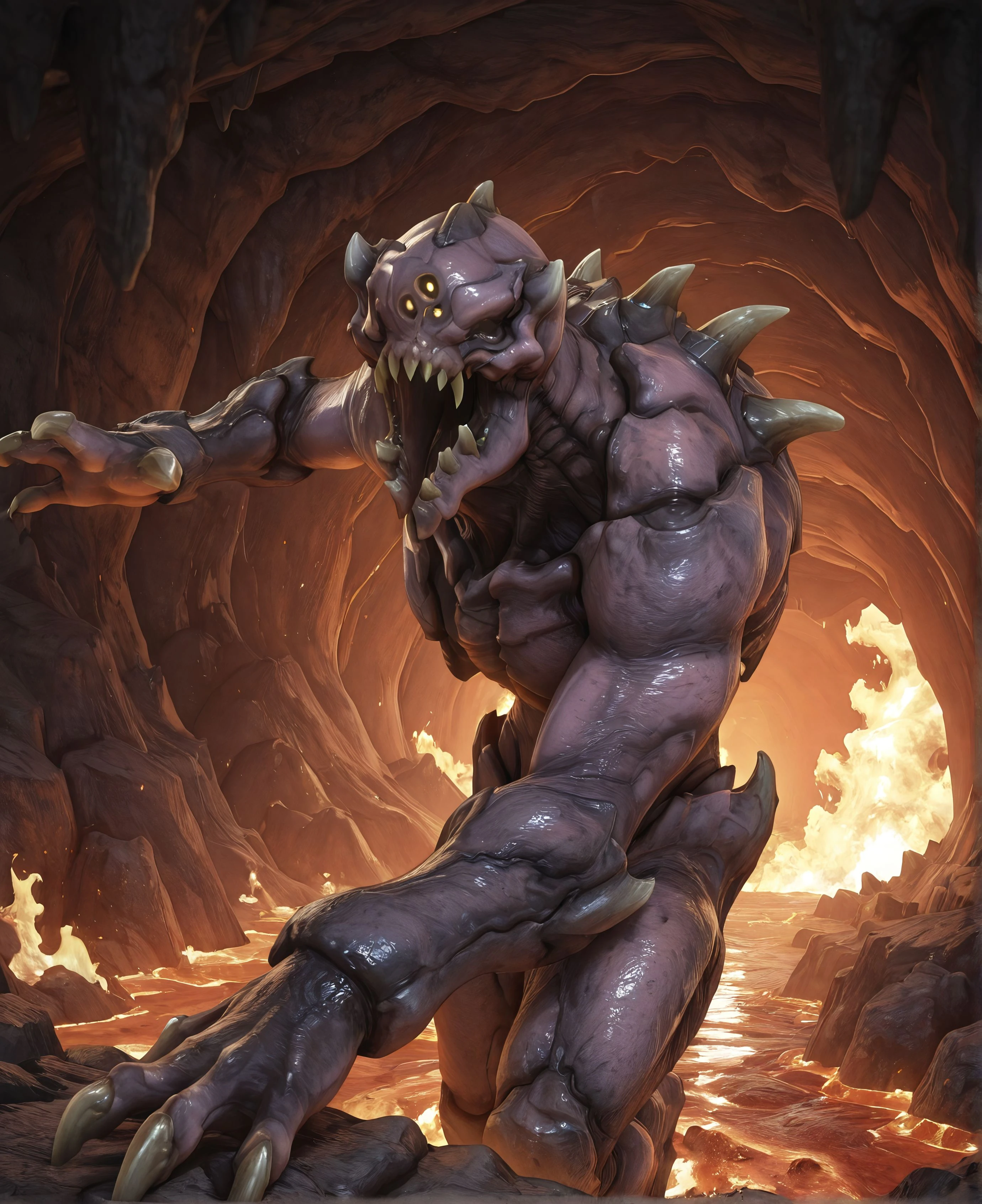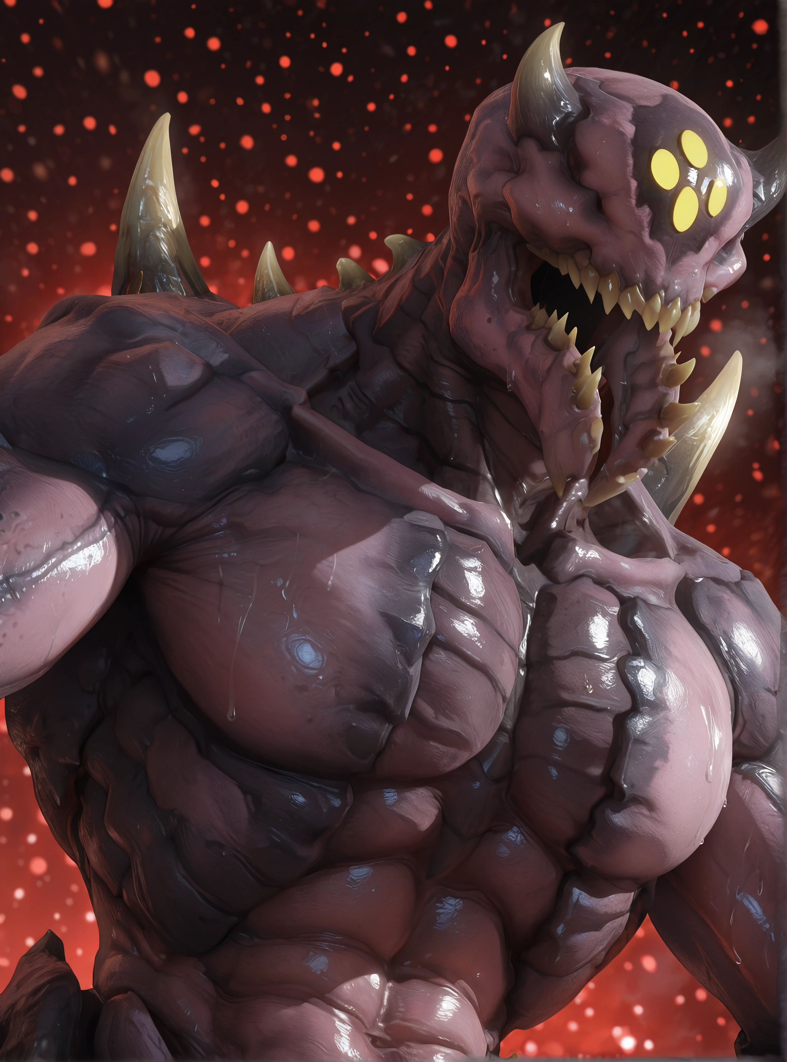 Tags: prowler, demon, doom, horror, horror (theme), monster, bones, claws, spikes, glowing eyes, split jaw, sharp teeth, pink skin, shiny skin, exoskeleton, segmented body, shoulder spikes, four fingers, three eyes, extra eyes, etc...