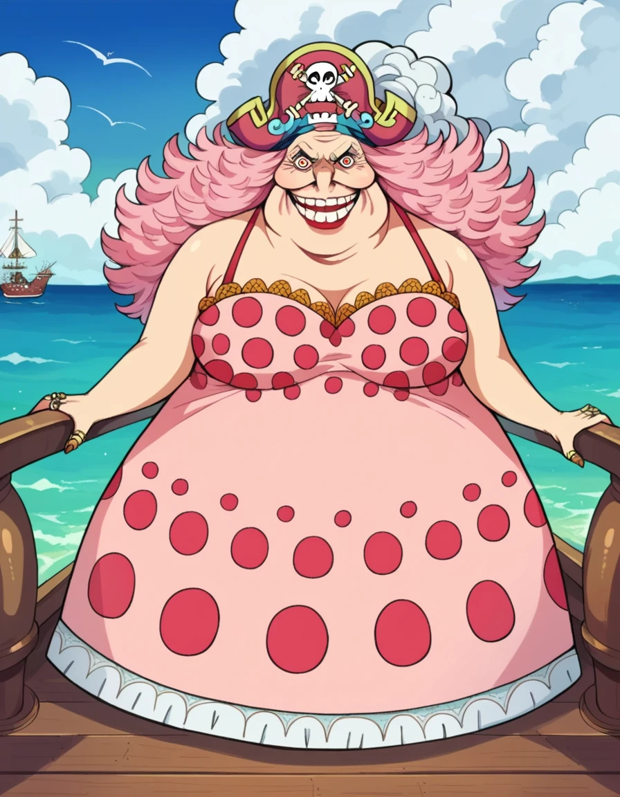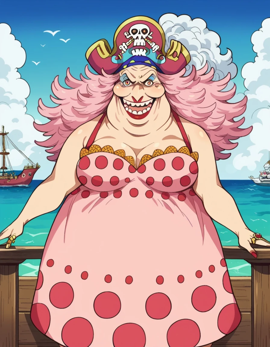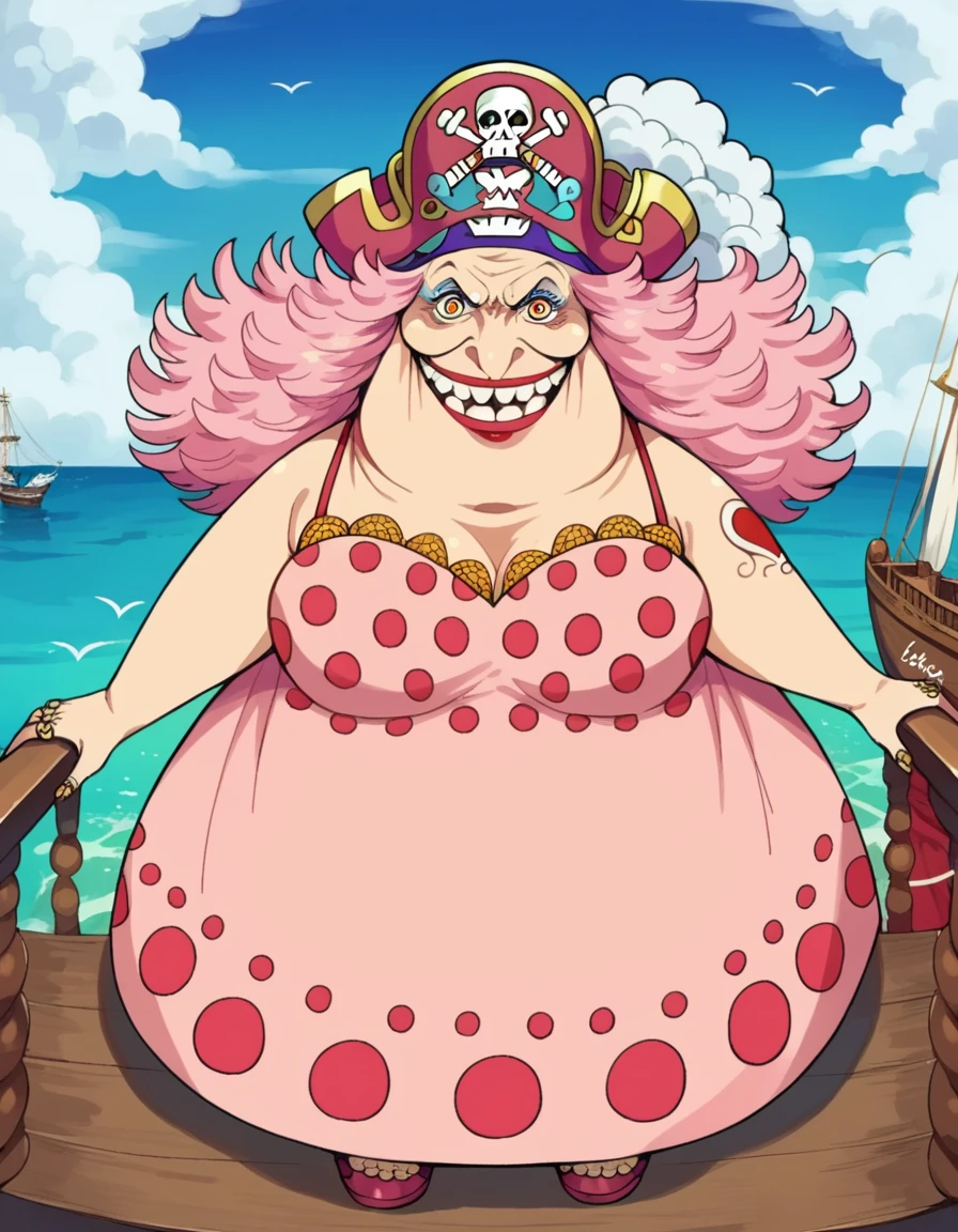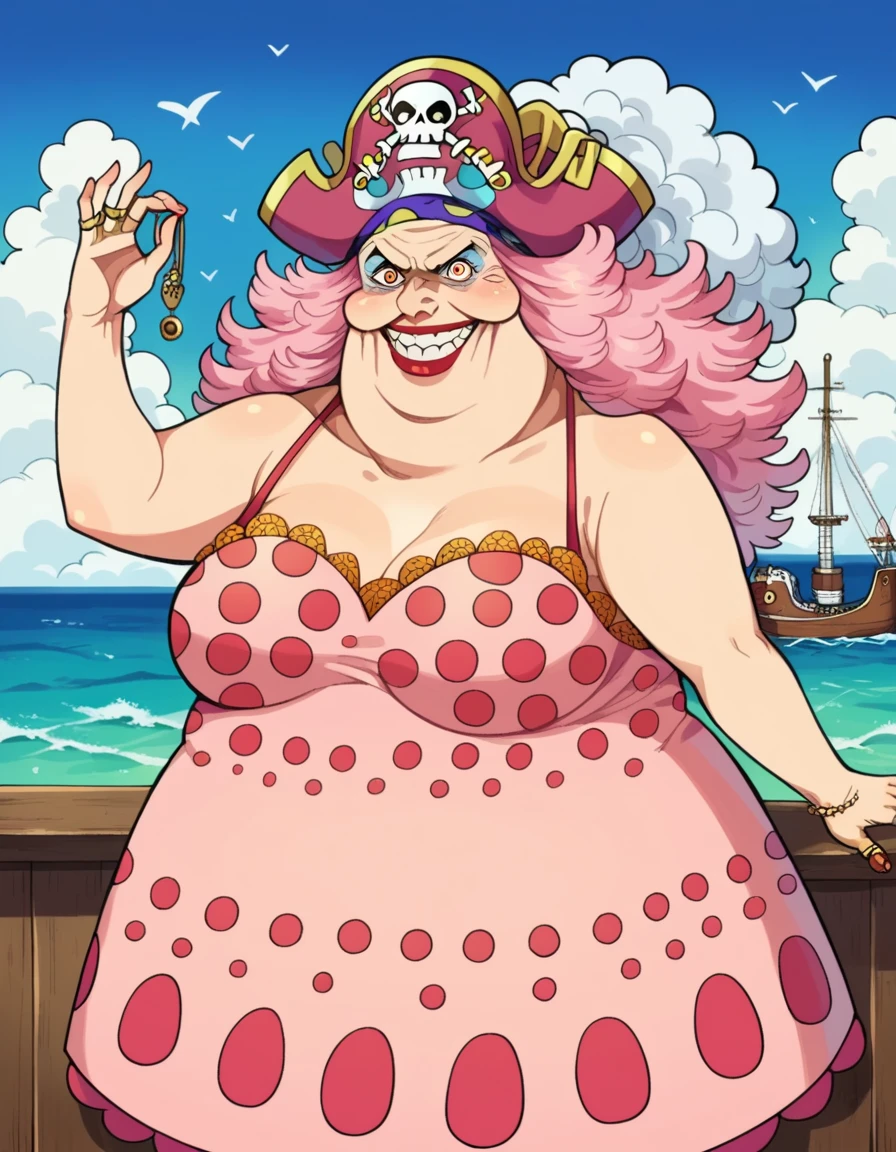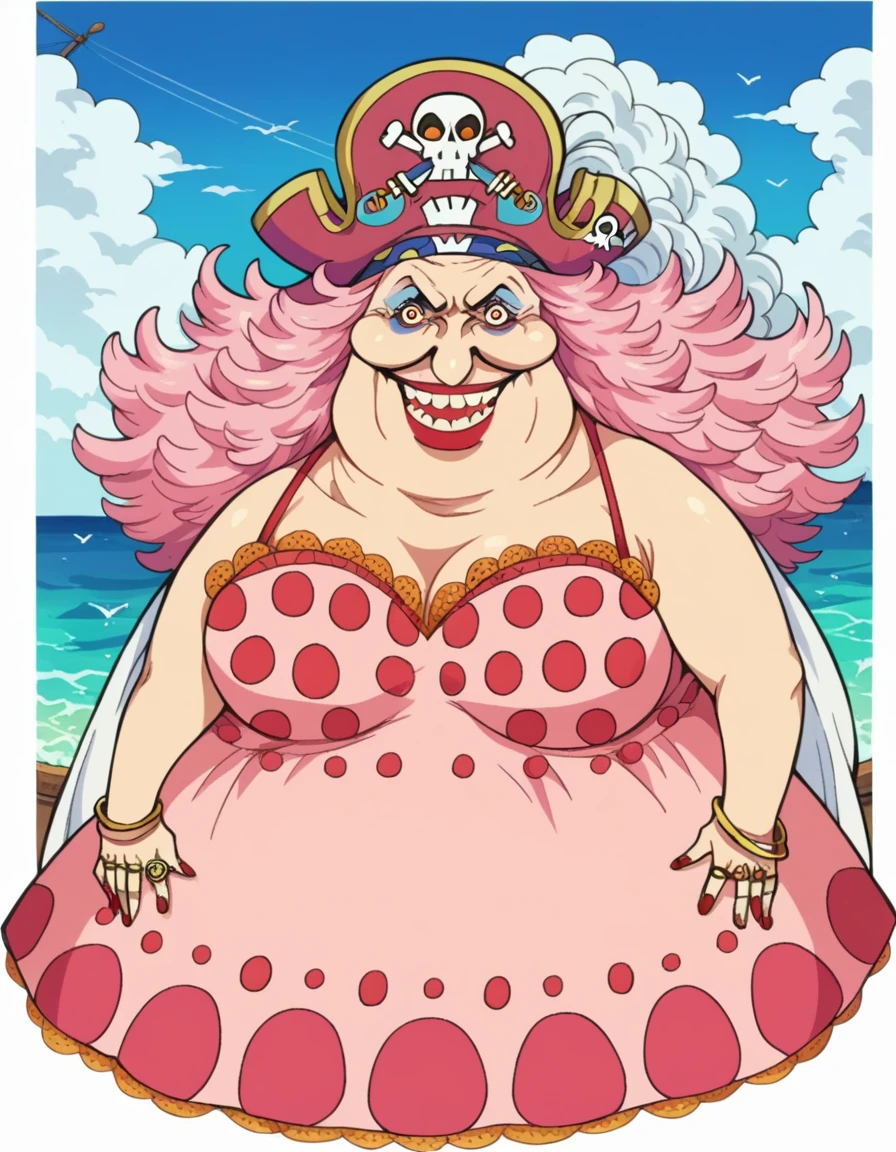 linlin charlotte, pink hair, orange eyes, fat, giant, lipstick, makeup,