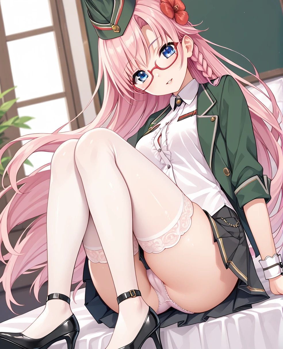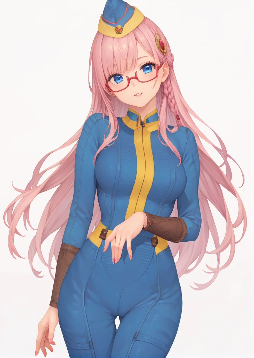 fnp-9, pink hair, blue eyes, hat, hair ornament, red glasses, long hair