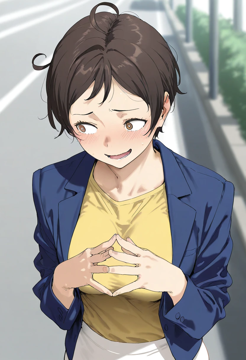 1girl,michimiya_yui,ahoge,brown hair,very short hair,brown eyes,
