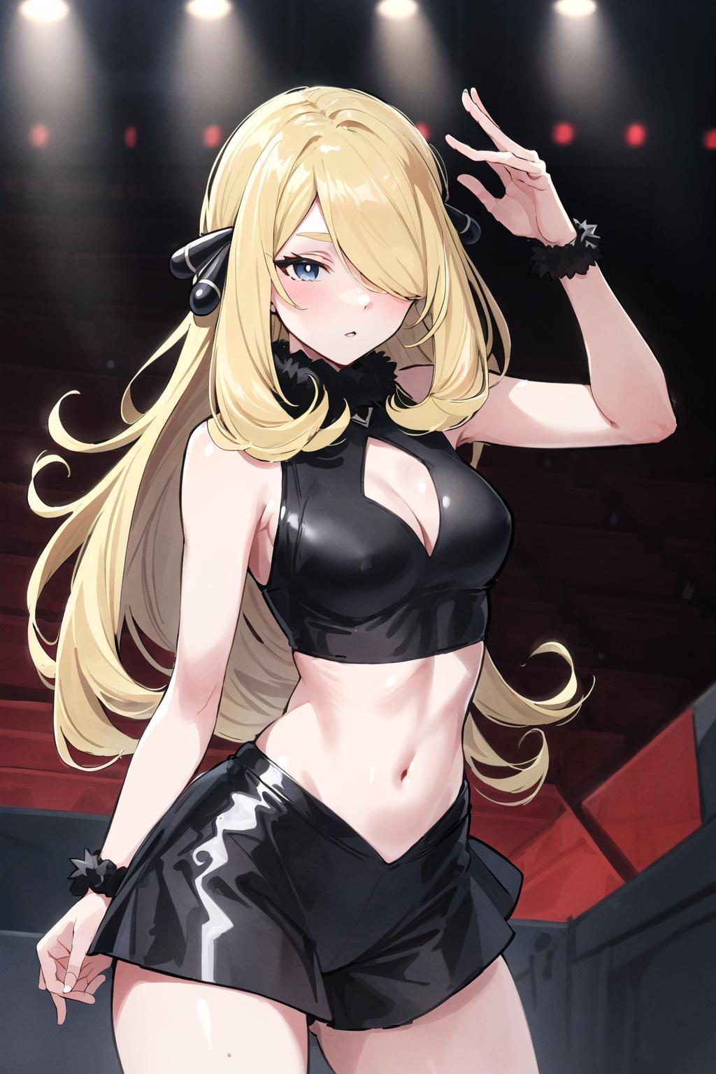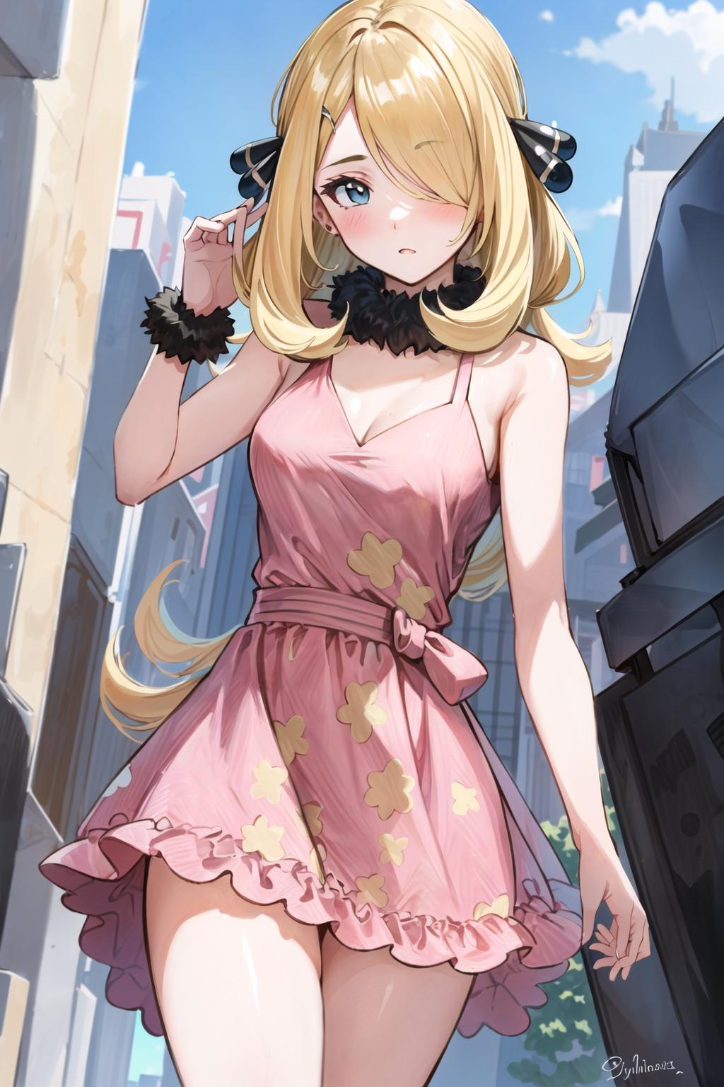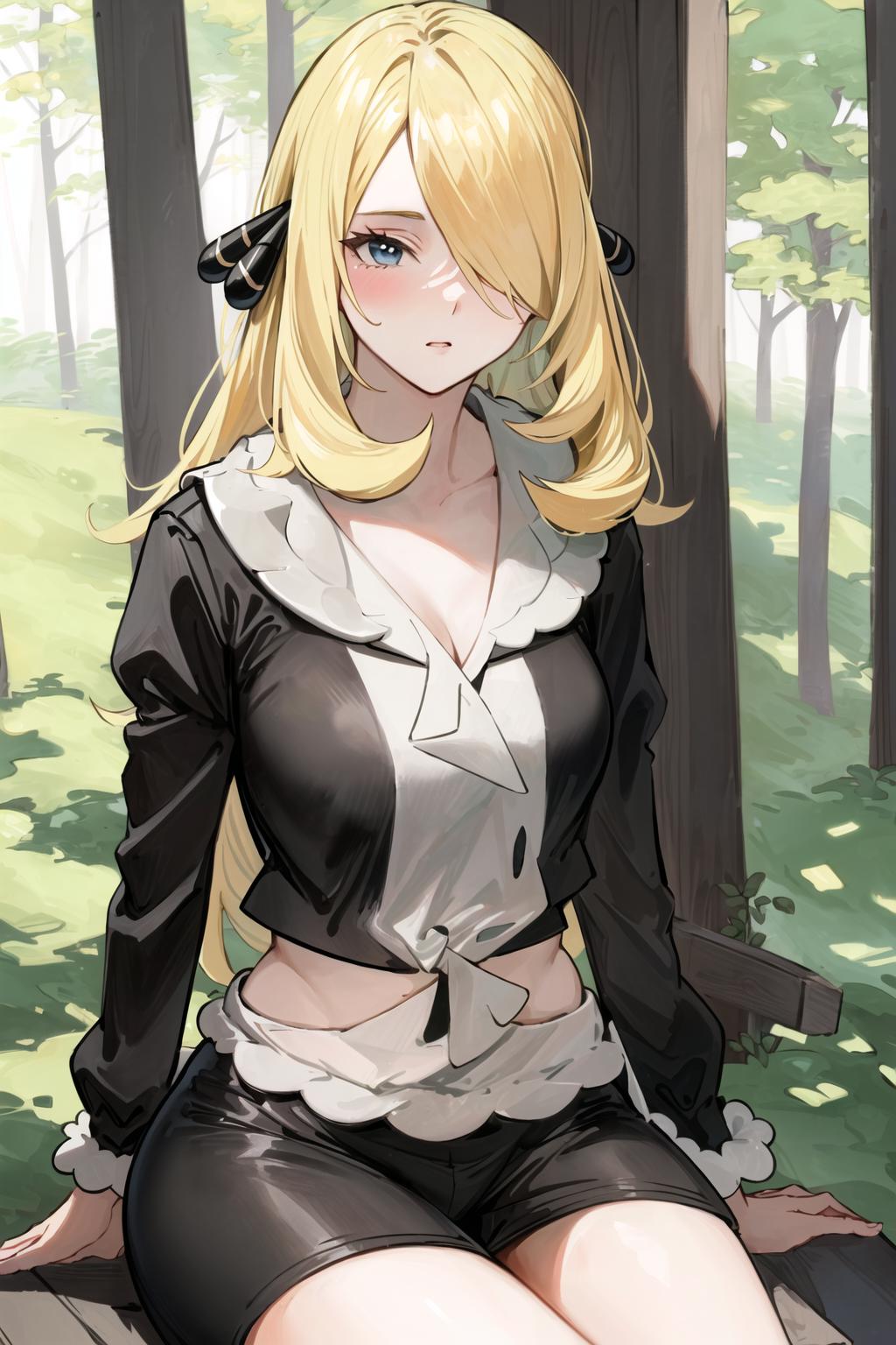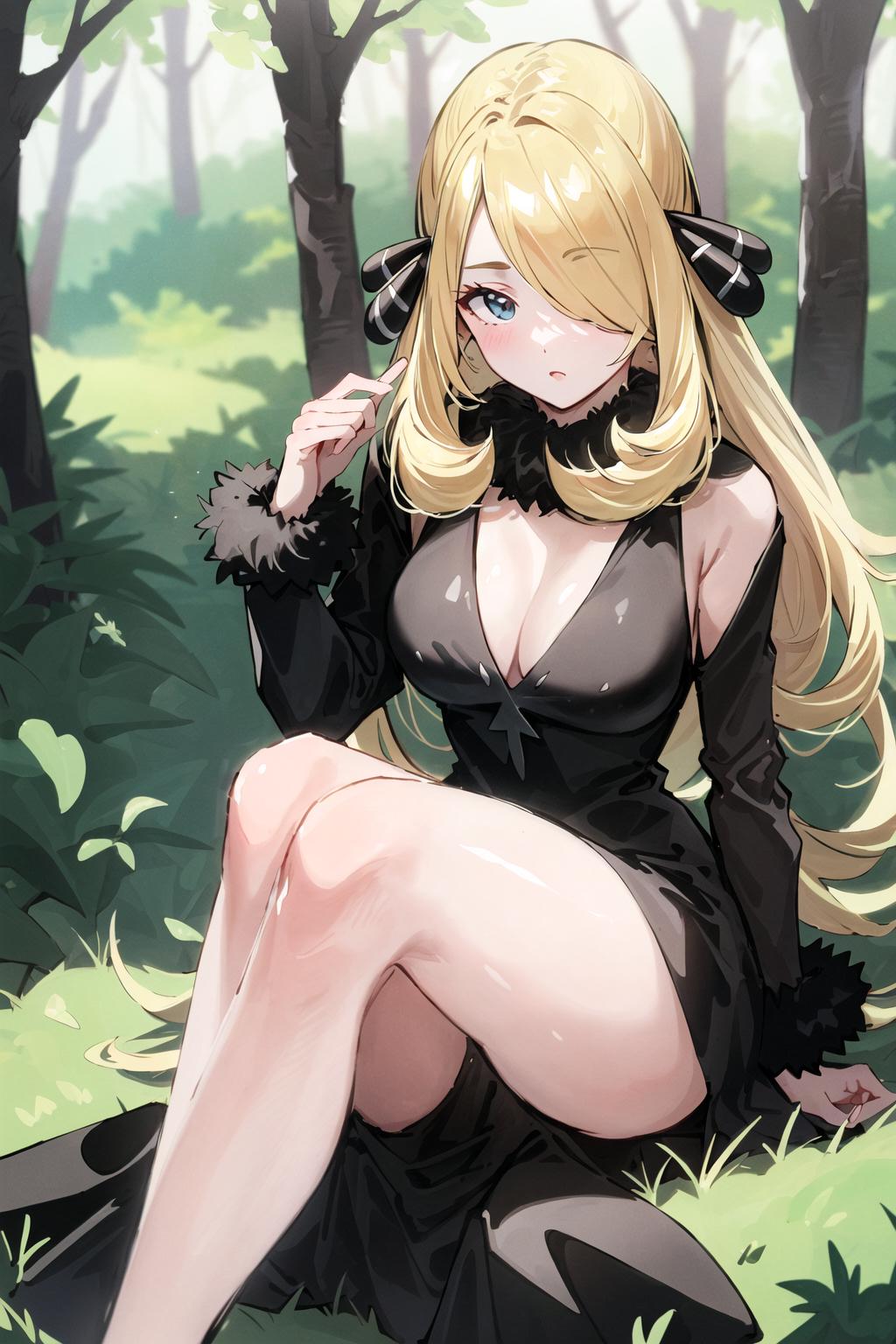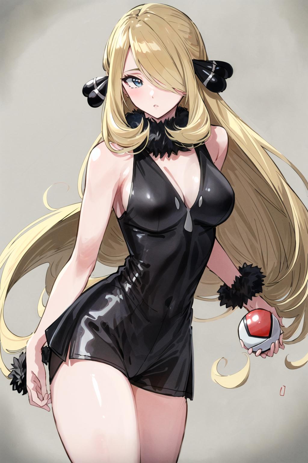 To trigger the model you must use: "cynthia (pokemon), blonde hair, hair over one eye, hair ornament"